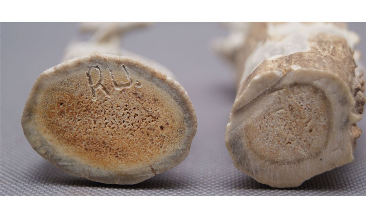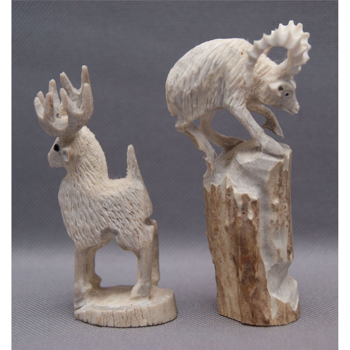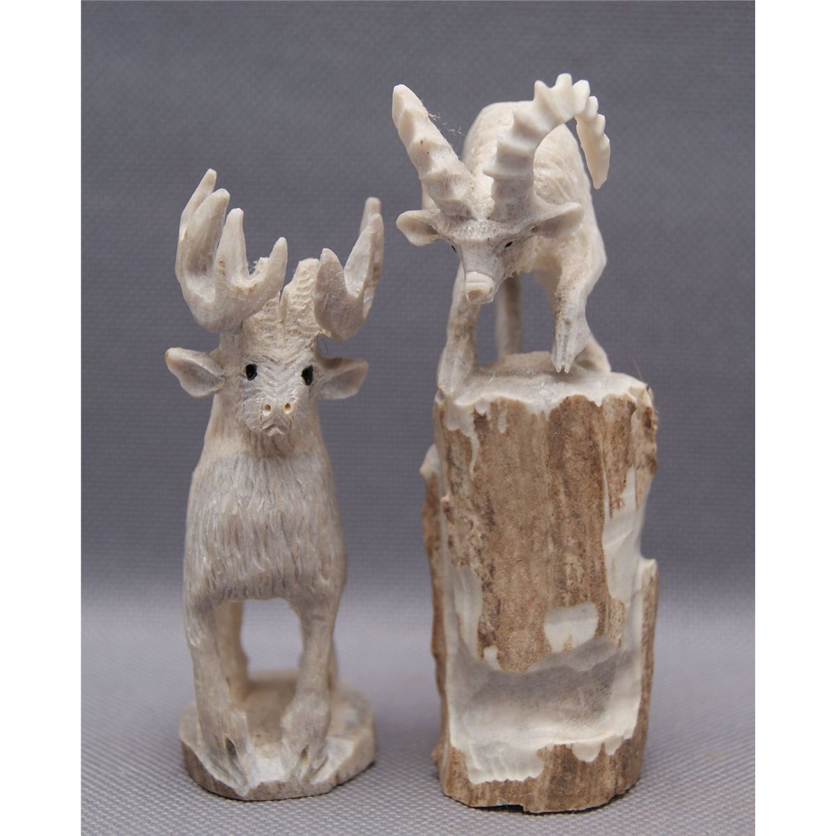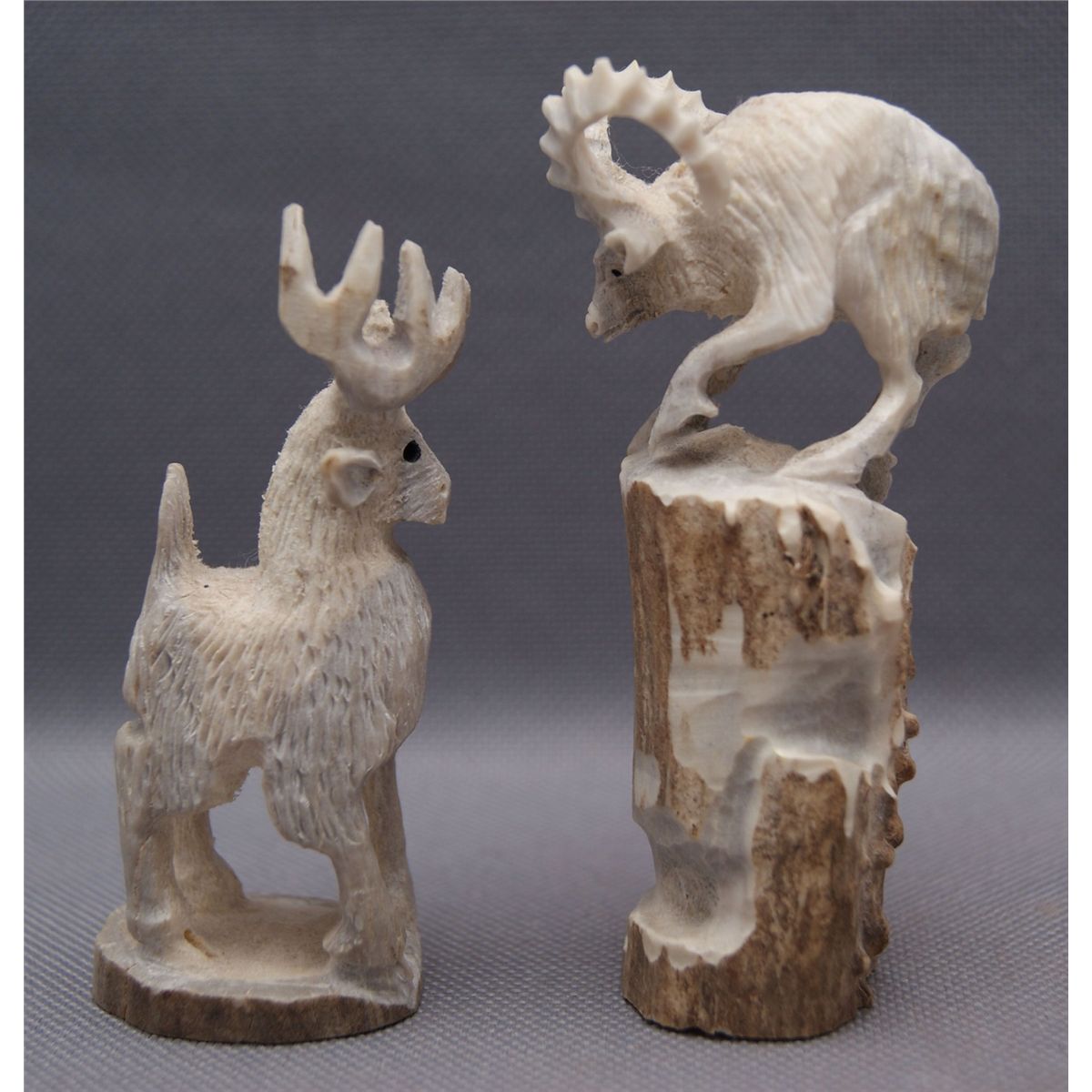 1980s 90s big horn sheep carved from antler 3.25" x 1.5", deer carved from antler signed RU, 2.75" x 1"
