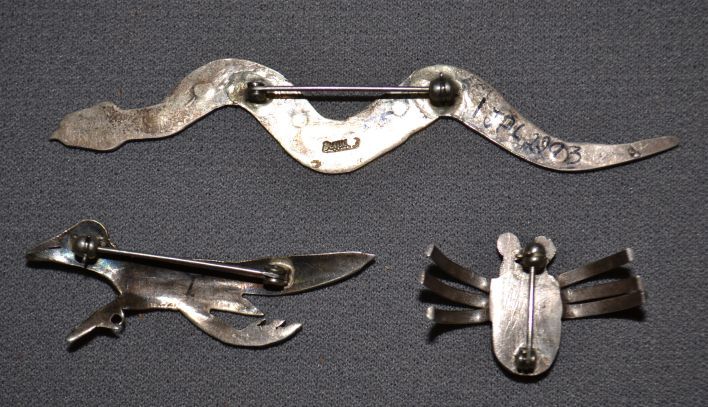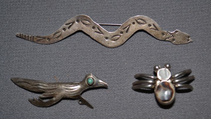 1970s 90s sterling silver roadrunner has turquoise eye .75" x 2" snake hand stamped design .5" x 3.75" spider .75" x 1.25"