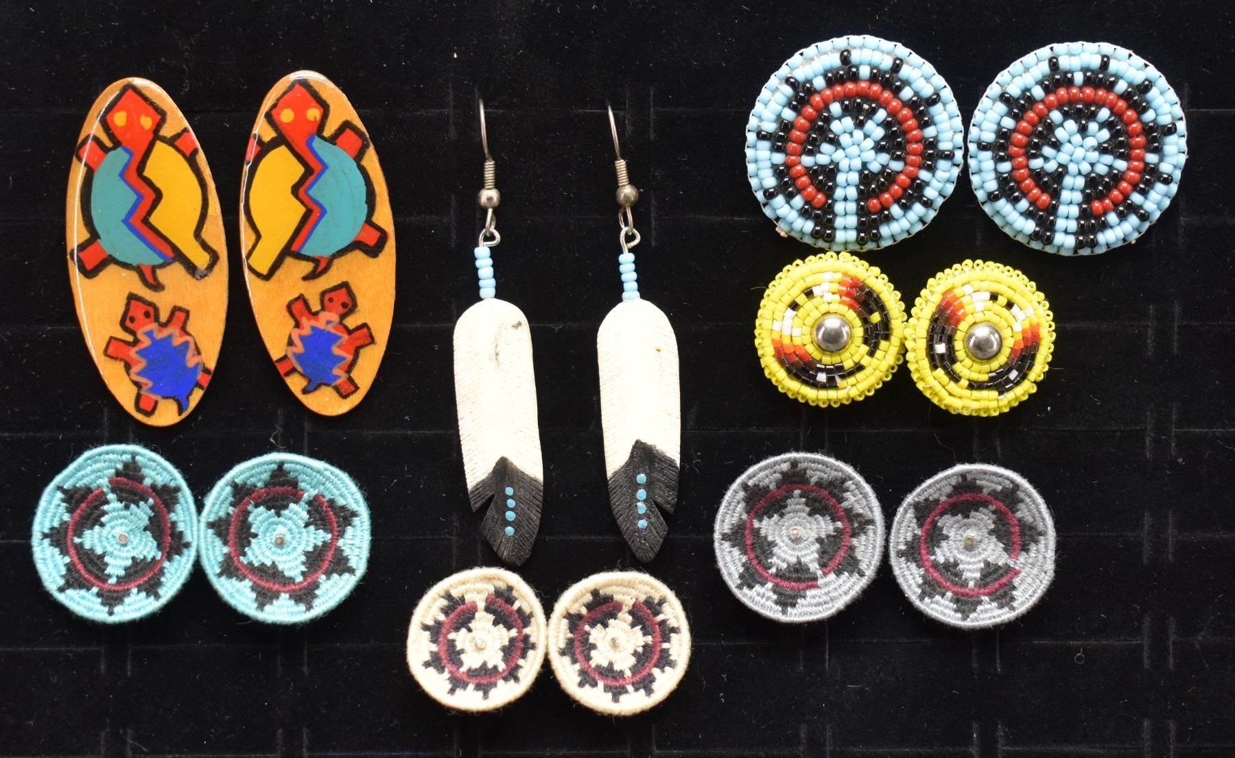 7 sets of southwest earrings Depicting baskets, feathers and turtles. Largest 2" x 7.5"