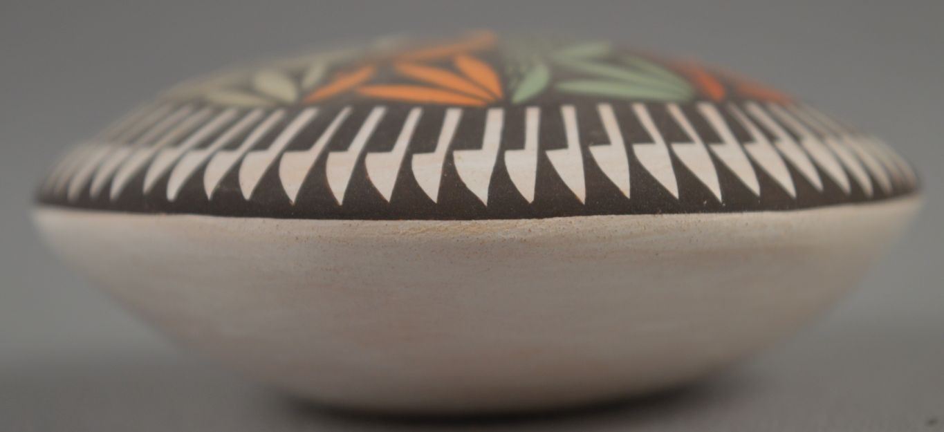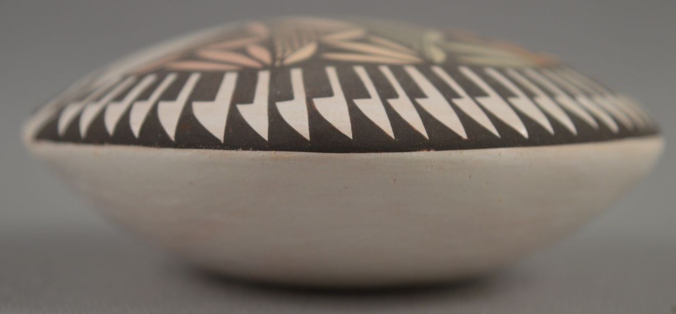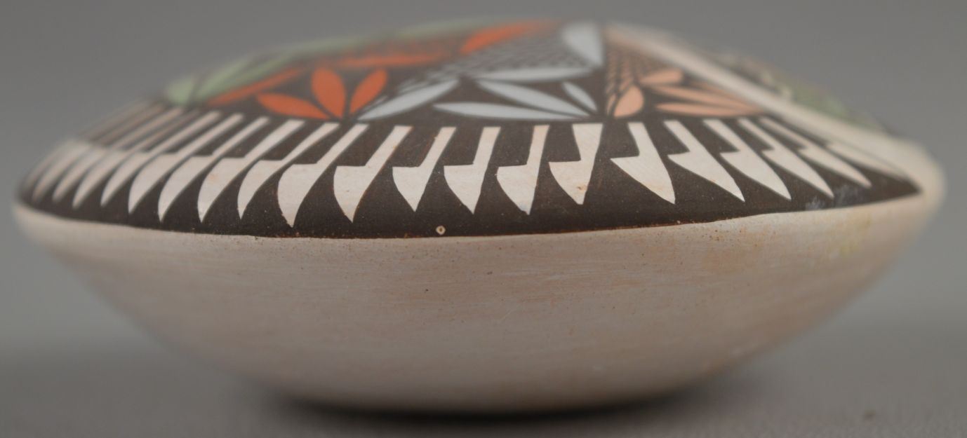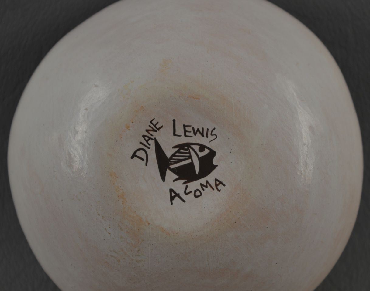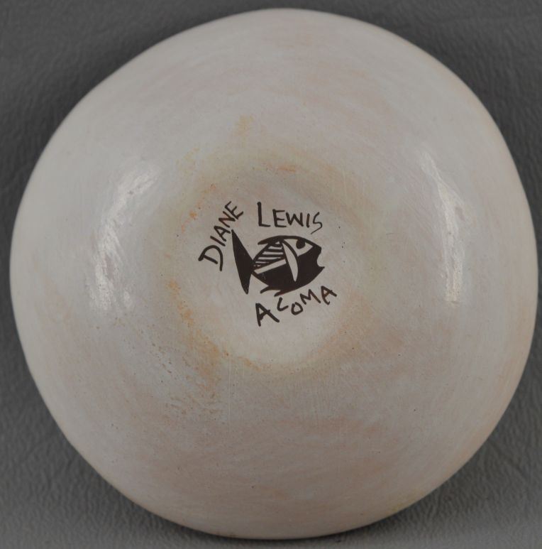 2000's Acoma Indian. Hand coiled and polychrome painted design pottery seed jar , signed Diane Lewis. 1.25'' x 2.75''