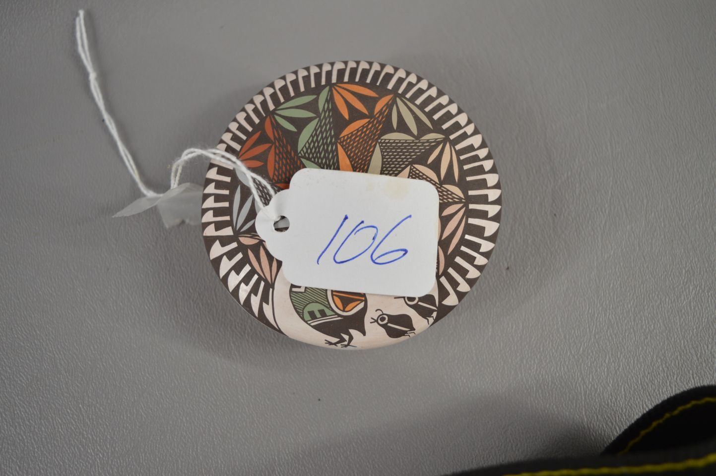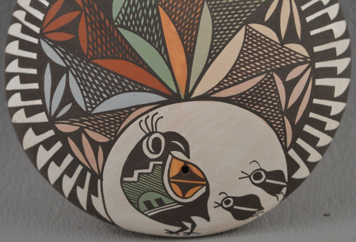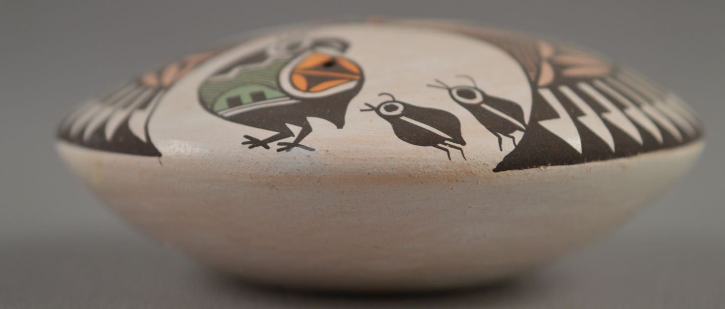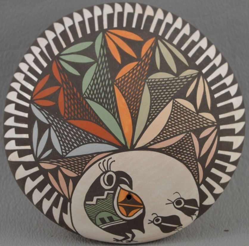 2000's Acoma Indian. Hand coiled and polychrome painted design pottery seed jar , signed Diane Lewis. 1.25'' x 2.75''