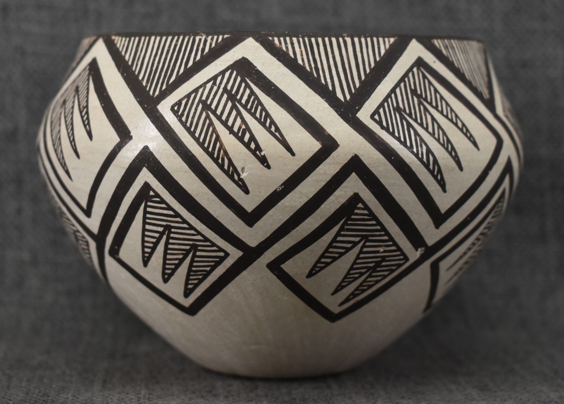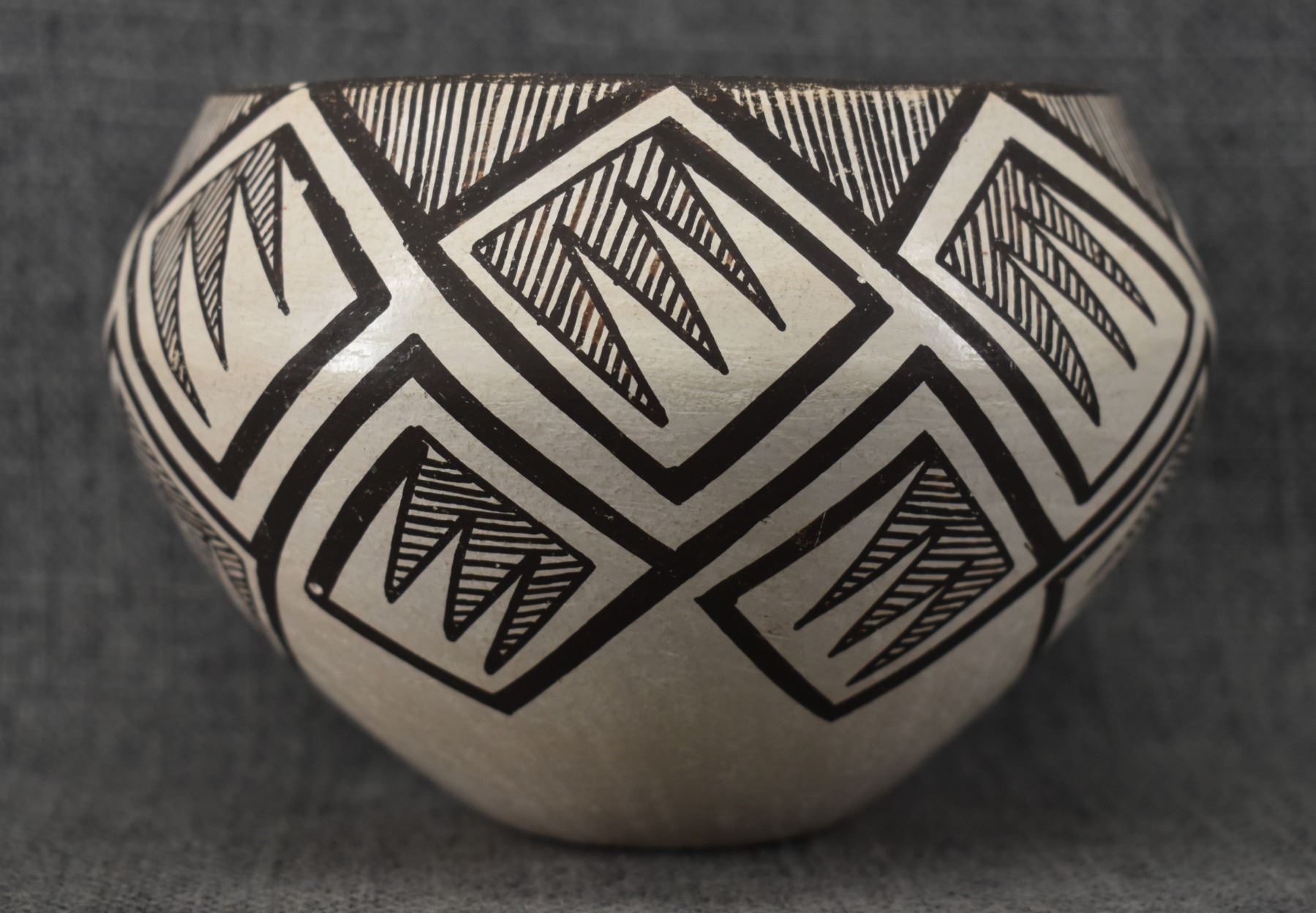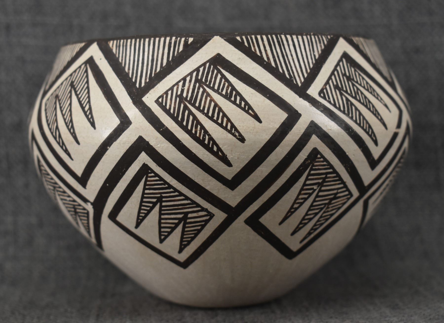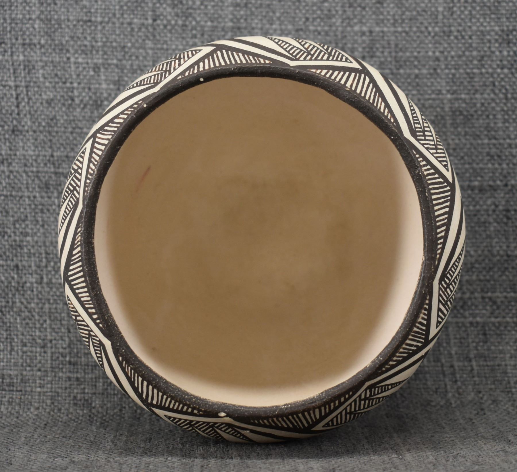 1970's Acoma, hand coiled with black on white painted design by Jessie Garcia, 3.75" x 5.5"