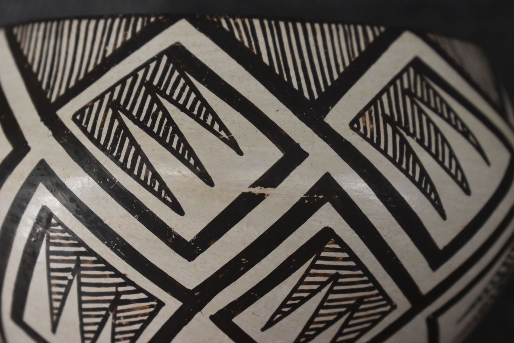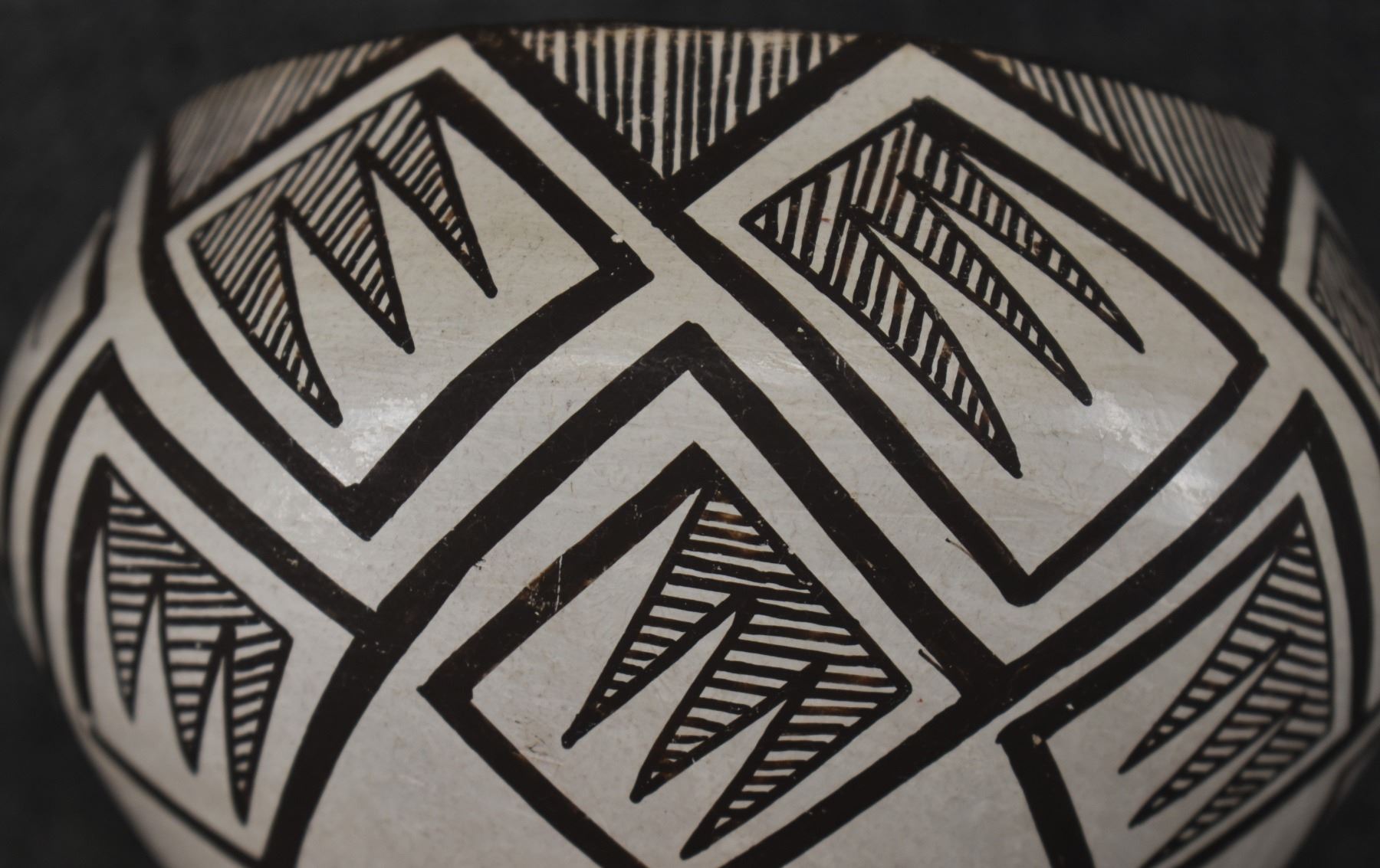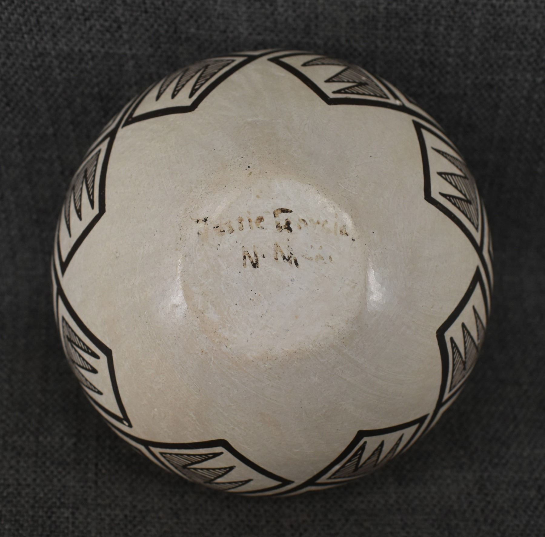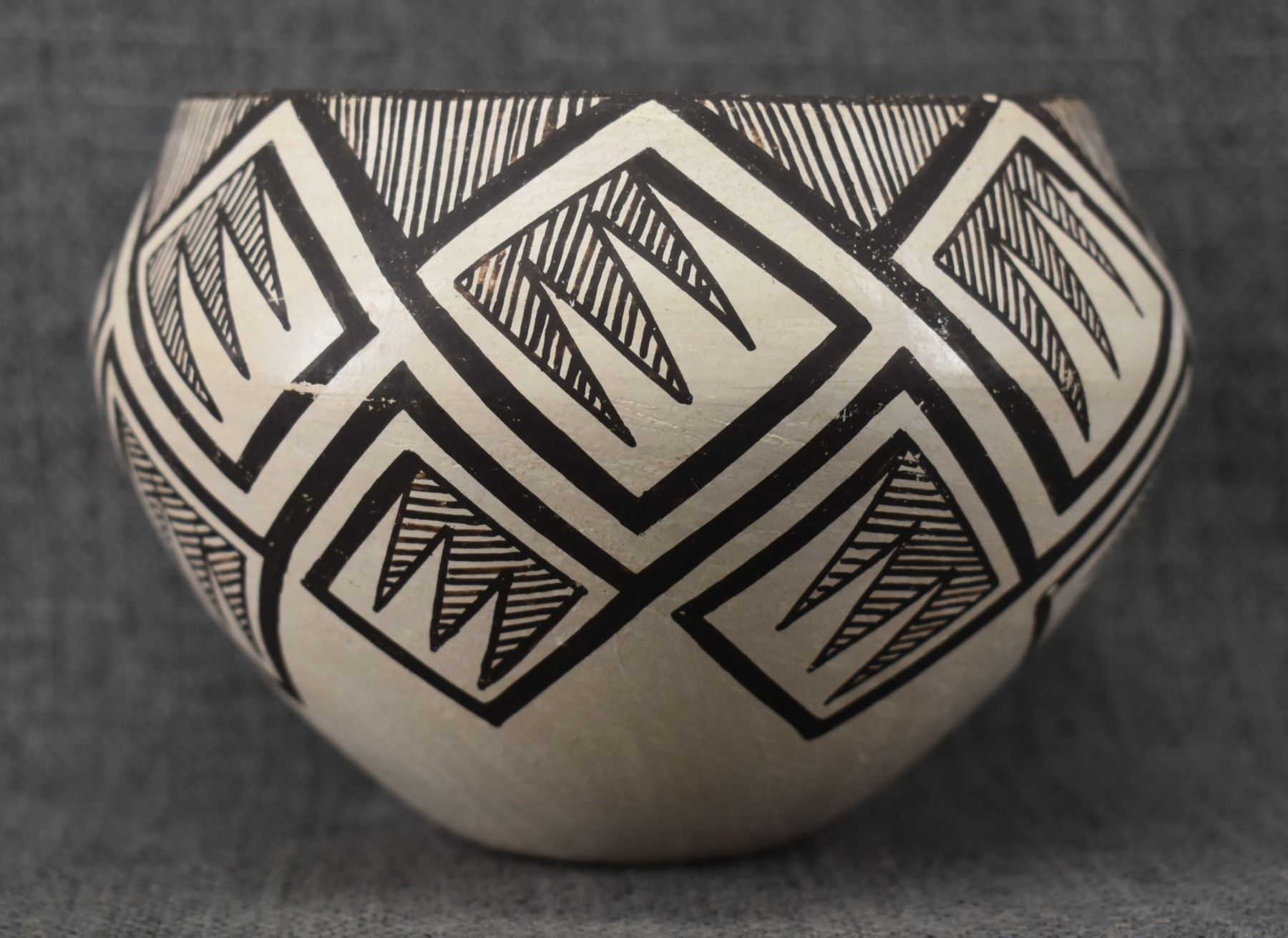 1970's Acoma, hand coiled with black on white painted design by Jessie Garcia, 3.75" x 5.5"