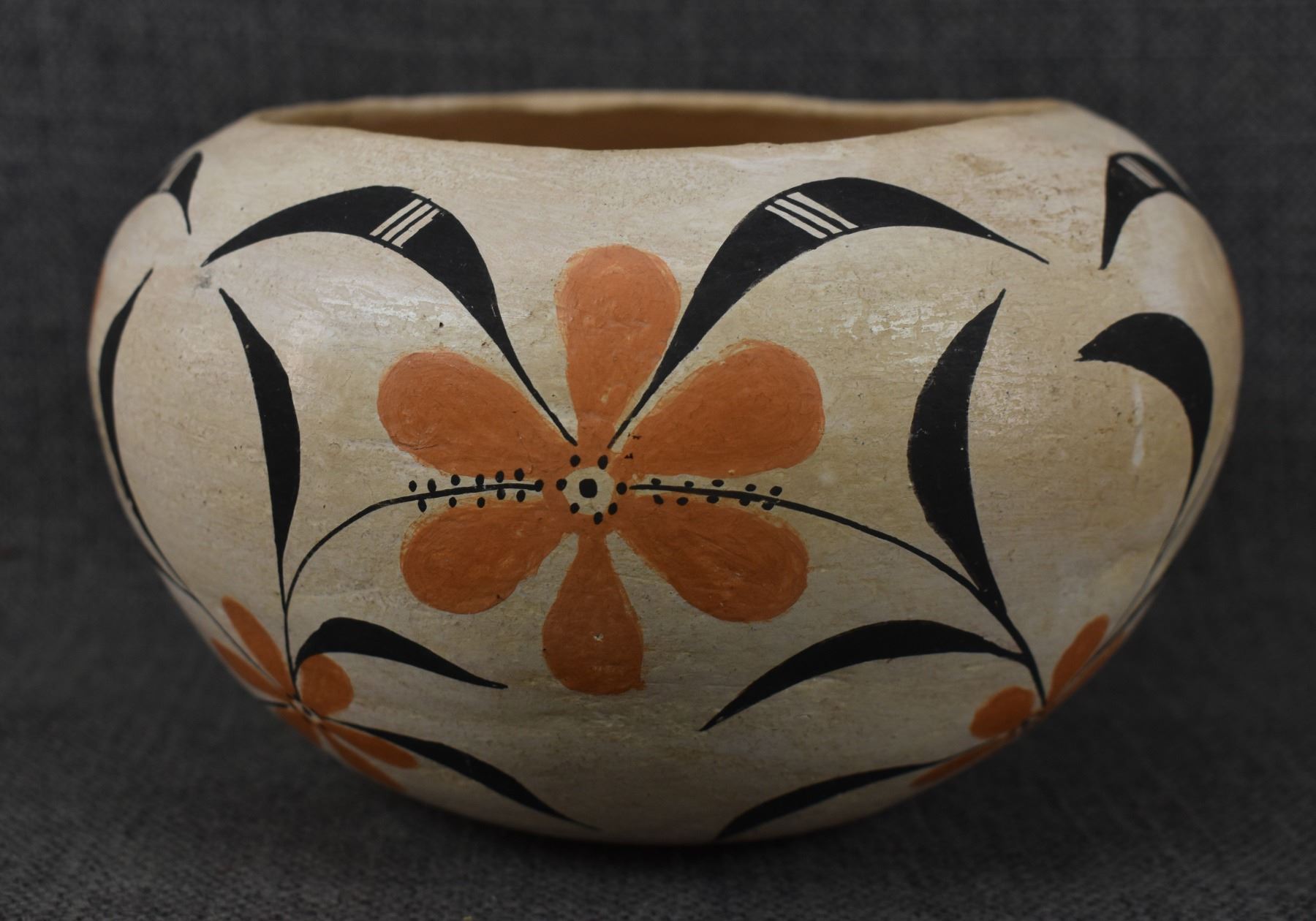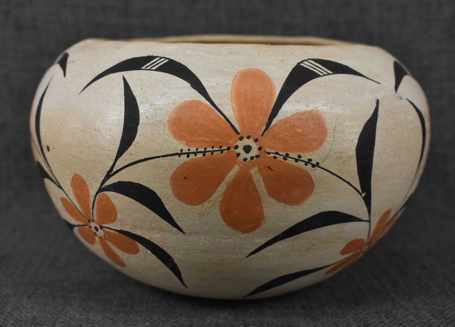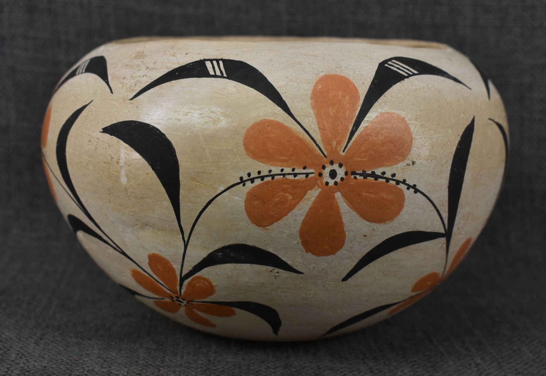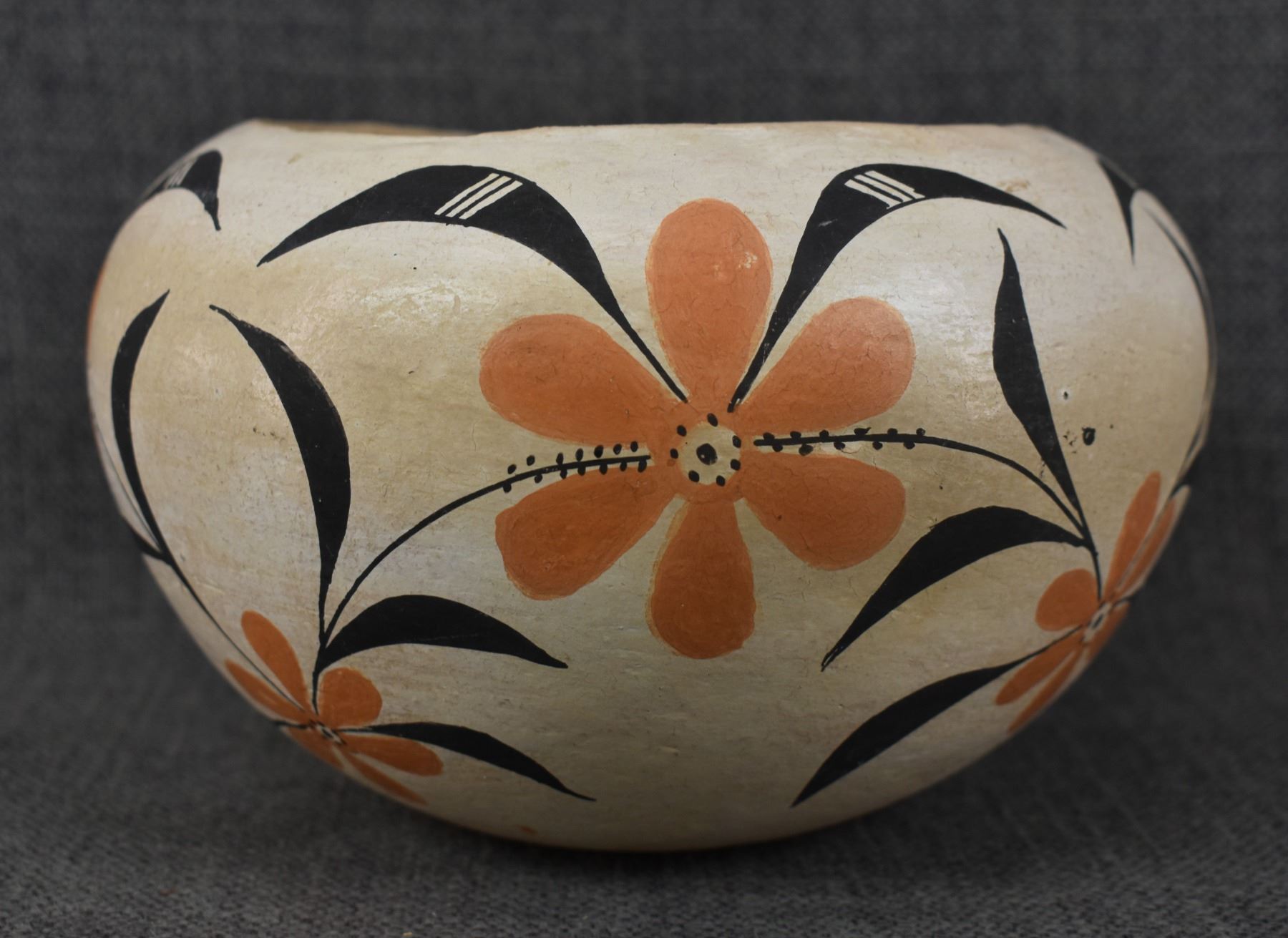 1950's Acoma, hand coiled with polychrome painted floral design, 4.25" x 6.75" has crack.