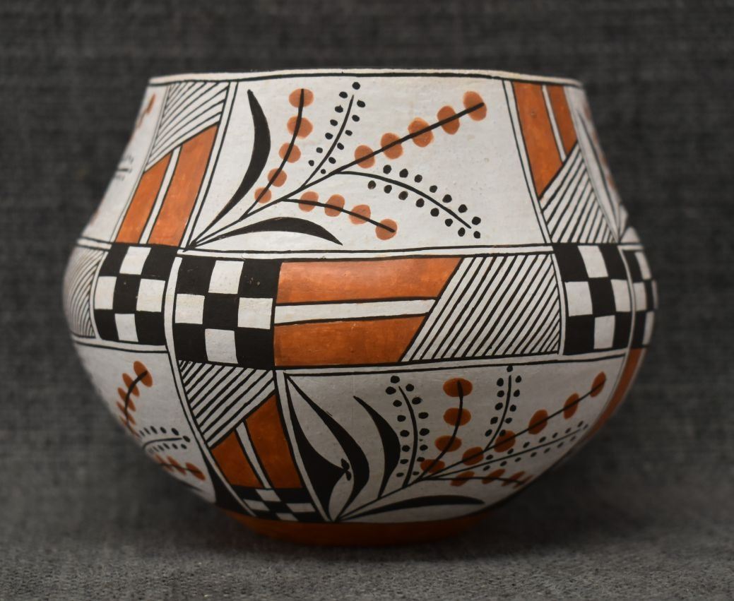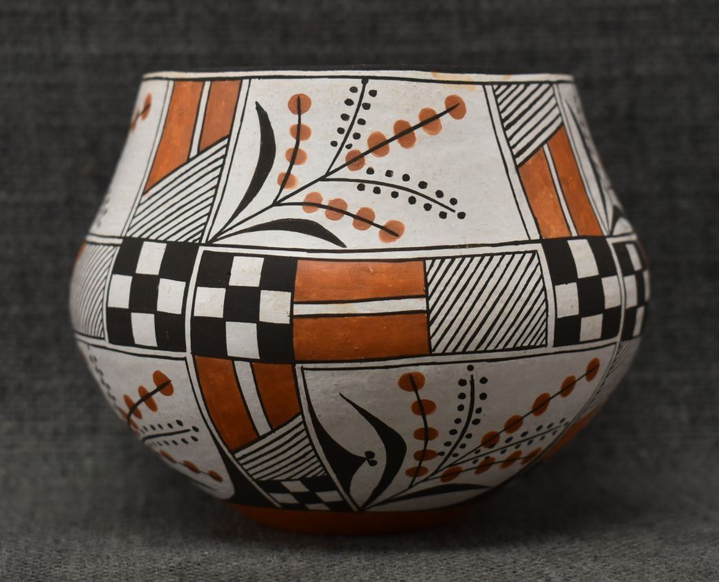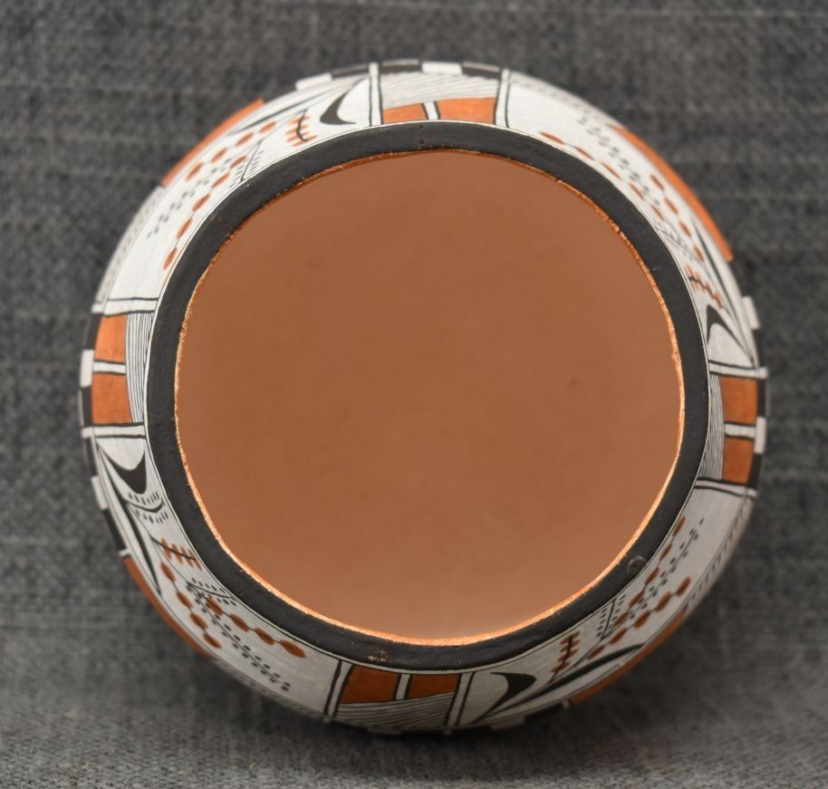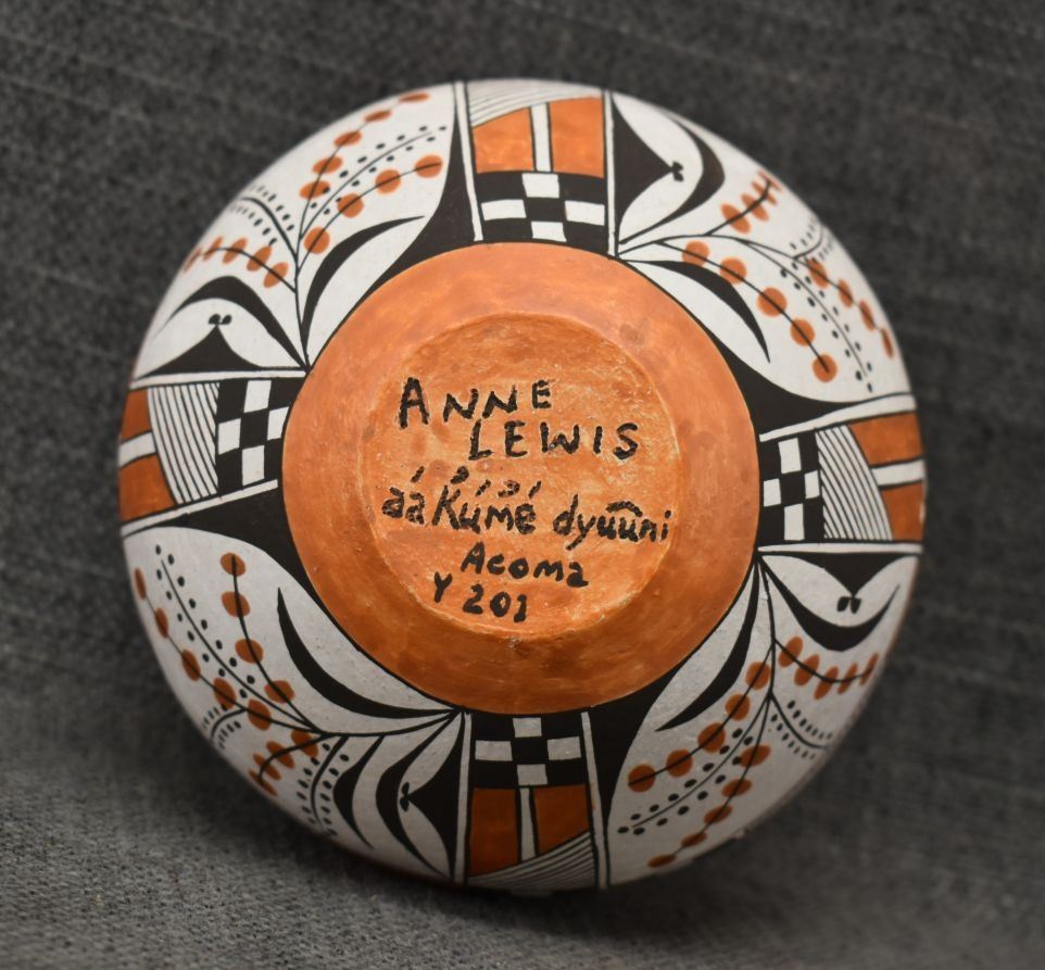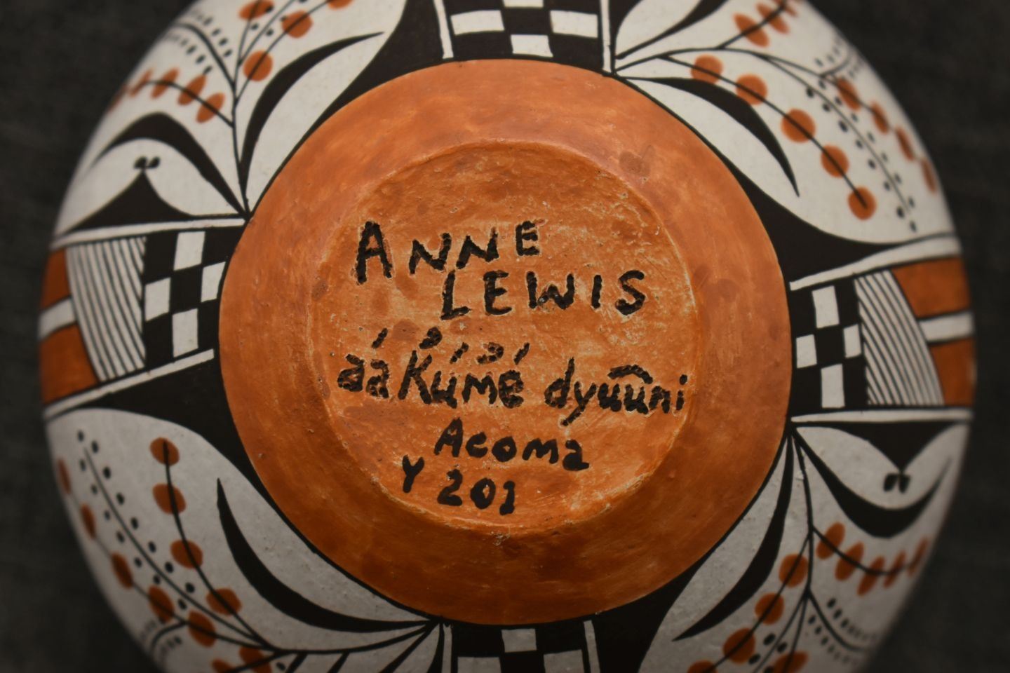 2000's Acoma, hand coiled with polychrome painted floral and geometric design by Anne Lewis "aaKume dyuuni" 3.5" x 4.25"