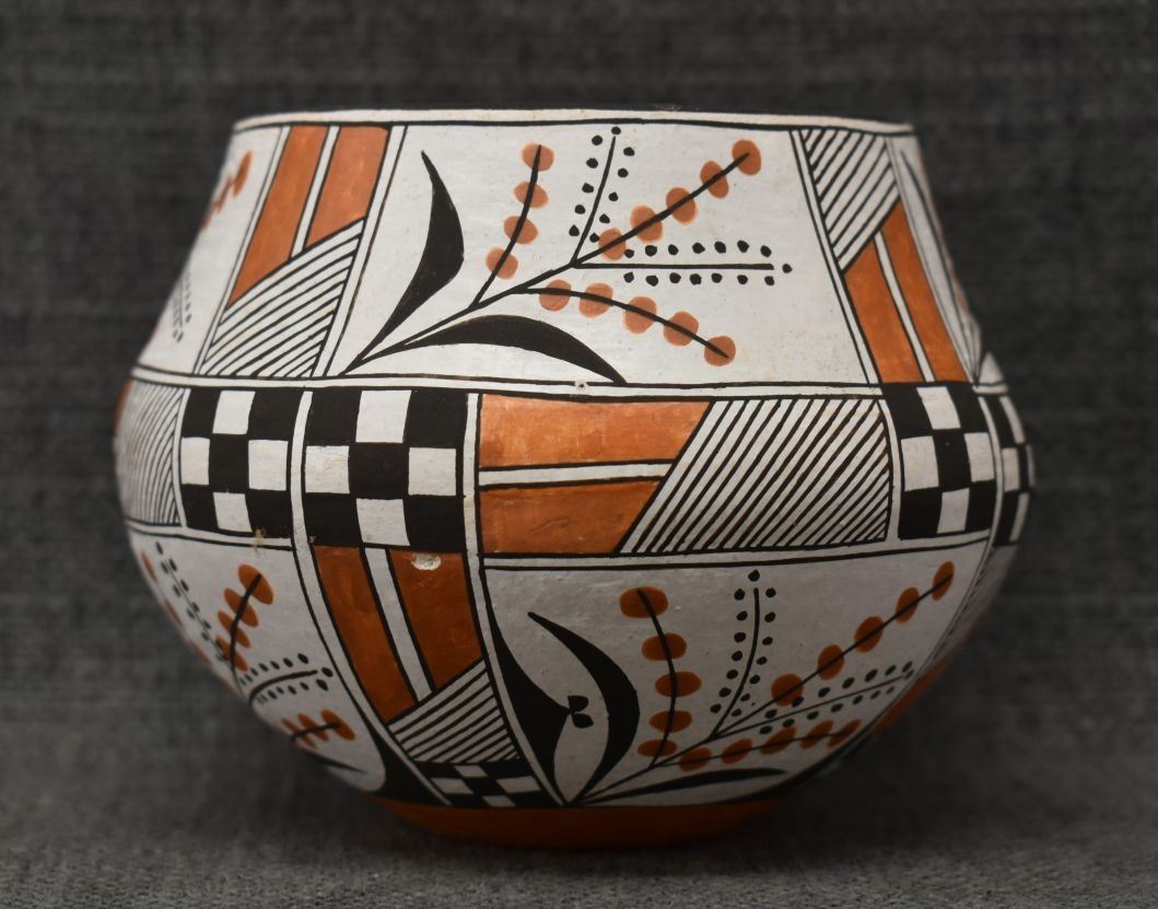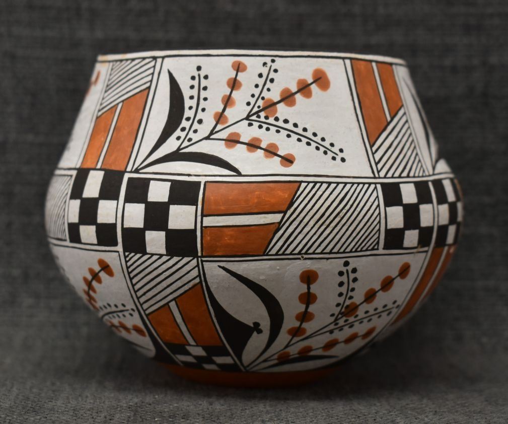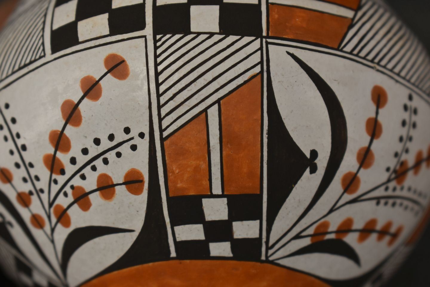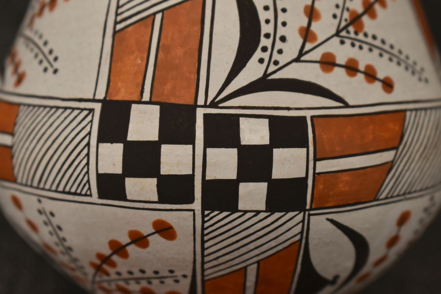2000's Acoma, hand coiled with polychrome painted floral and geometric design by Anne Lewis "aaKume dyuuni" 3.5" x 4.25"