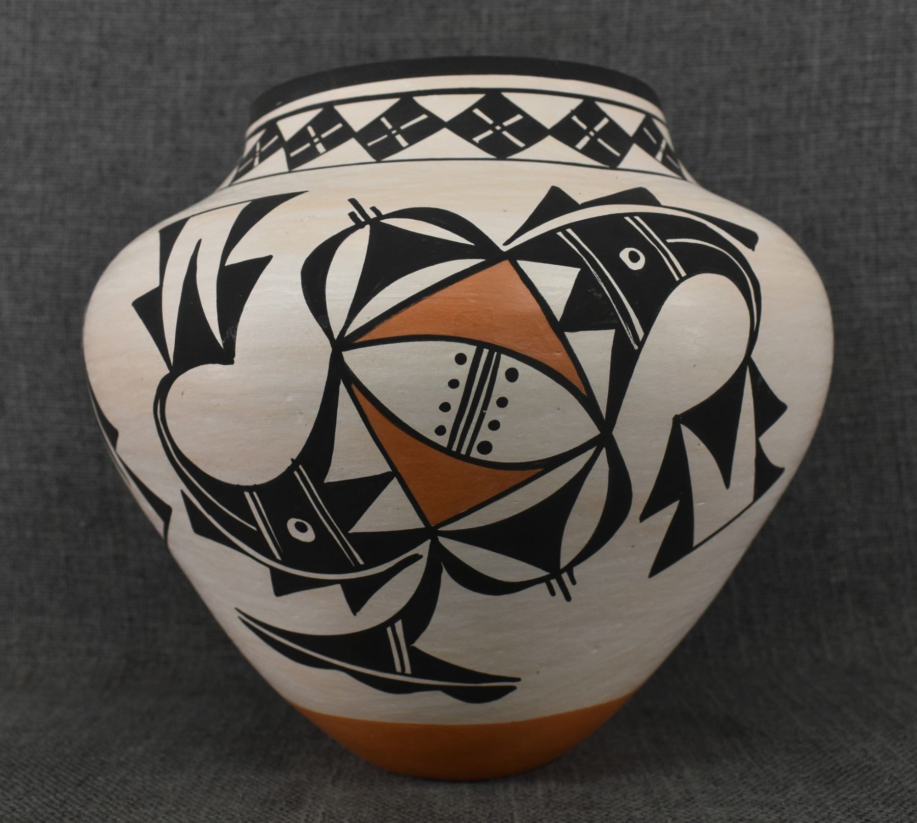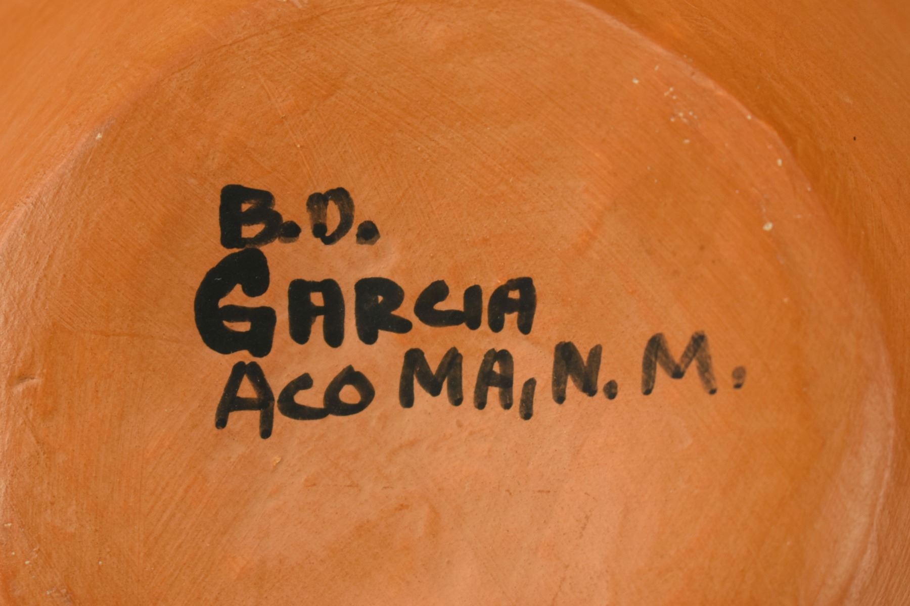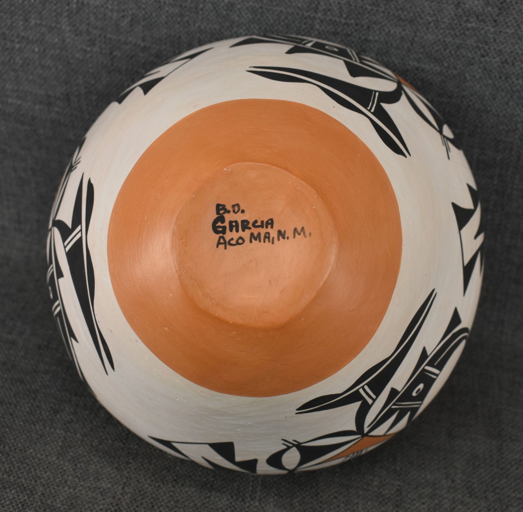 1980's Acoma, Hand coiled and polychrome painted pottery olla signed B. D. Garcia. 8" x 8.5"