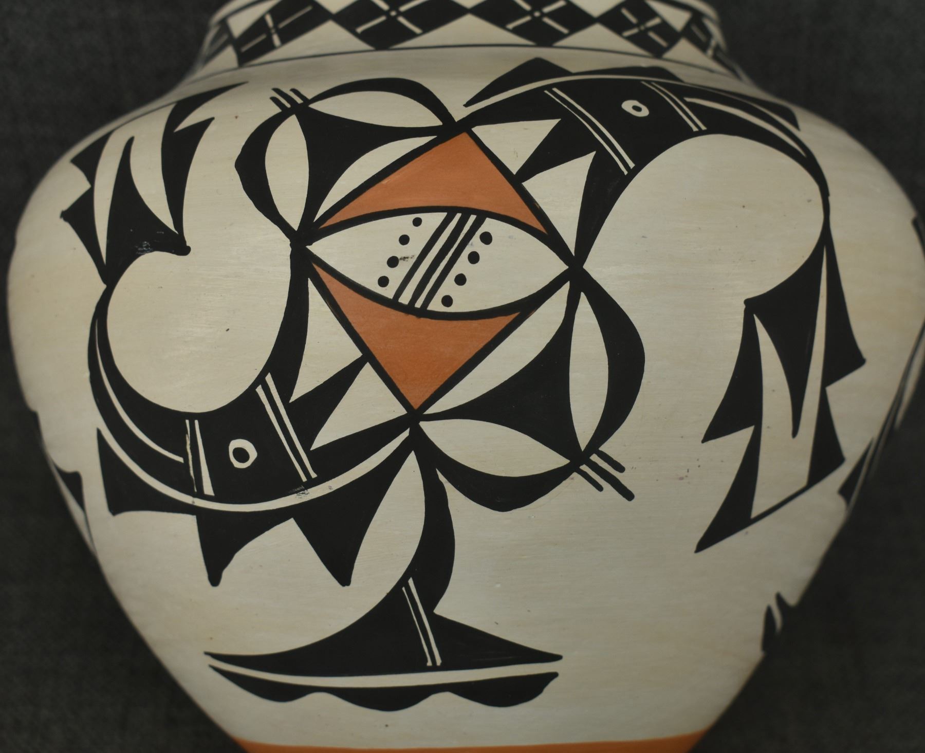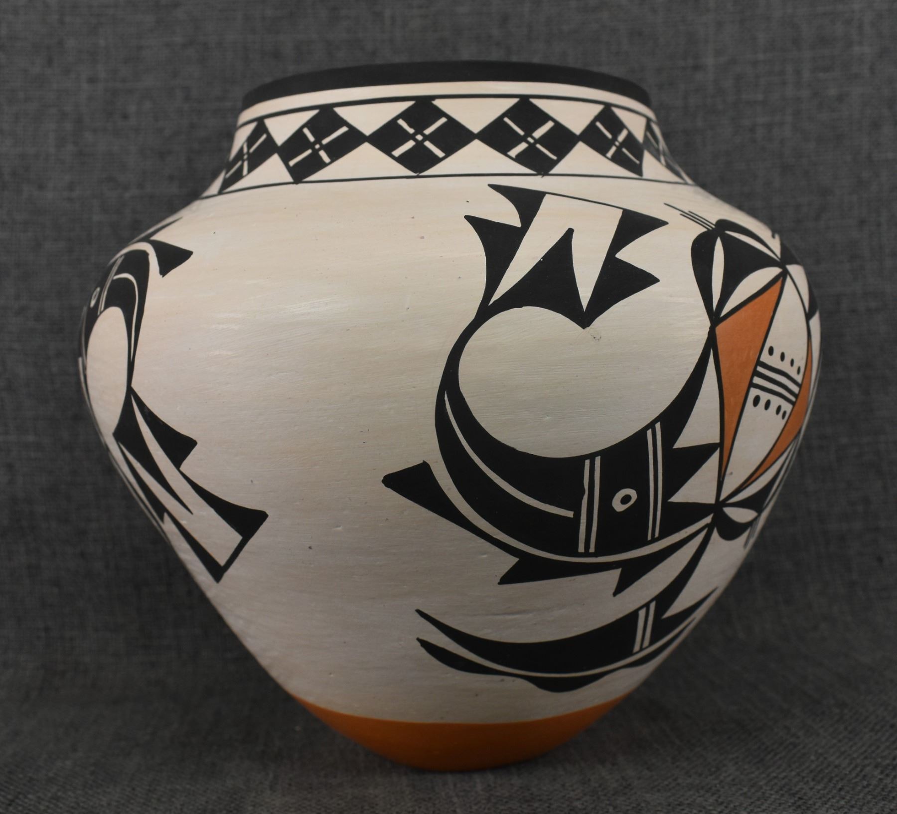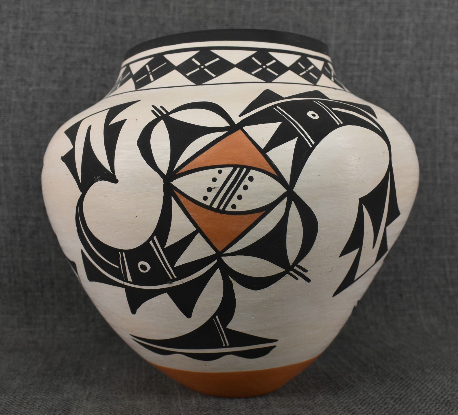 1980's Acoma, Hand coiled and polychrome painted pottery olla signed B. D. Garcia. 8" x 8.5"