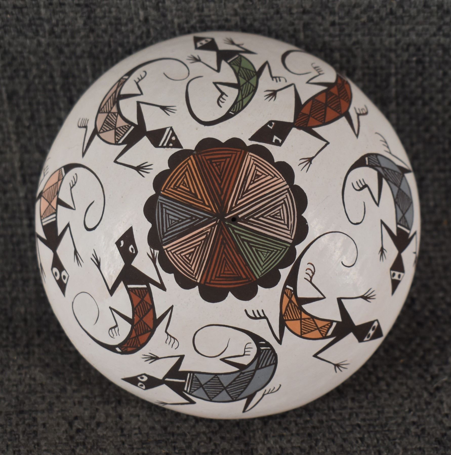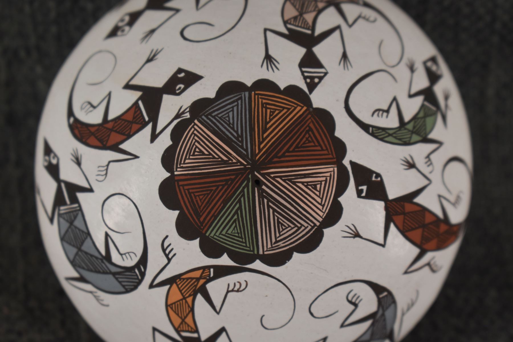 1980's Acoma . Hand coiled and busy poly chrome painted design pottery seed jar signed D Lewis. 1.5'' x 3.25''