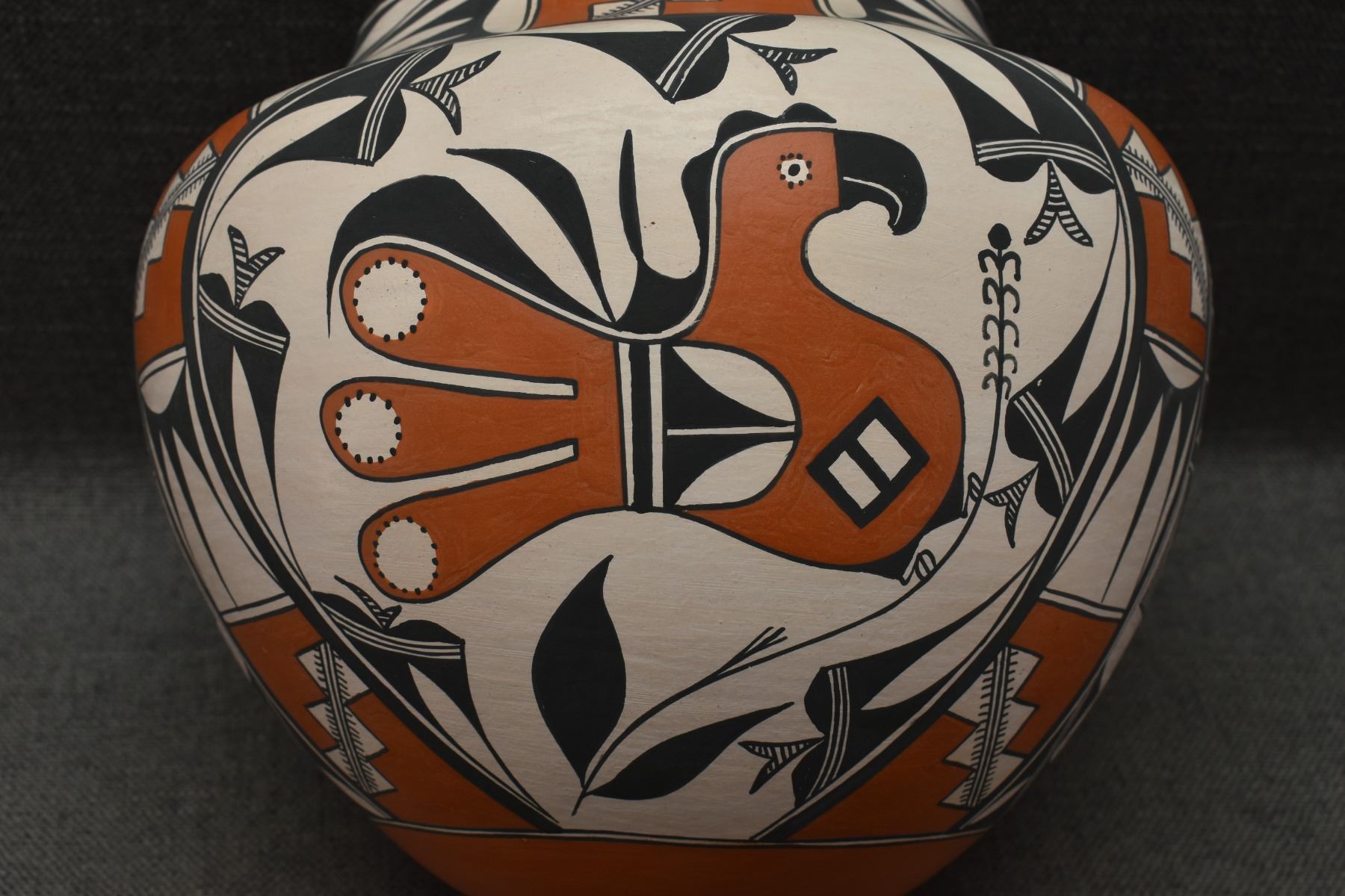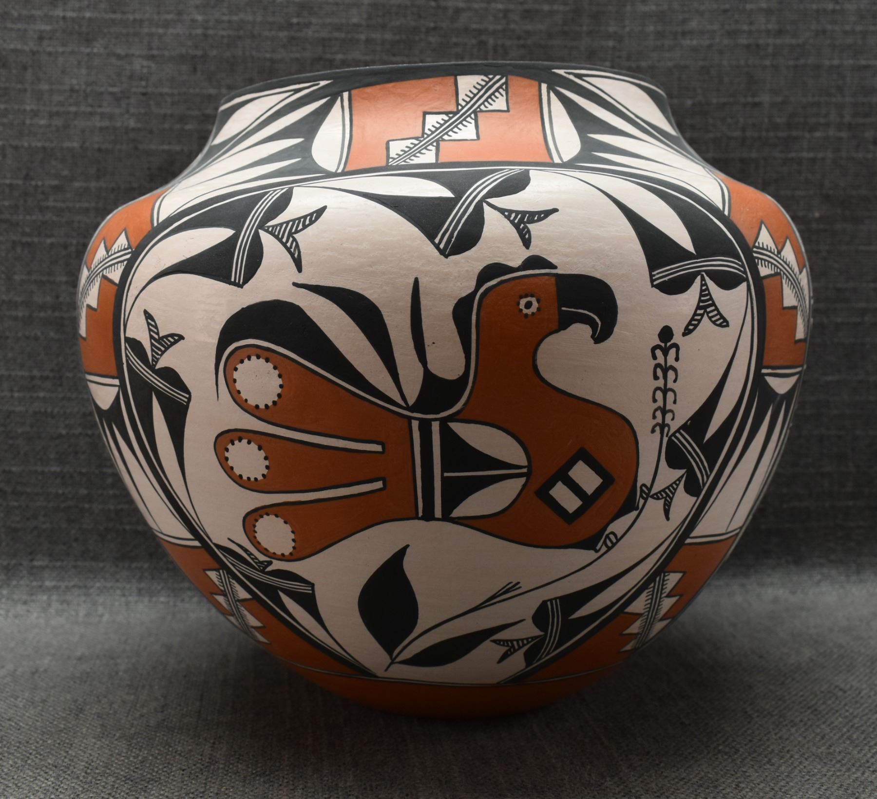 1970's Acoma. Hand coiled and painted polychrome parrot design signed F. Aragon. 9'' x 10''