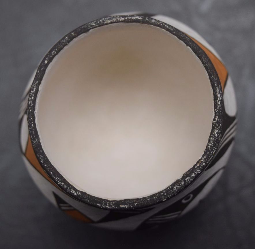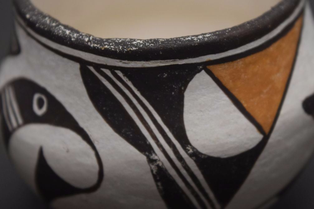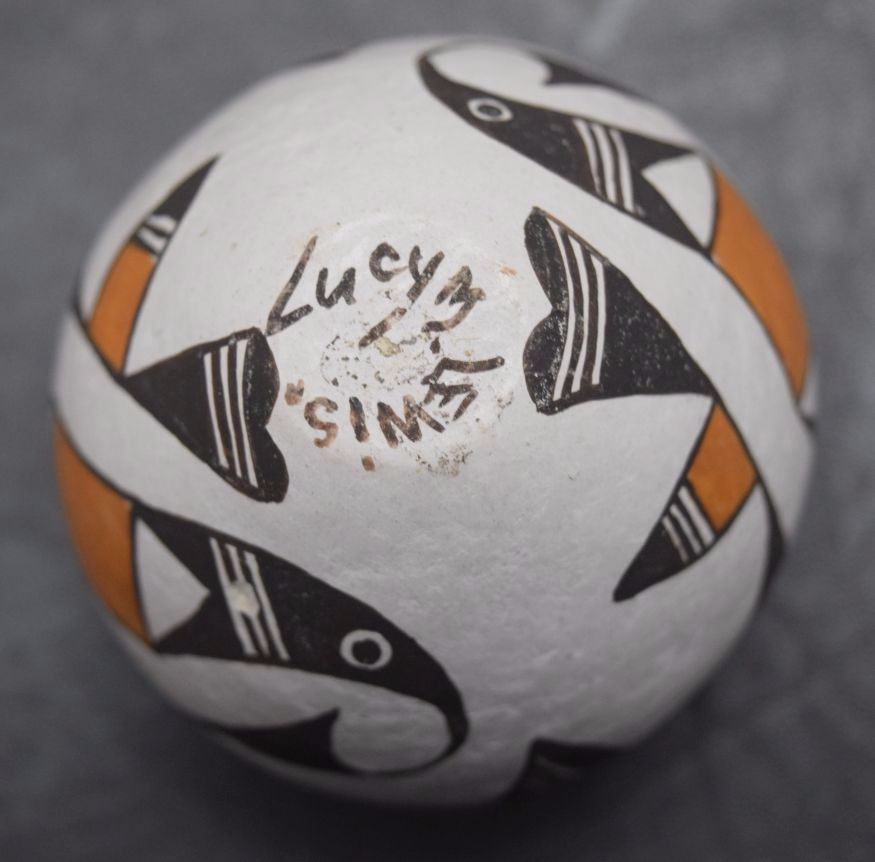 1960's hand painted poly chrome design signed Lucy M Lewis. Has surface minor pits 2'' x 2.5''
