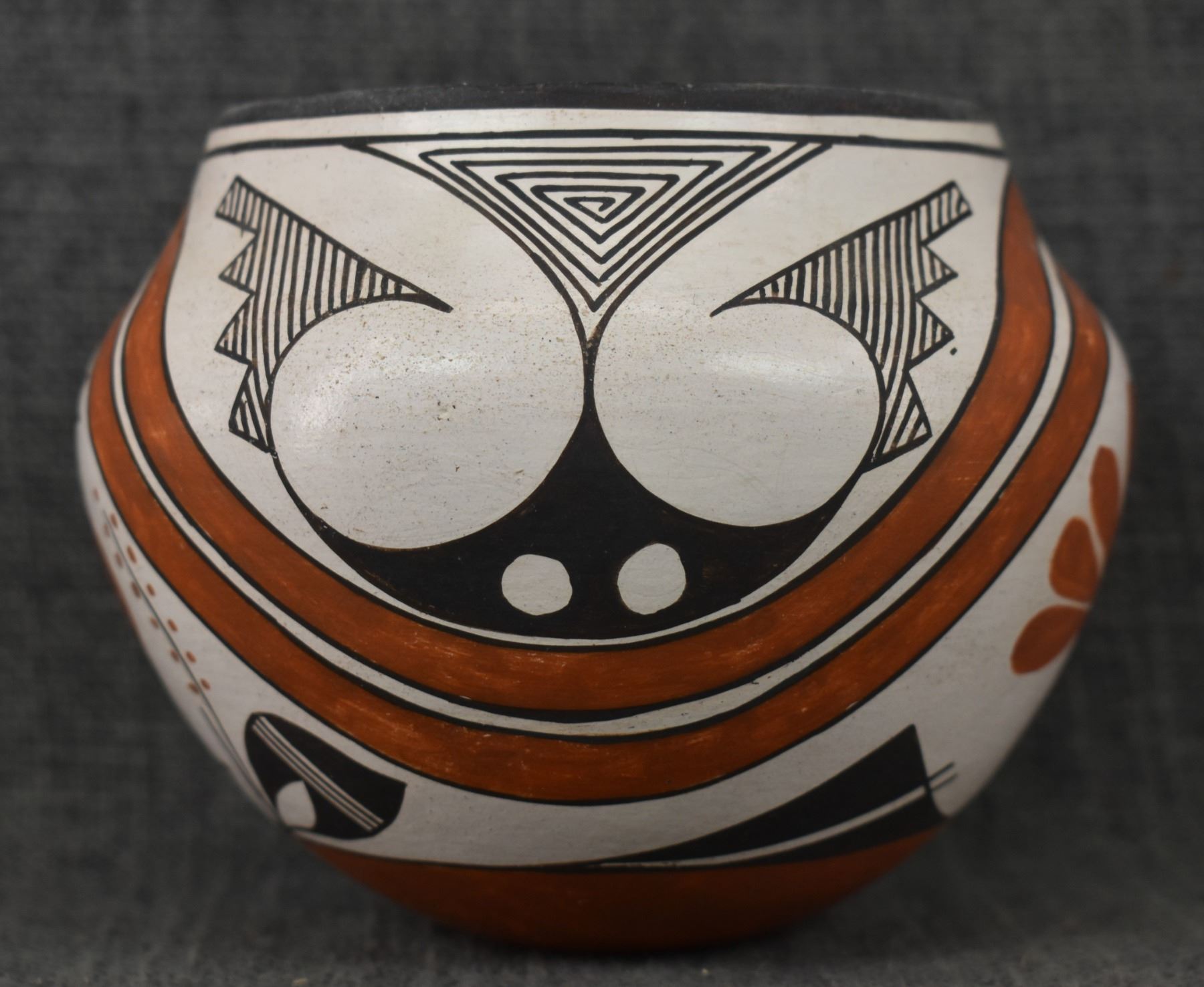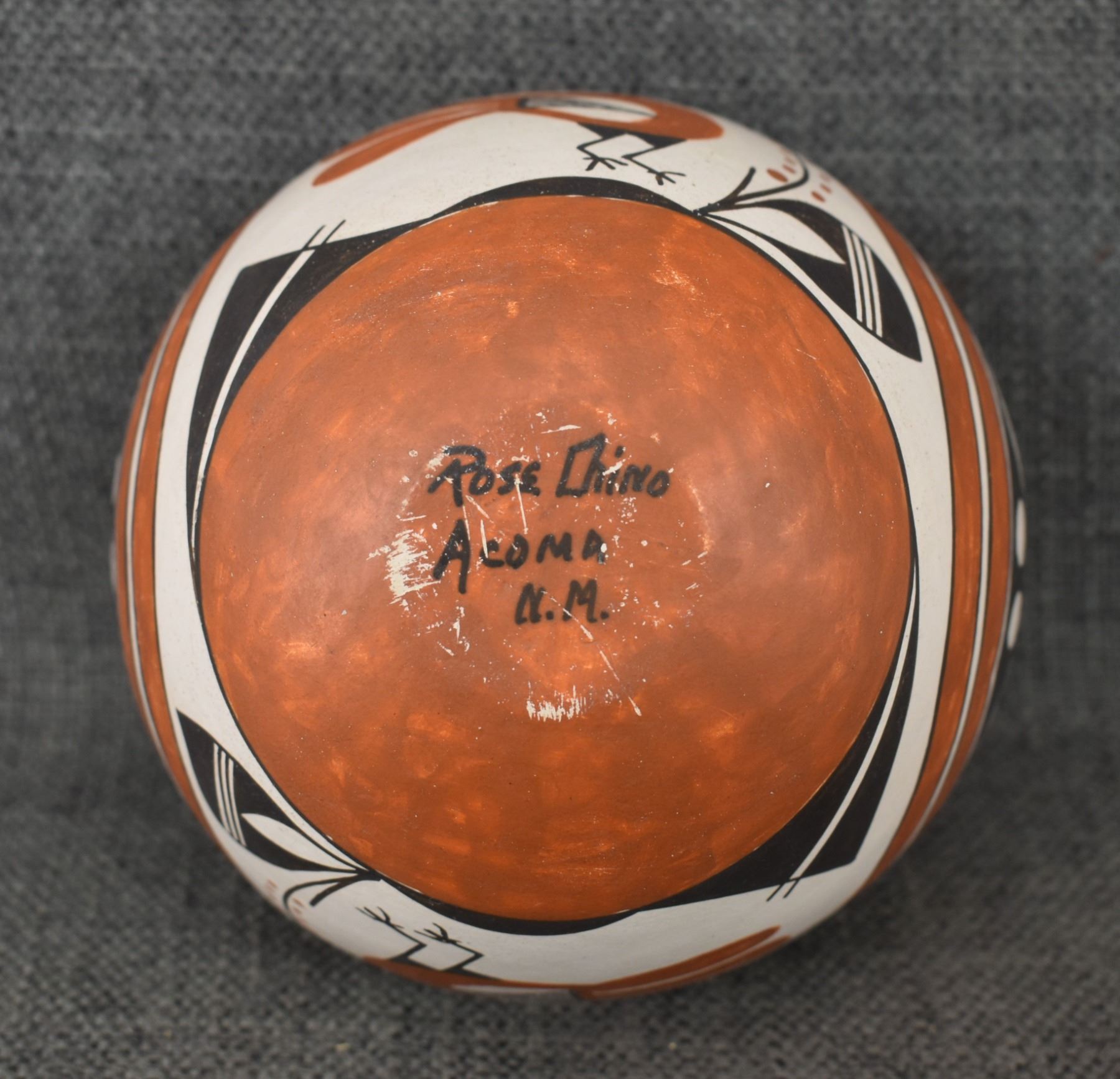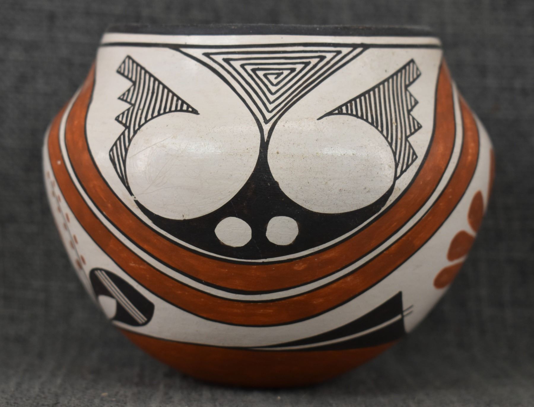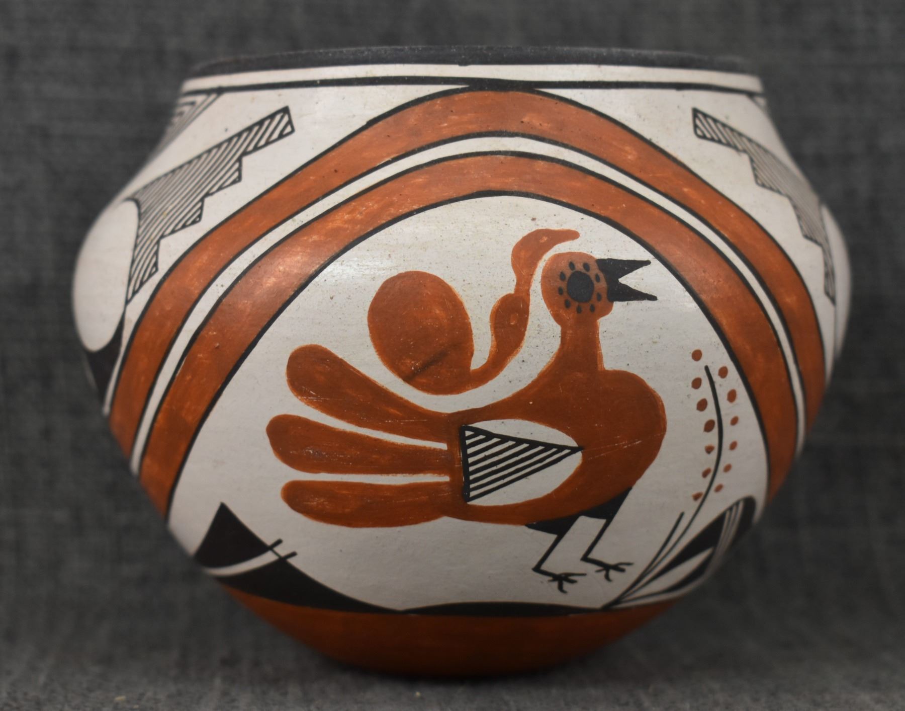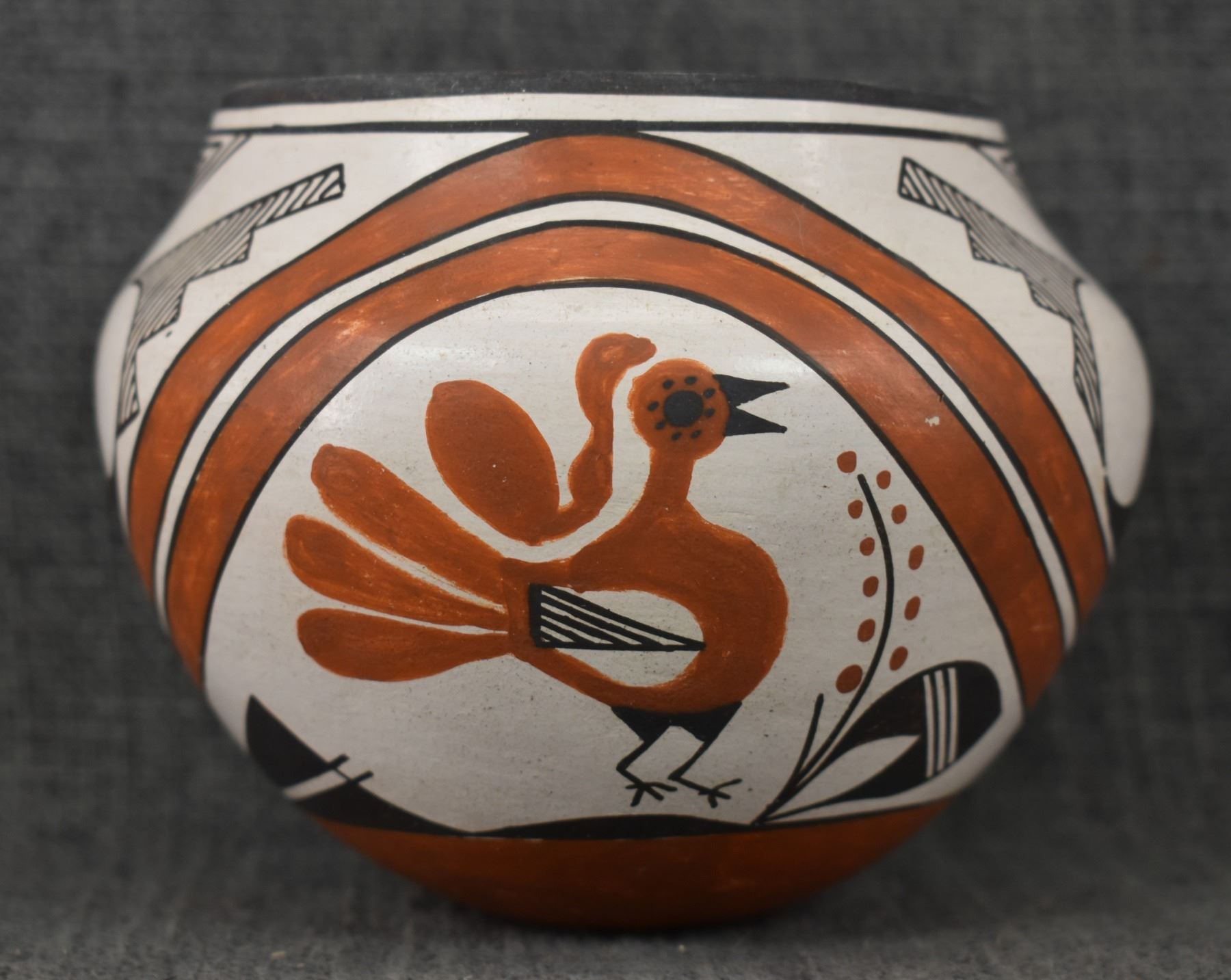 1970's Acoma, hand coiled with polychrome painted turkey and geometric design by Rose Chino, 3.75" x 4.75"