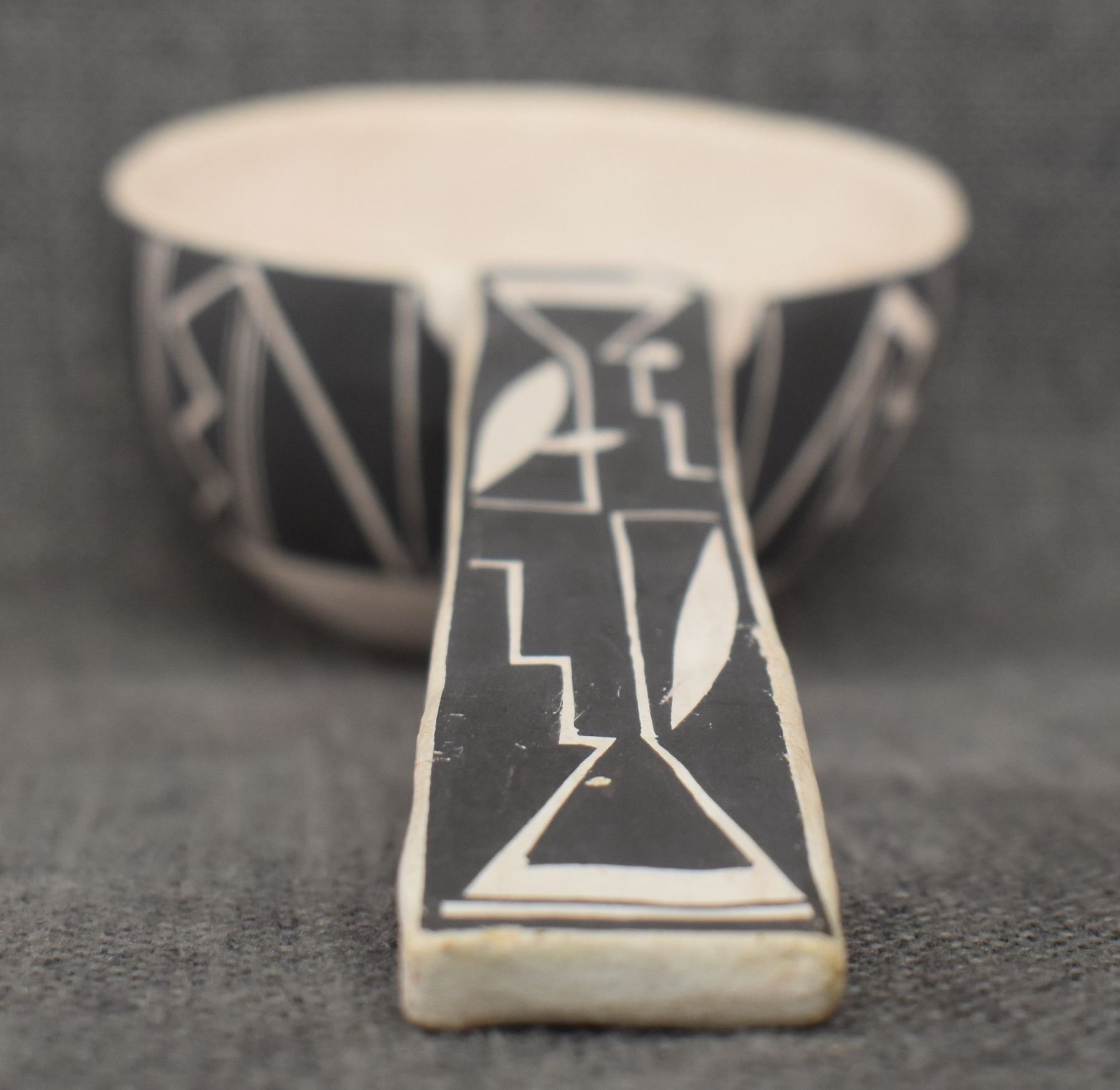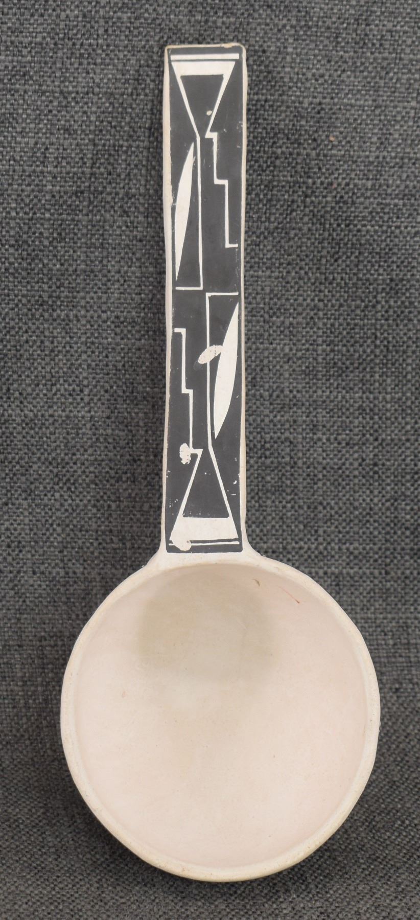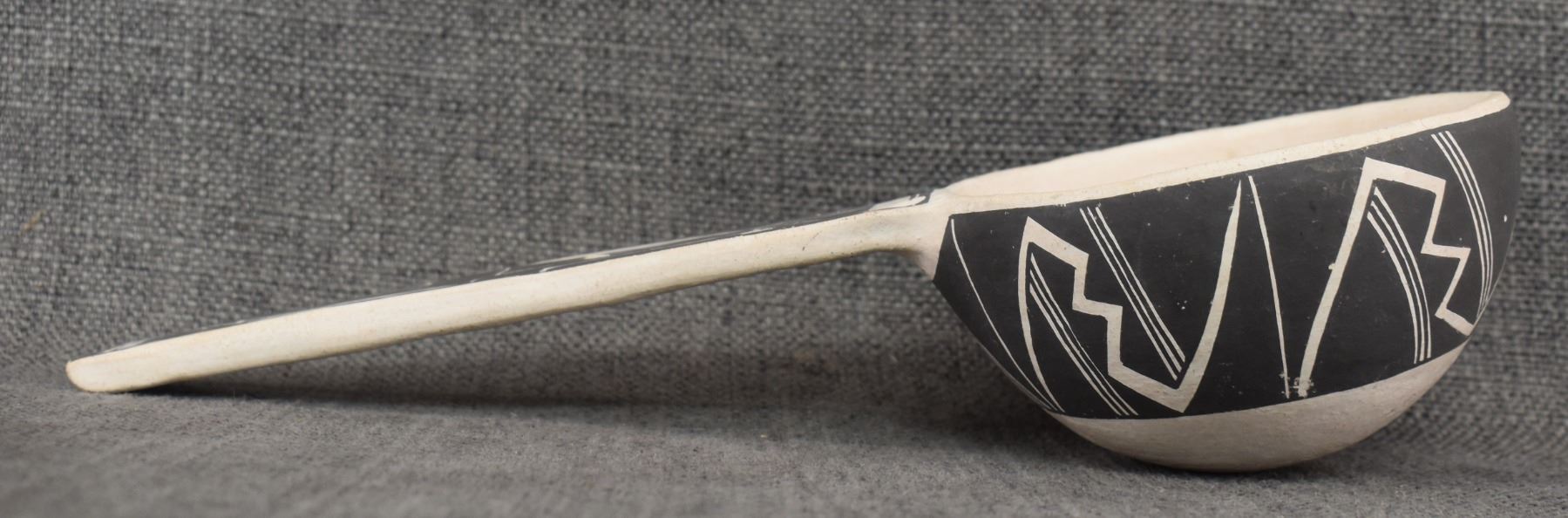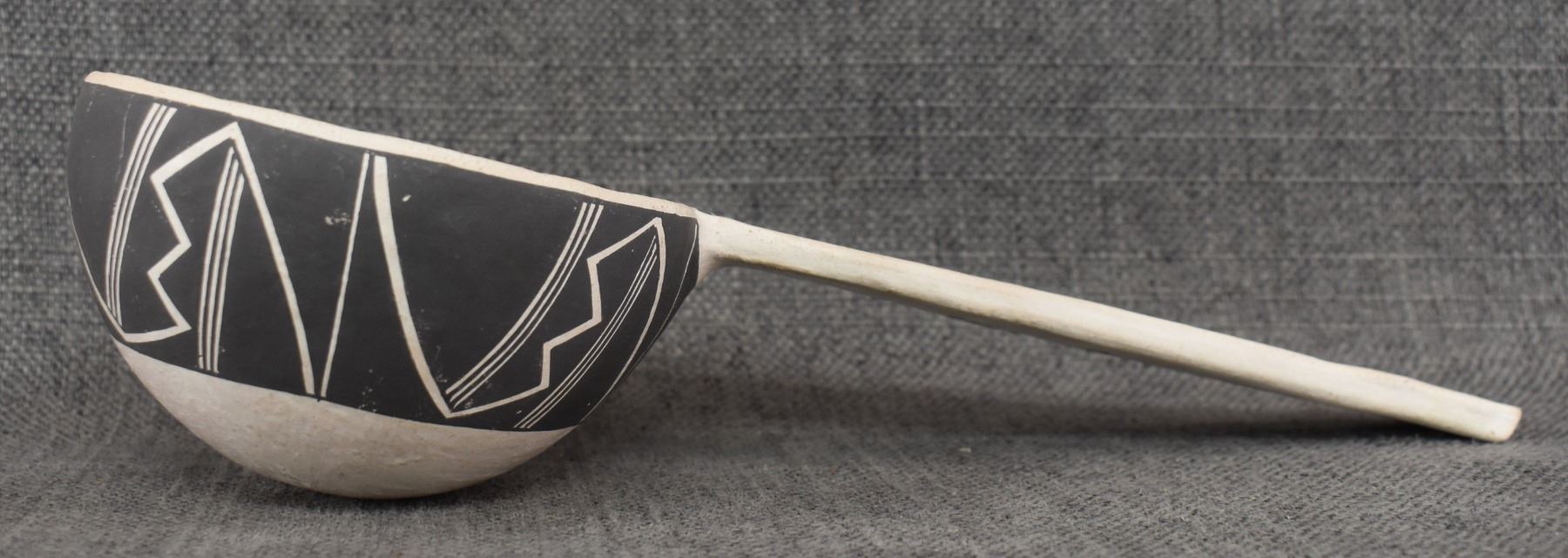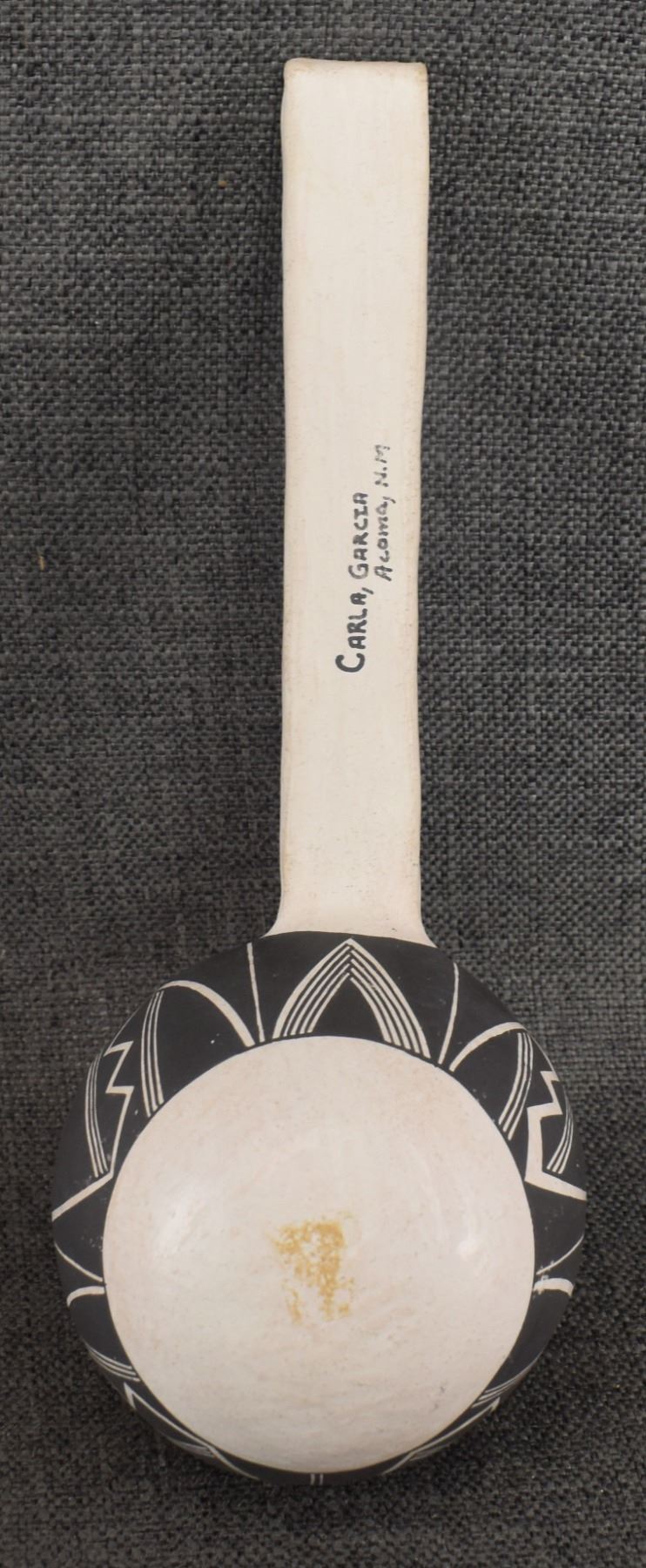1980's Acoma. Hand coiled and painted black on white design pottery ladle. Signed Carla Garcia. 11'' x 2.5'' x 4.25''