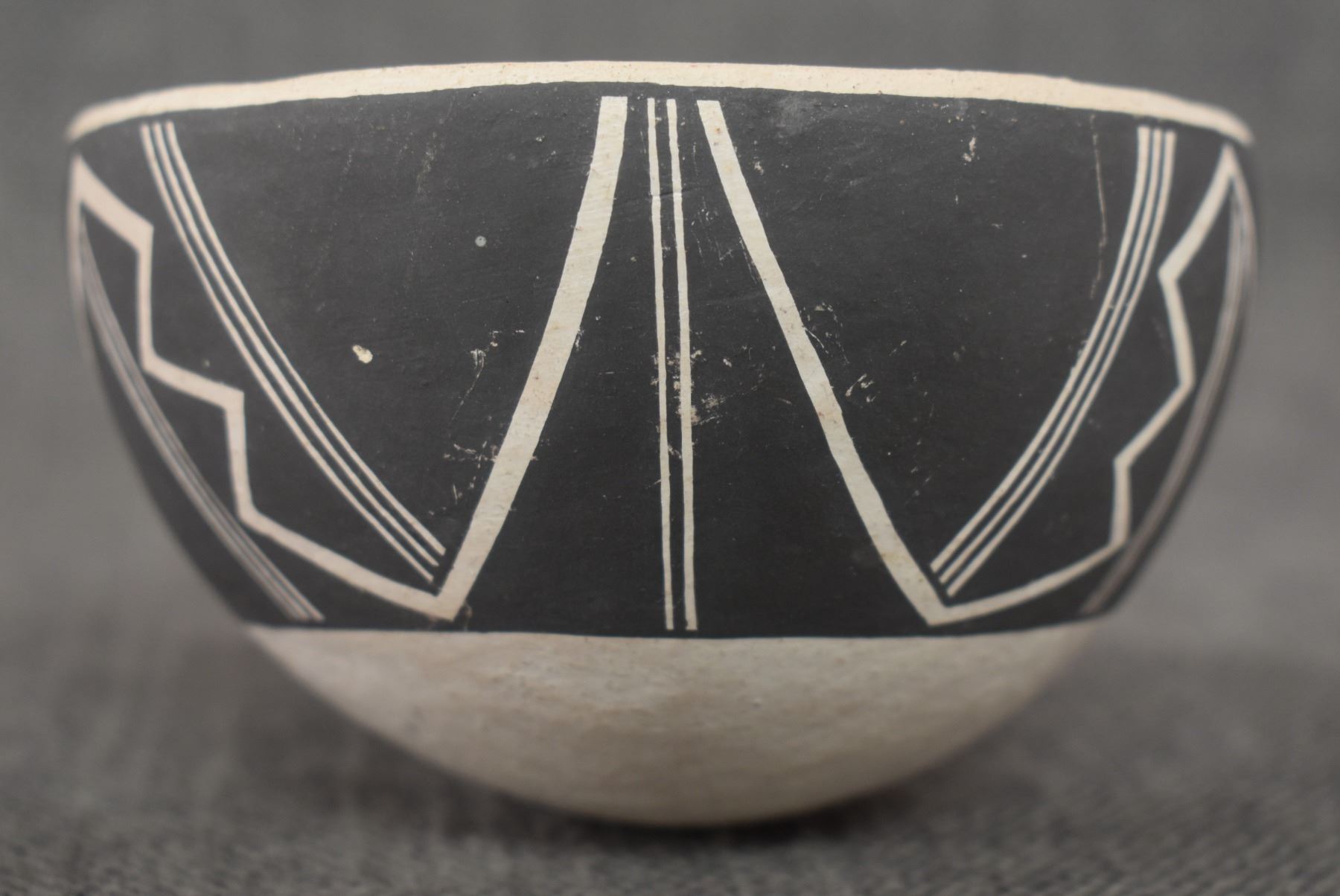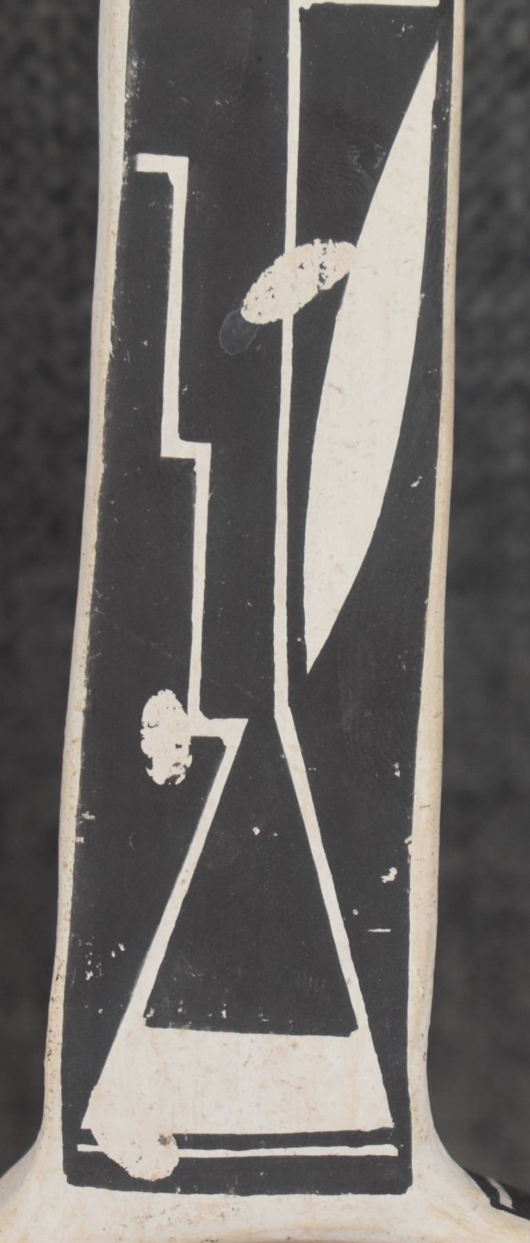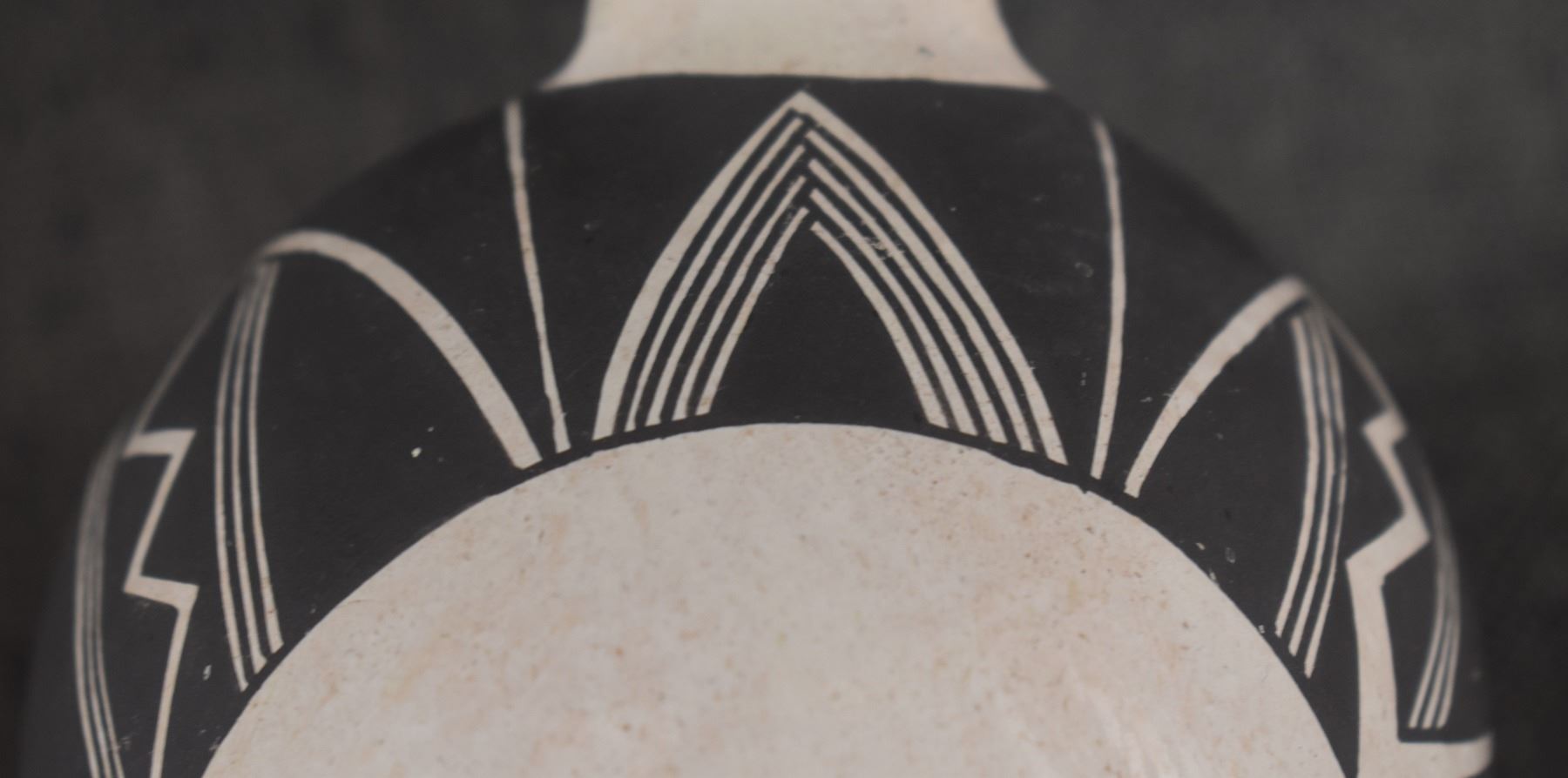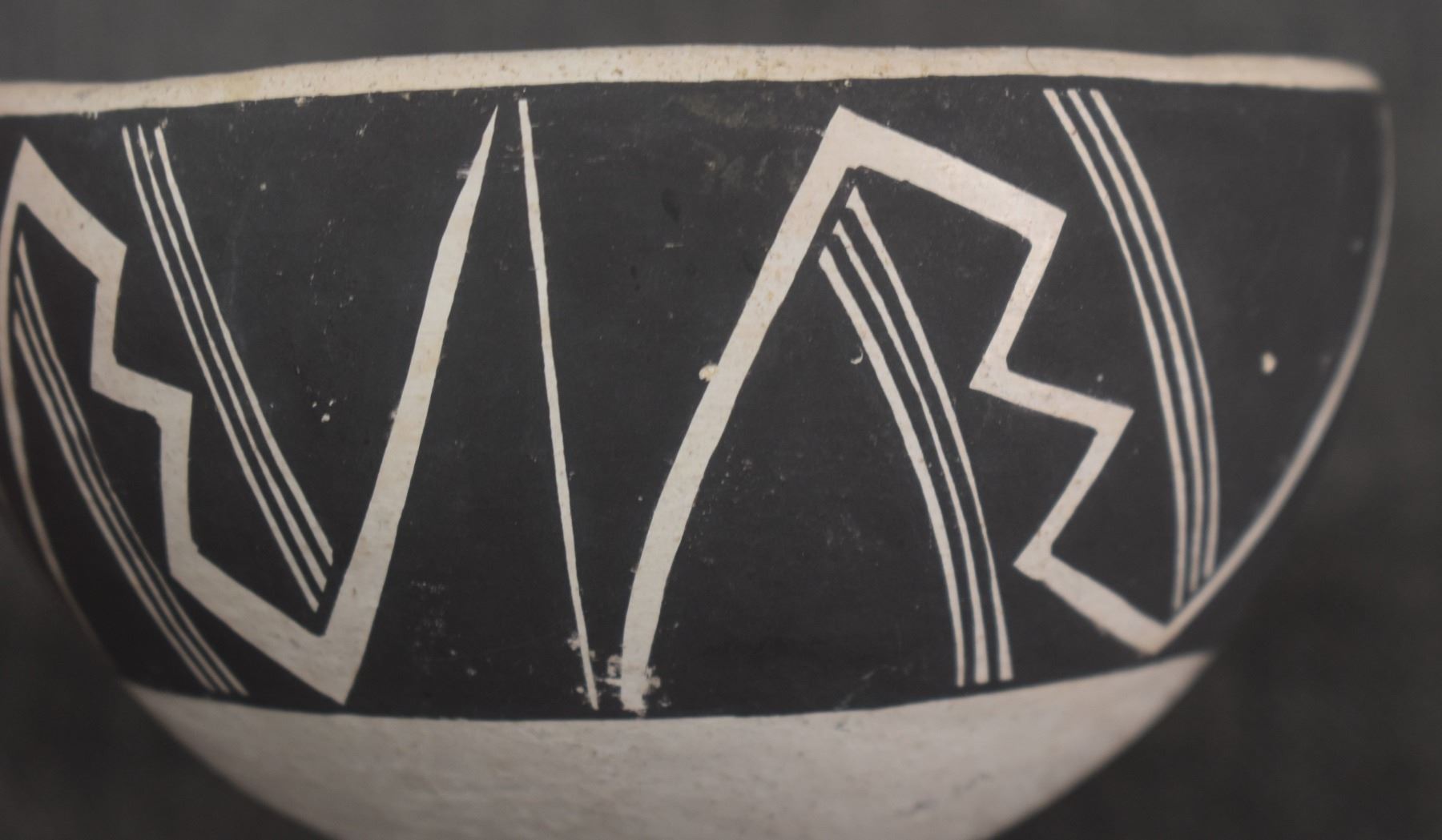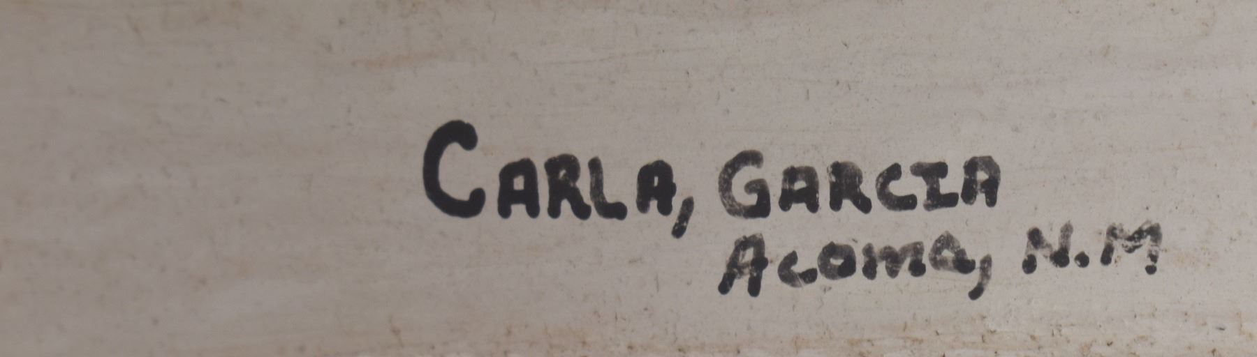 1980's Acoma. Hand coiled and painted black on white design pottery ladle. Signed Carla Garcia. 11'' x 2.5'' x 4.25''