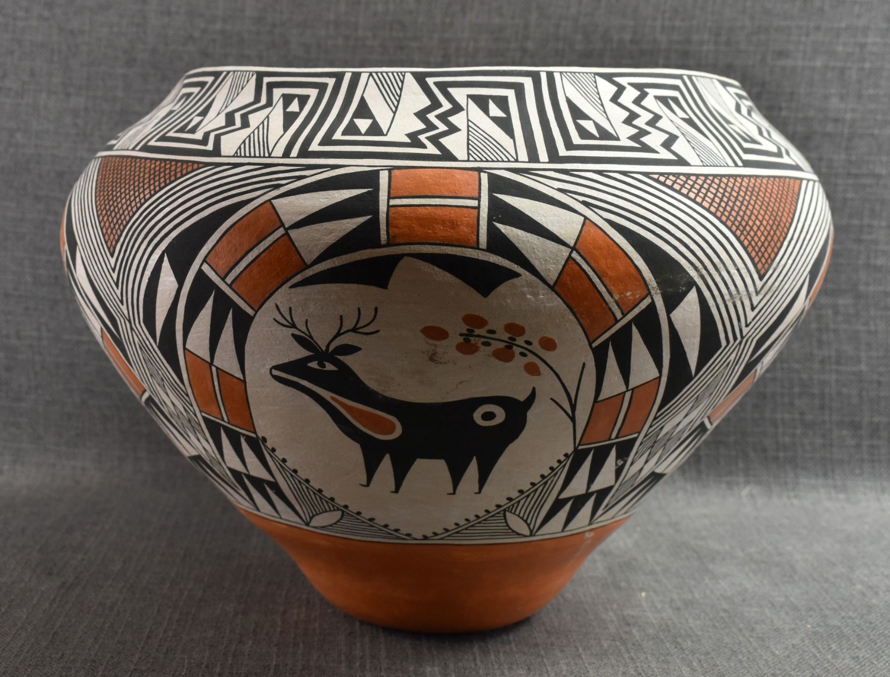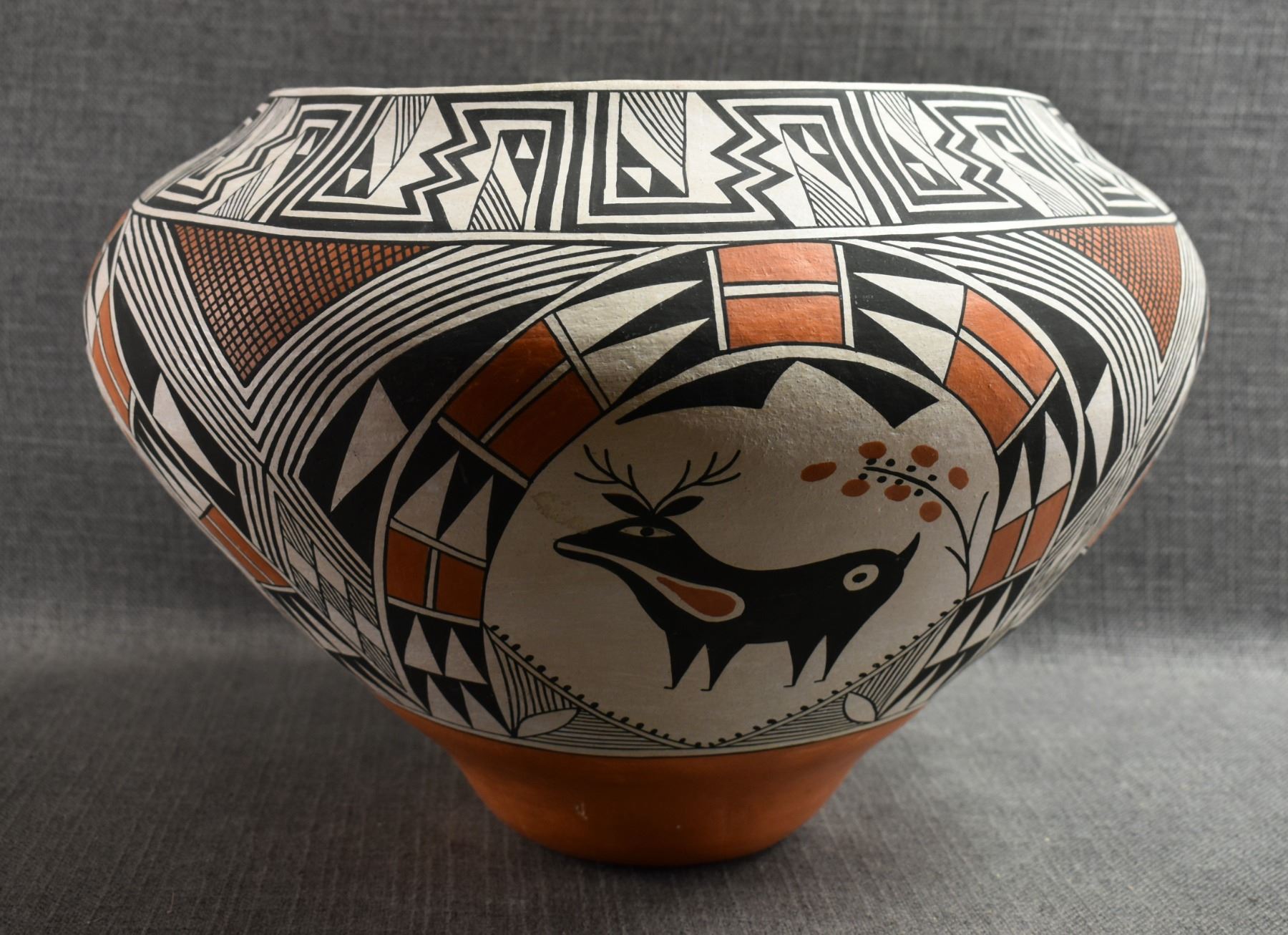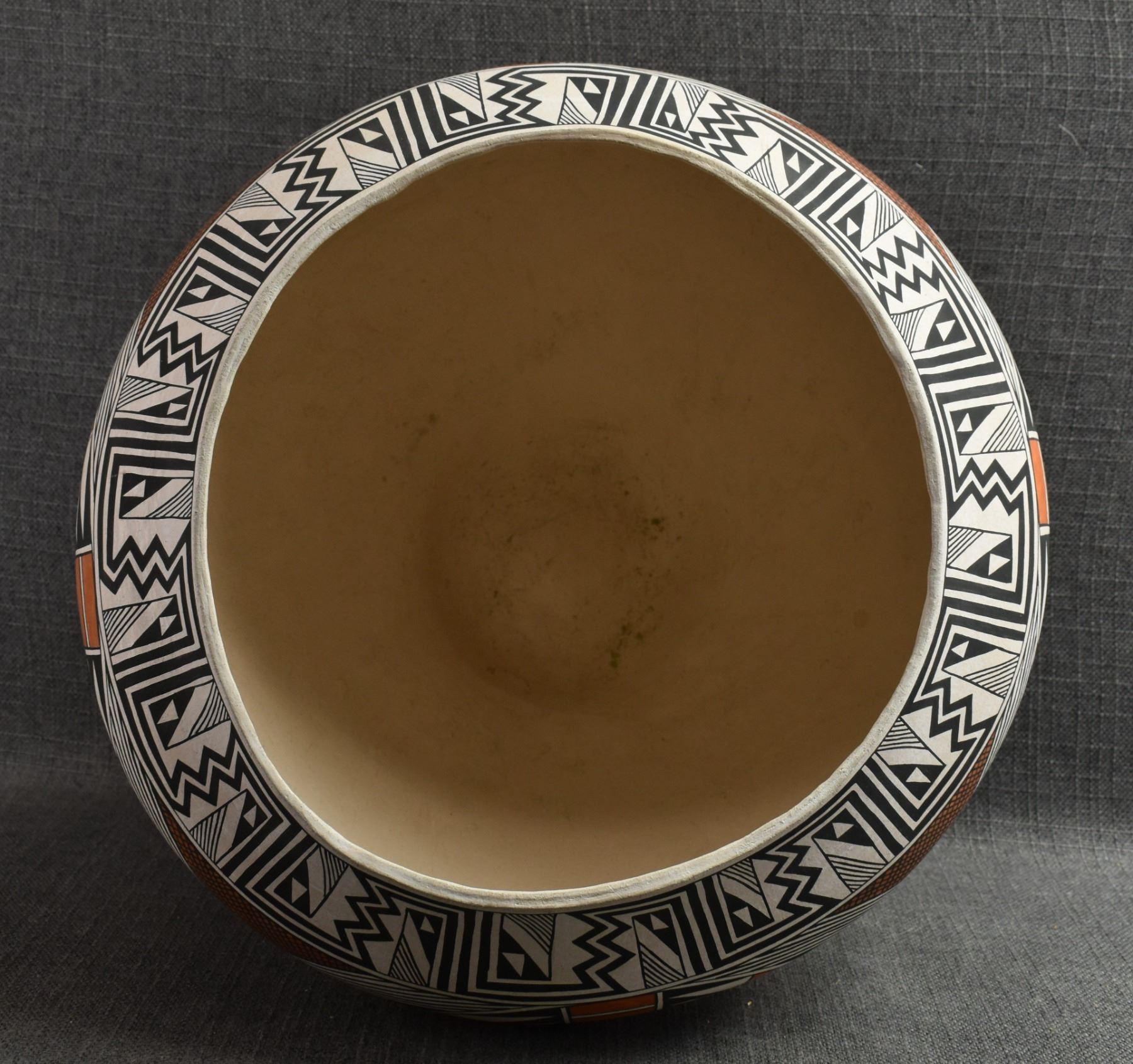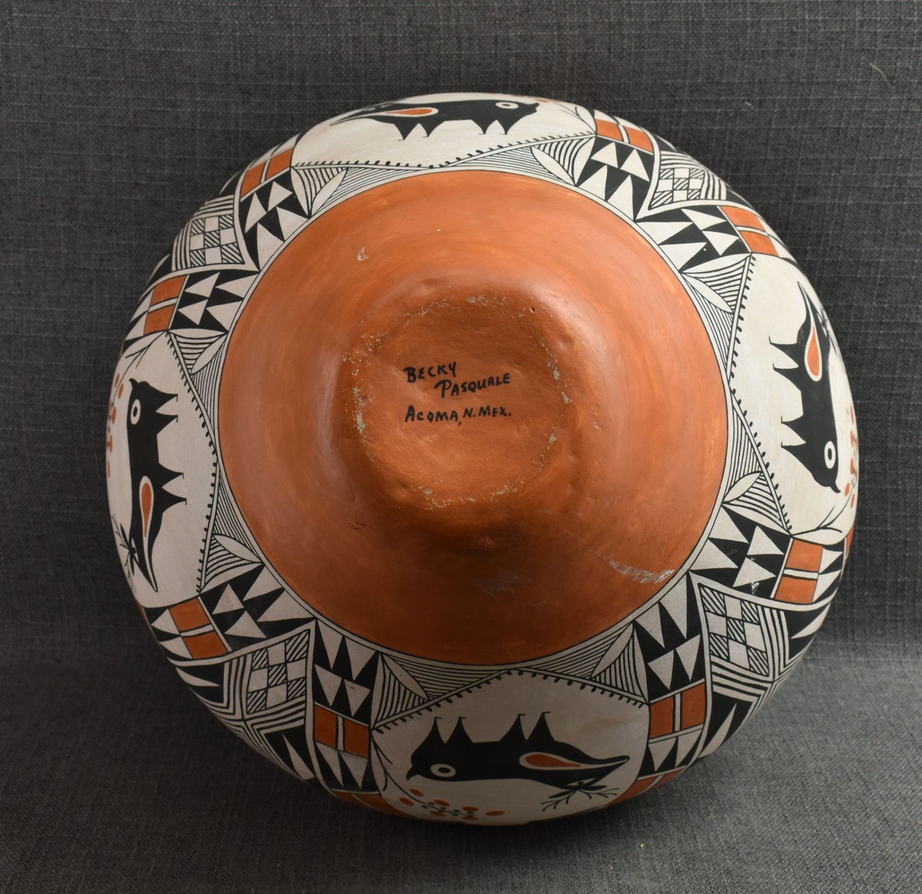 1970's Acoma. Hand coiled and painted polychrome design pottery olla signed Becky Pasquale. 11'' x 15'' has surface rubs