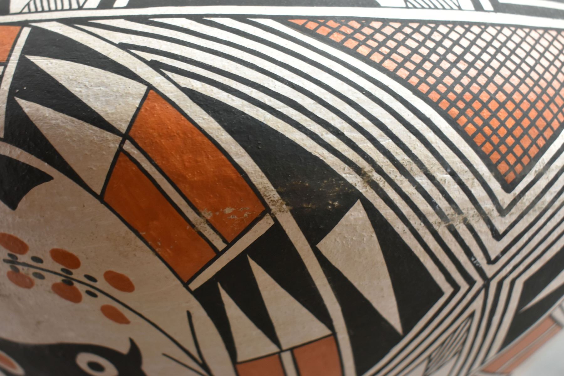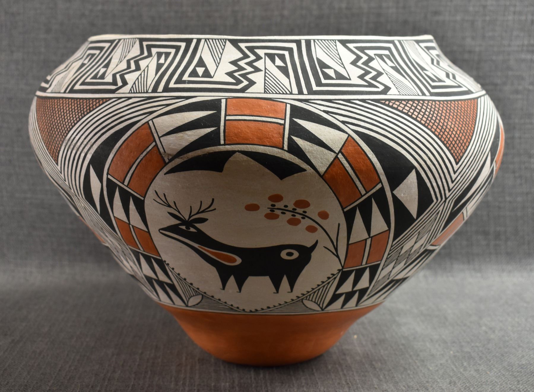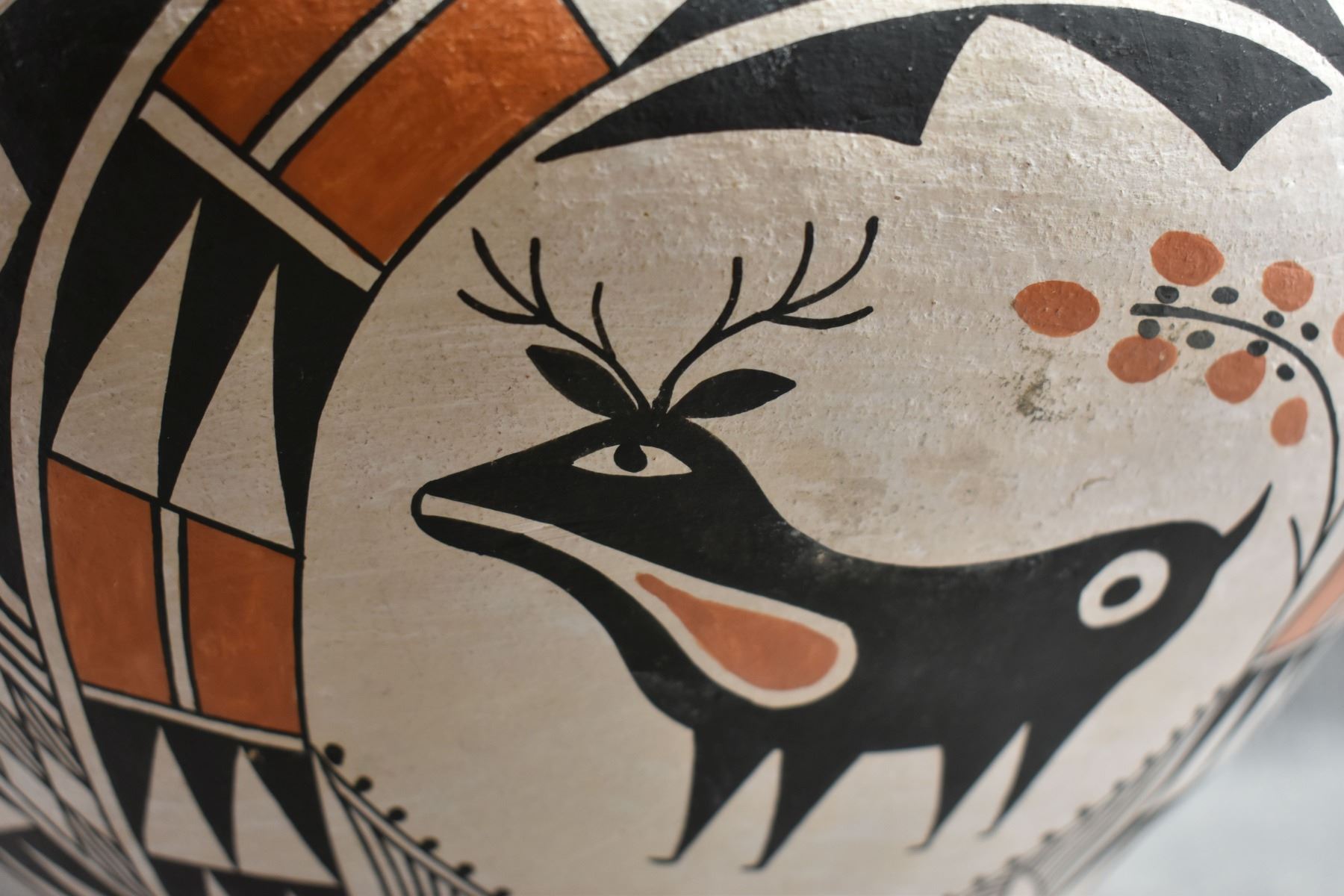 1970's Acoma. Hand coiled and painted polychrome design pottery olla signed Becky Pasquale. 11'' x 15'' has surface rubs