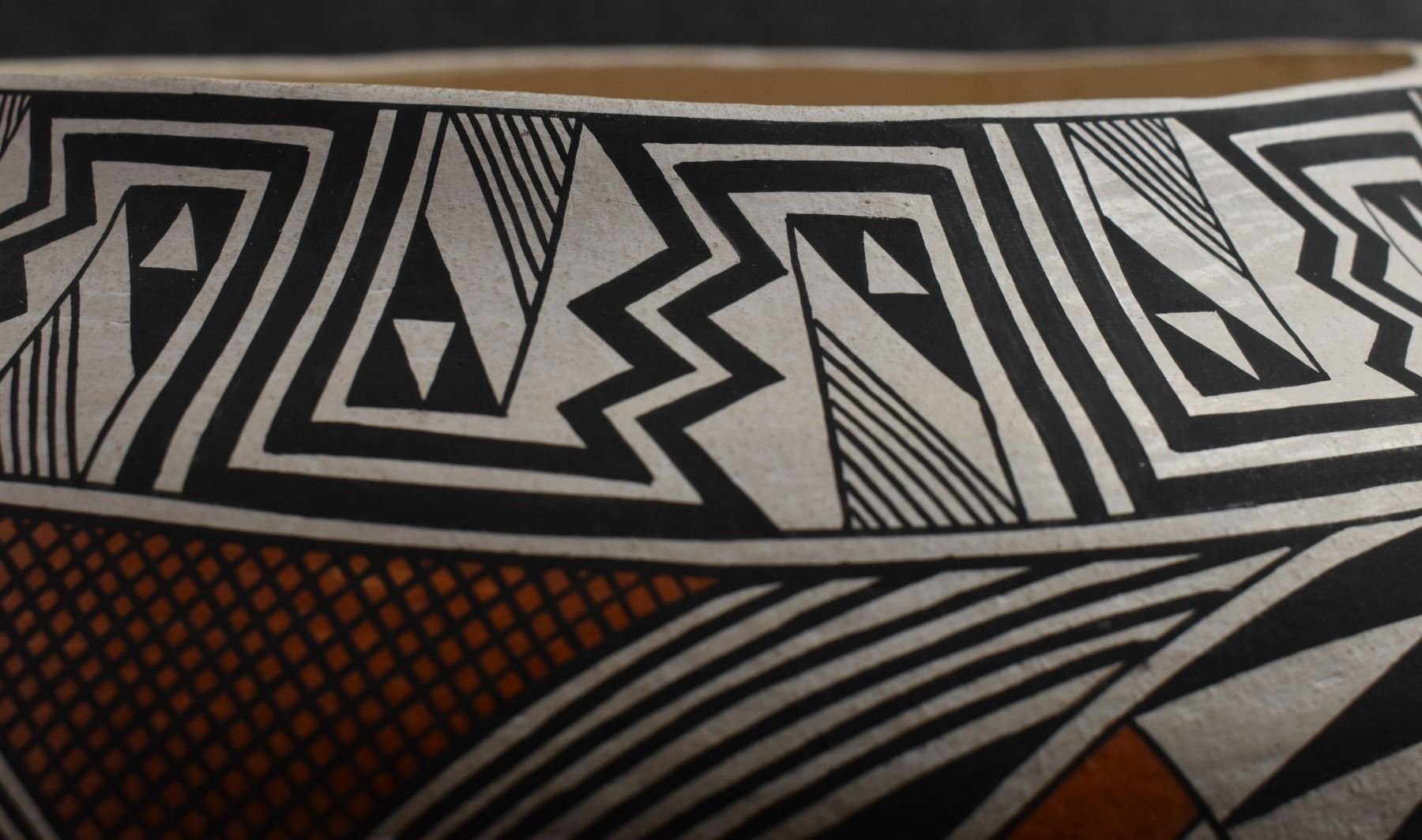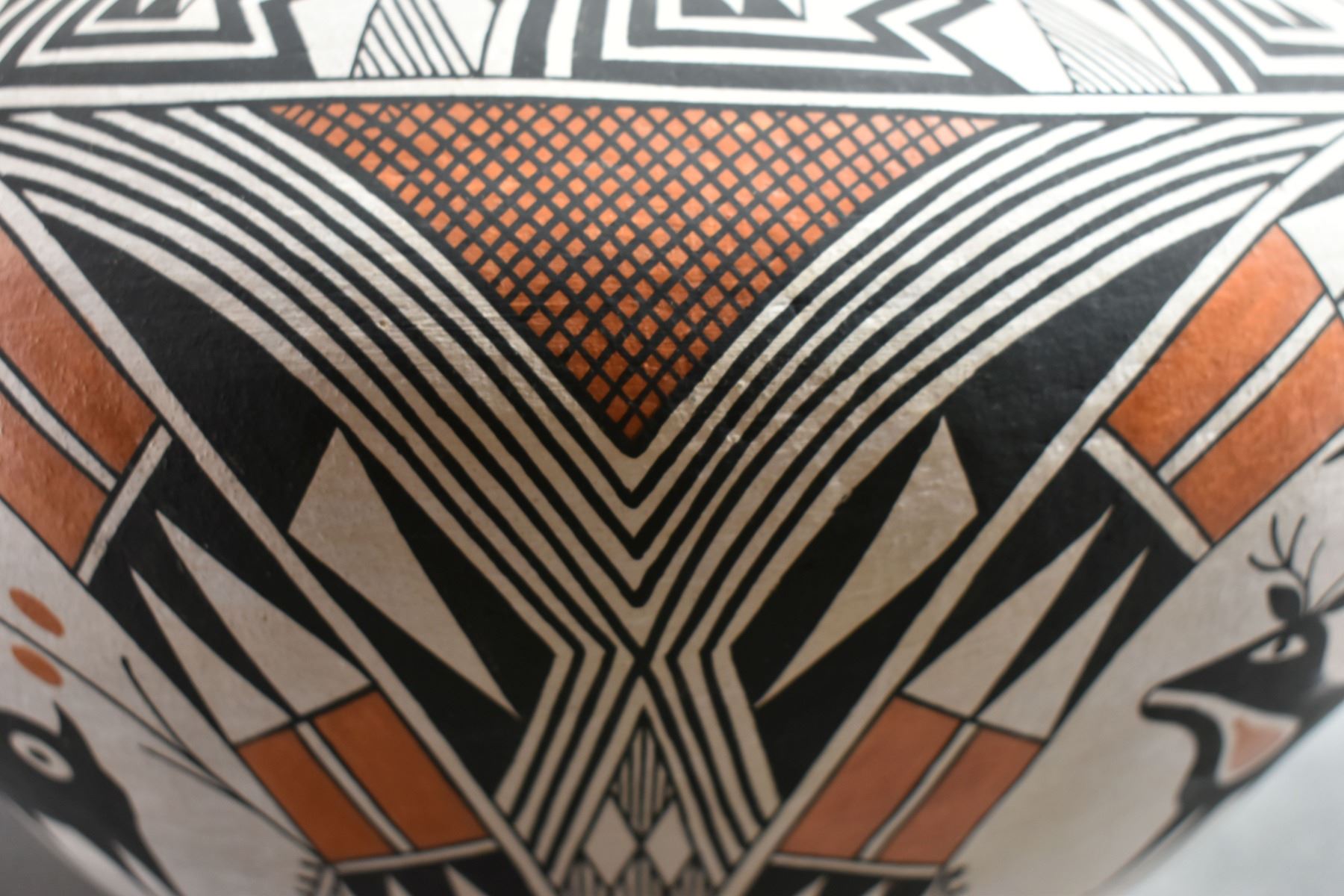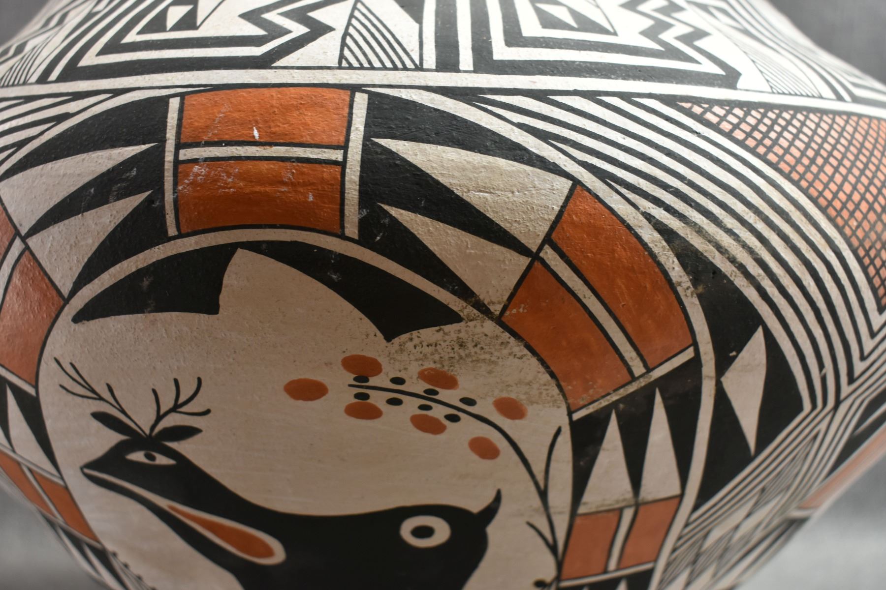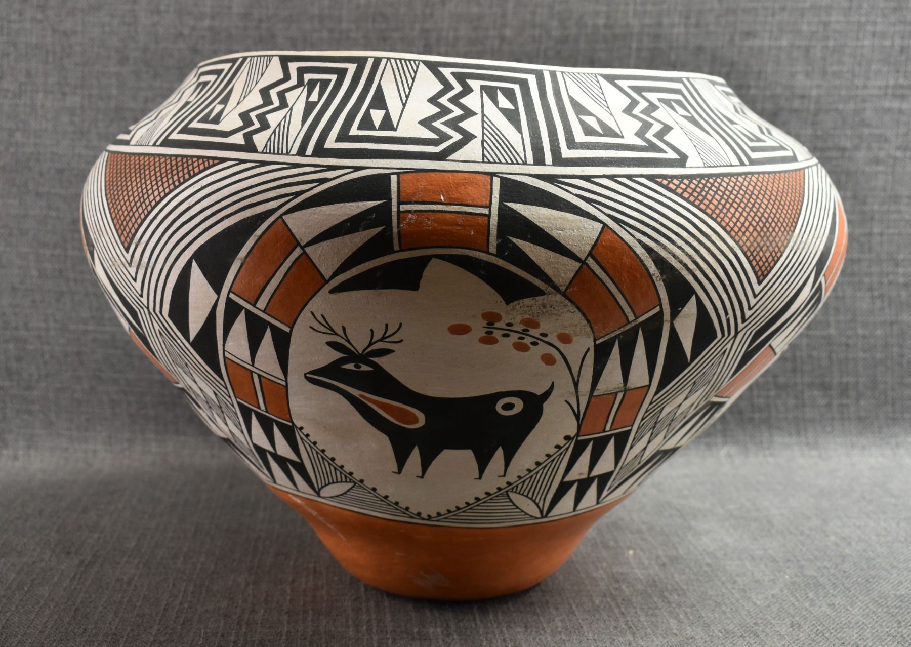 1970's Acoma. Hand coiled and painted polychrome design pottery olla signed Becky Pasquale. 11'' x 15'' has surface rubs
