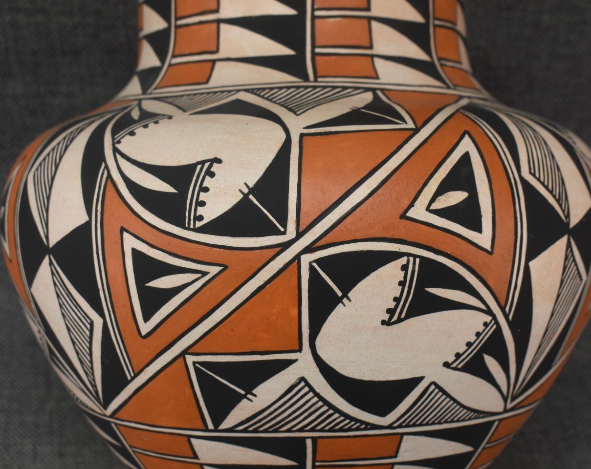 1980-90's Acoma, hand coiled with polychrome painted geometric design signed E Routzen 9" x 9"