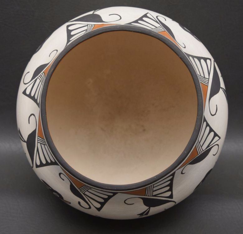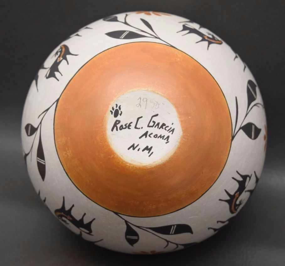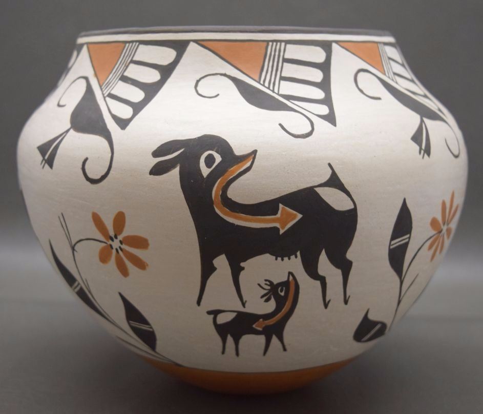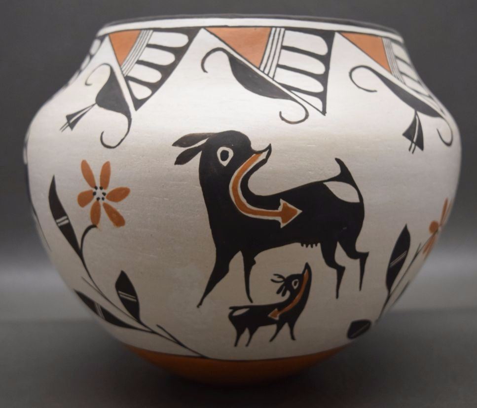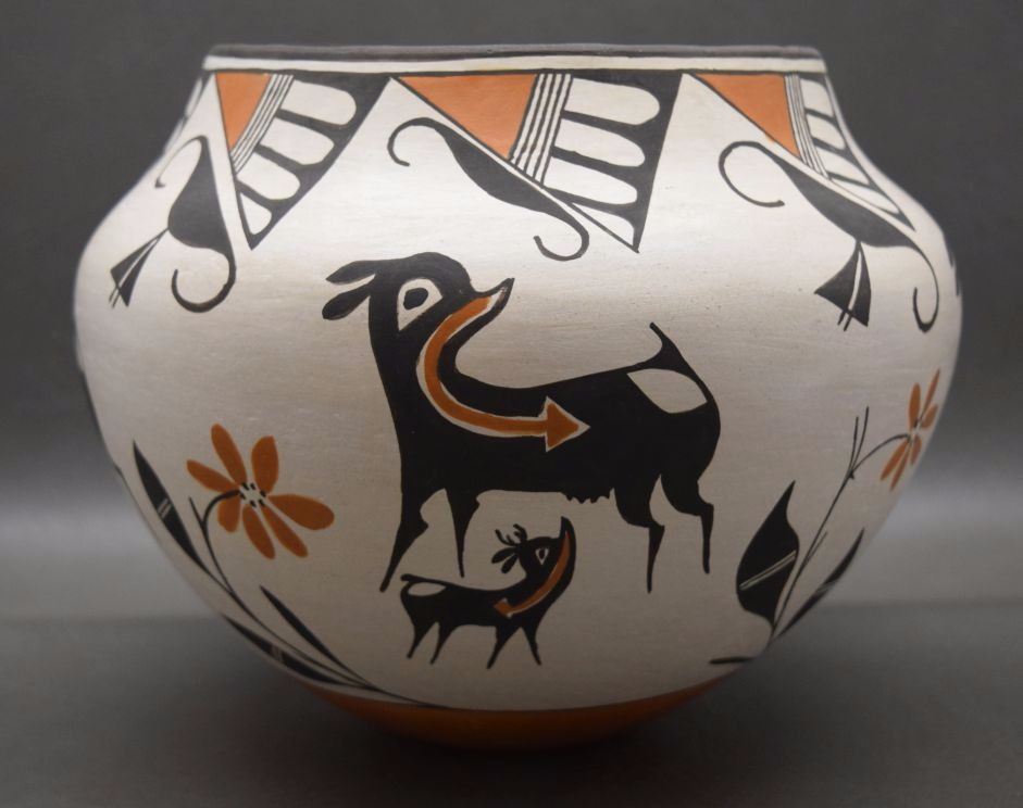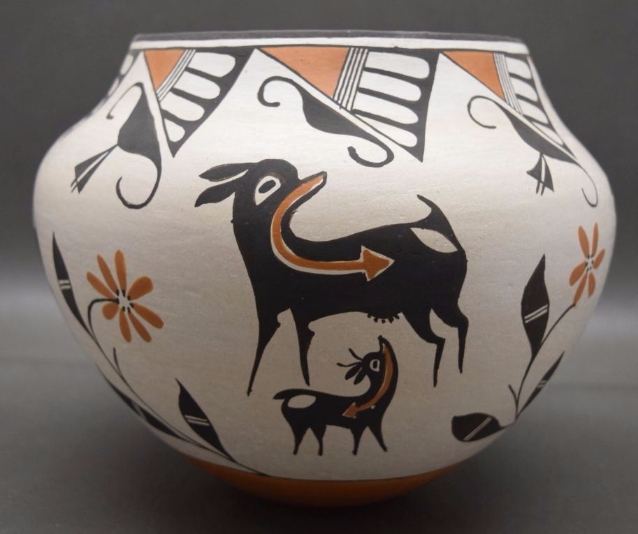1980's hand coiled polychrome heart line deer design signed Rose Garcia has surface pits 7'' x 9''