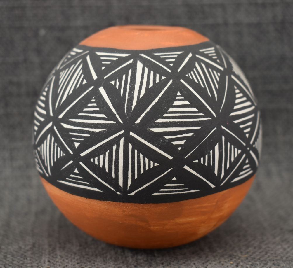 1980-90's Acoma, hand coiled with painted fine line design by D Sanchez 3.25" x 3.5"