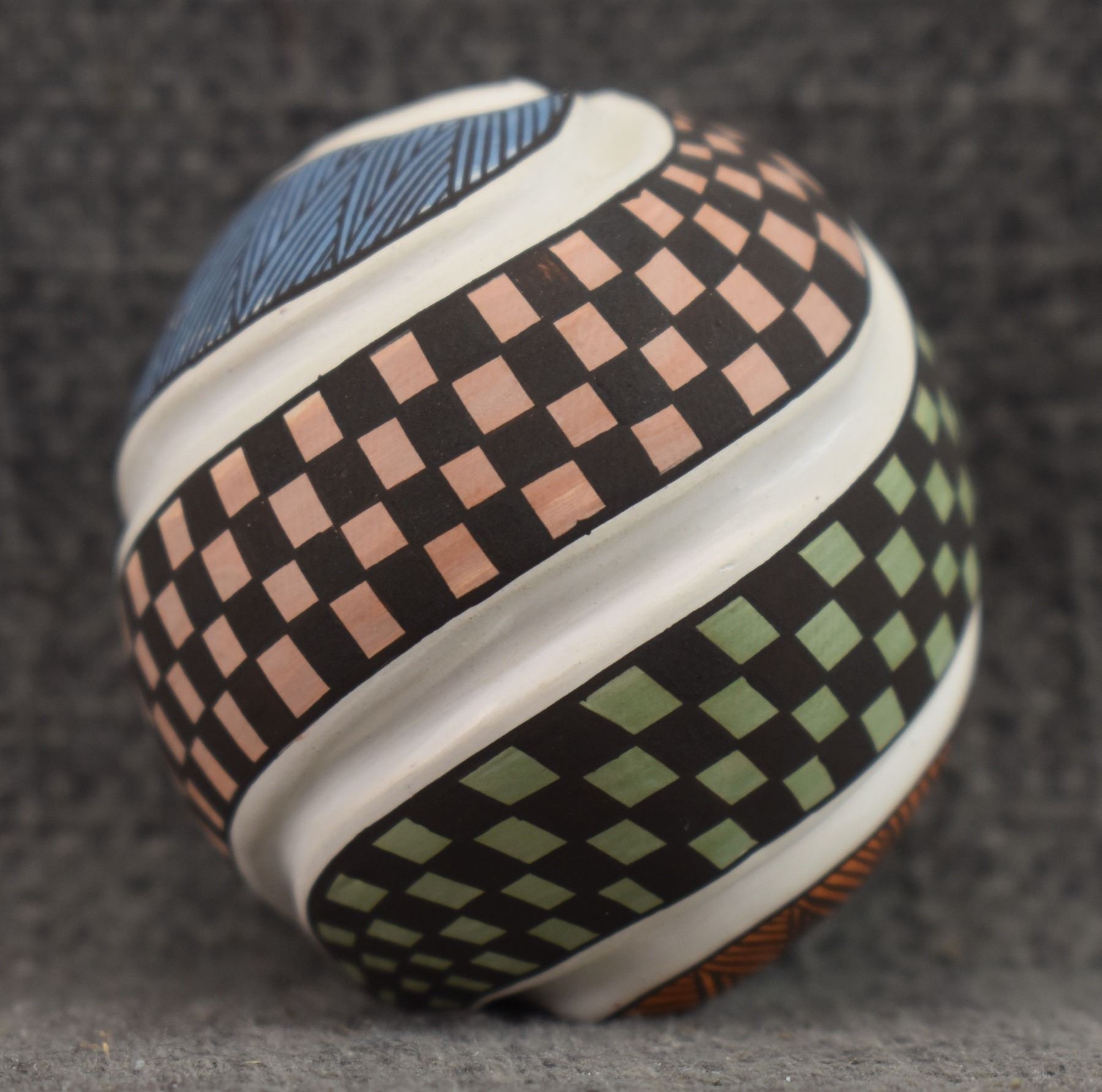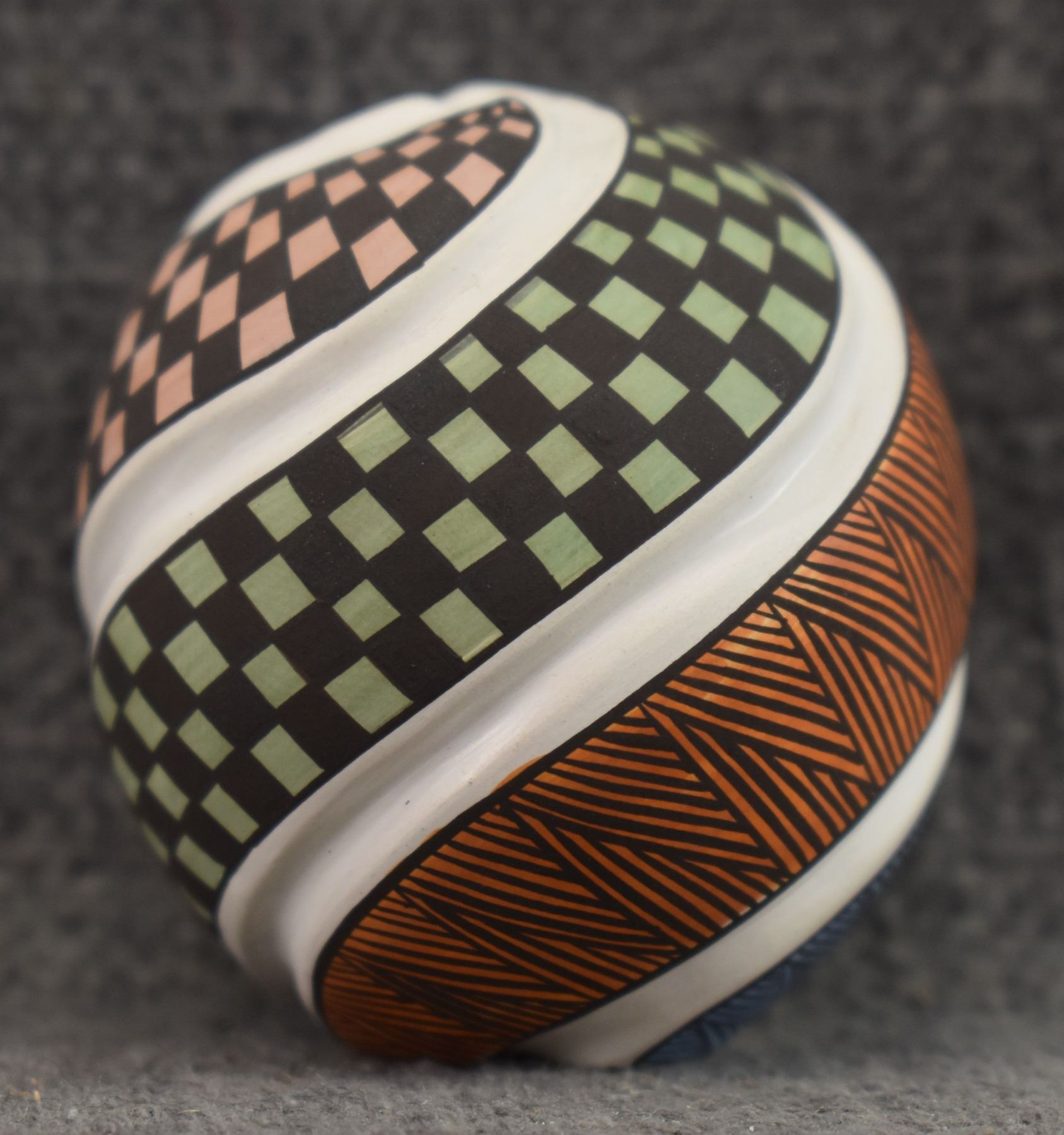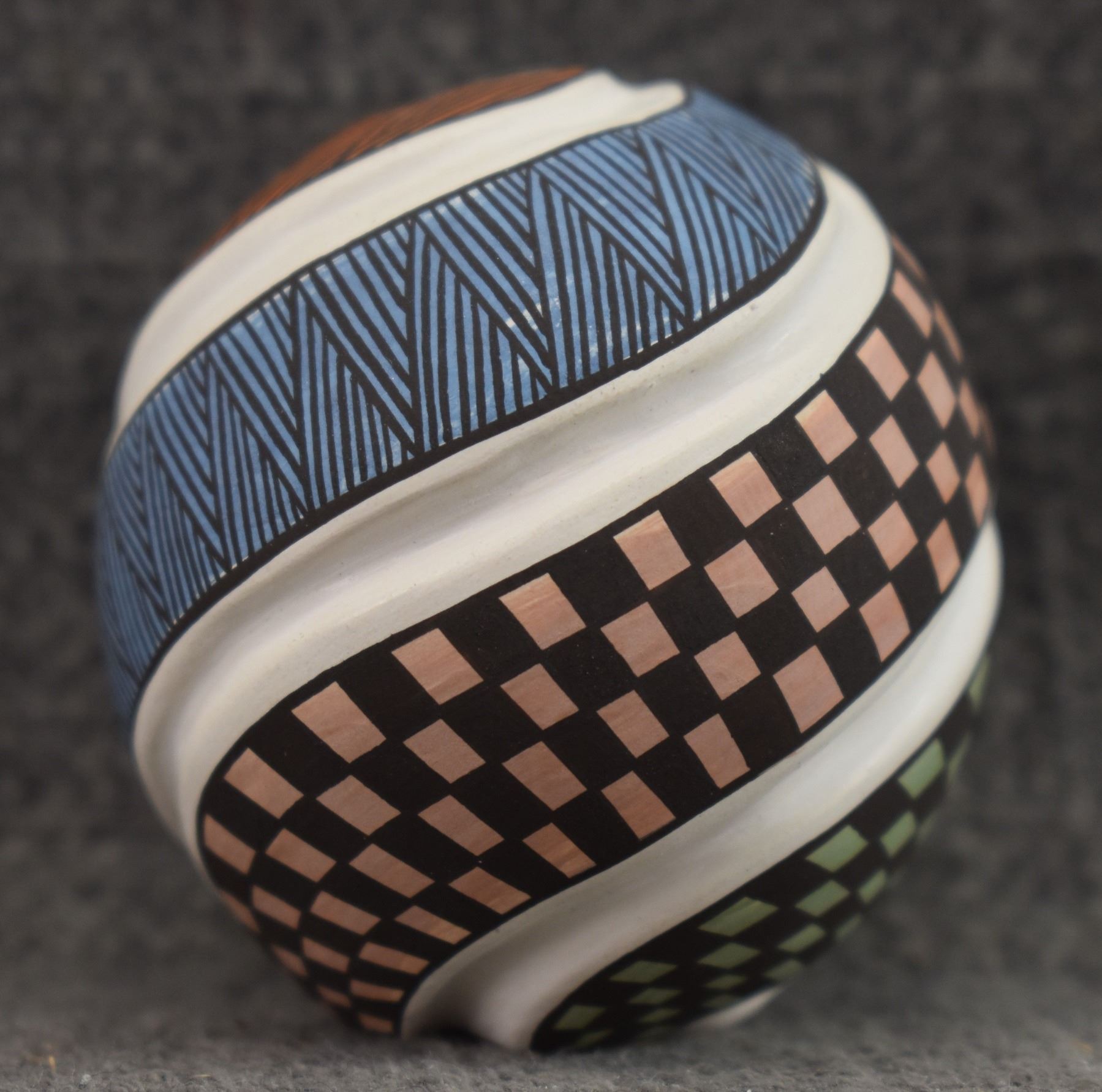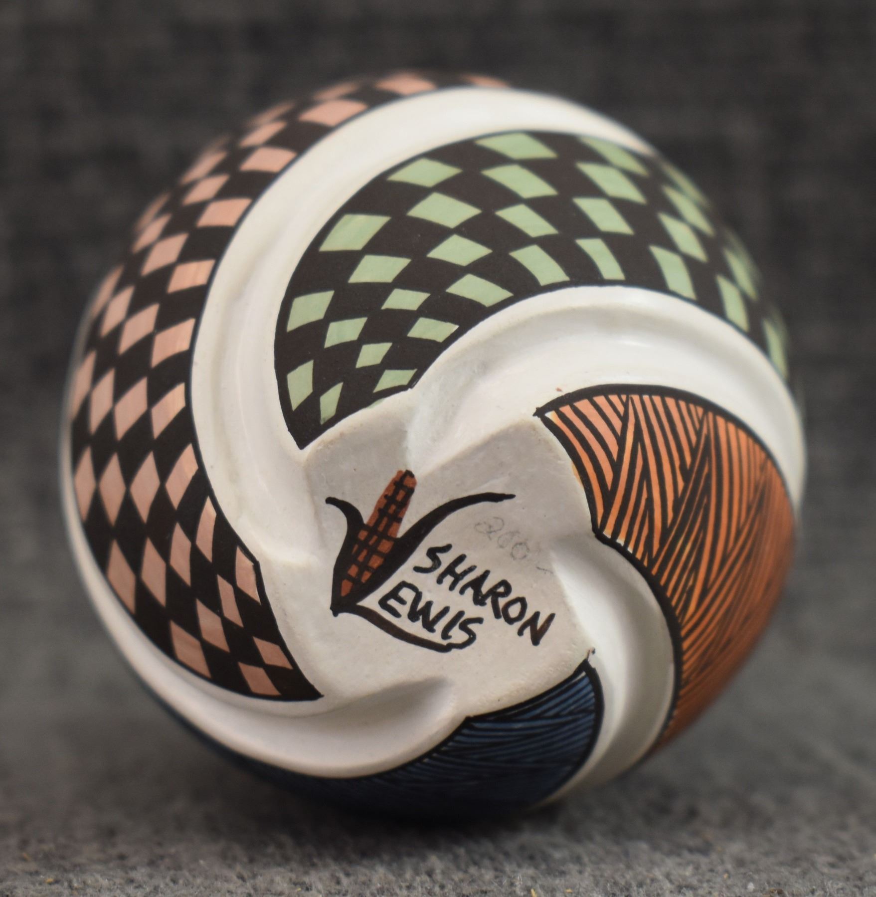 1980's Acoma. Hand coiled carved and polychrome painted design pottery seed jar. Signed Sharon Lewis. 2'' x 1.75''