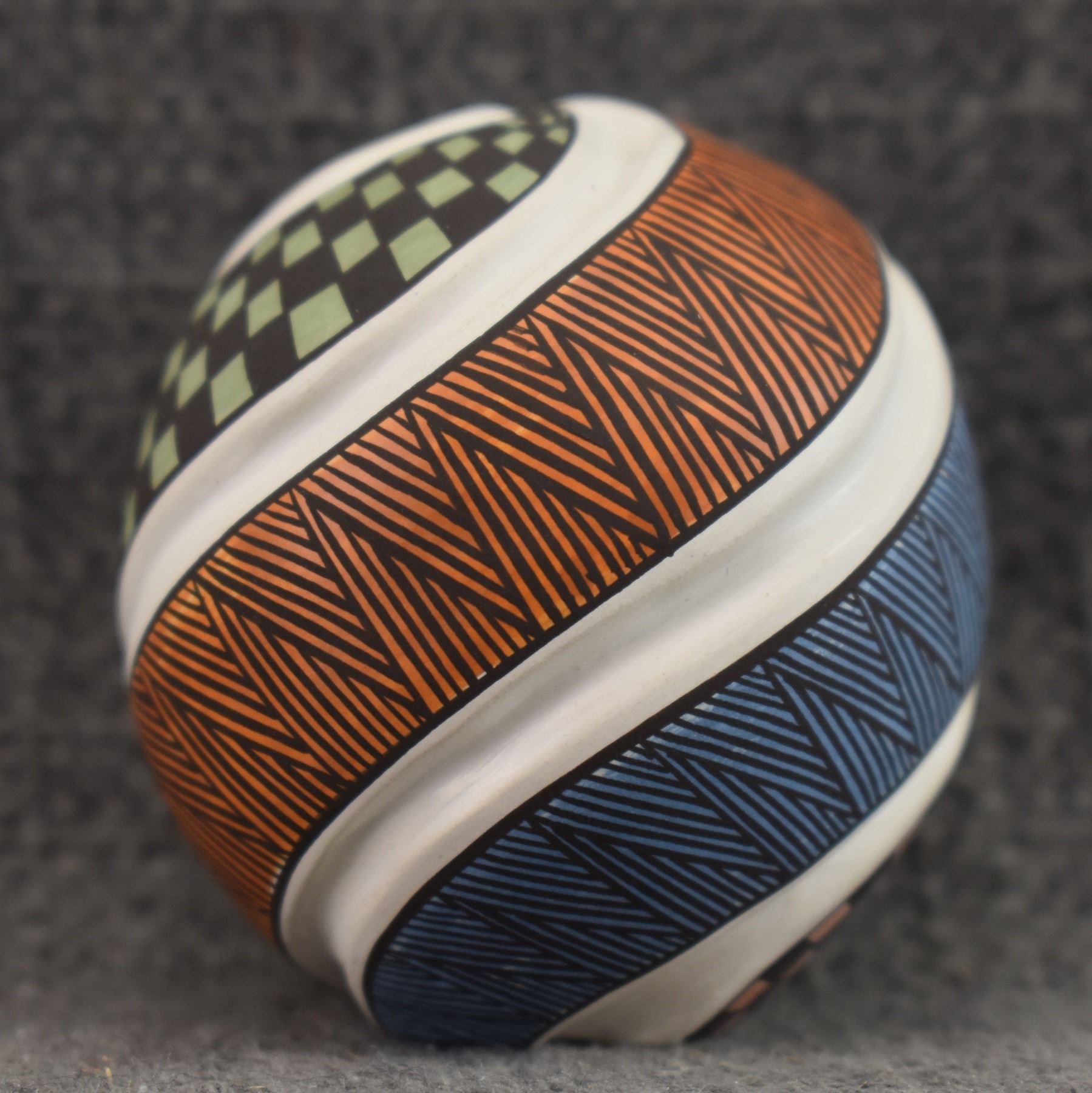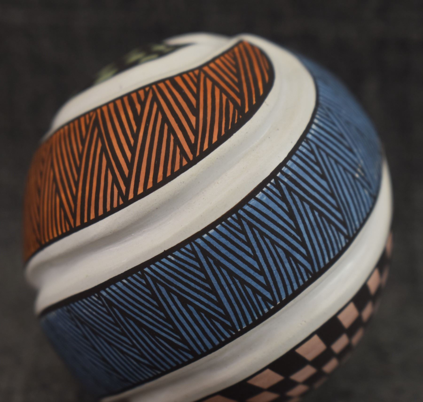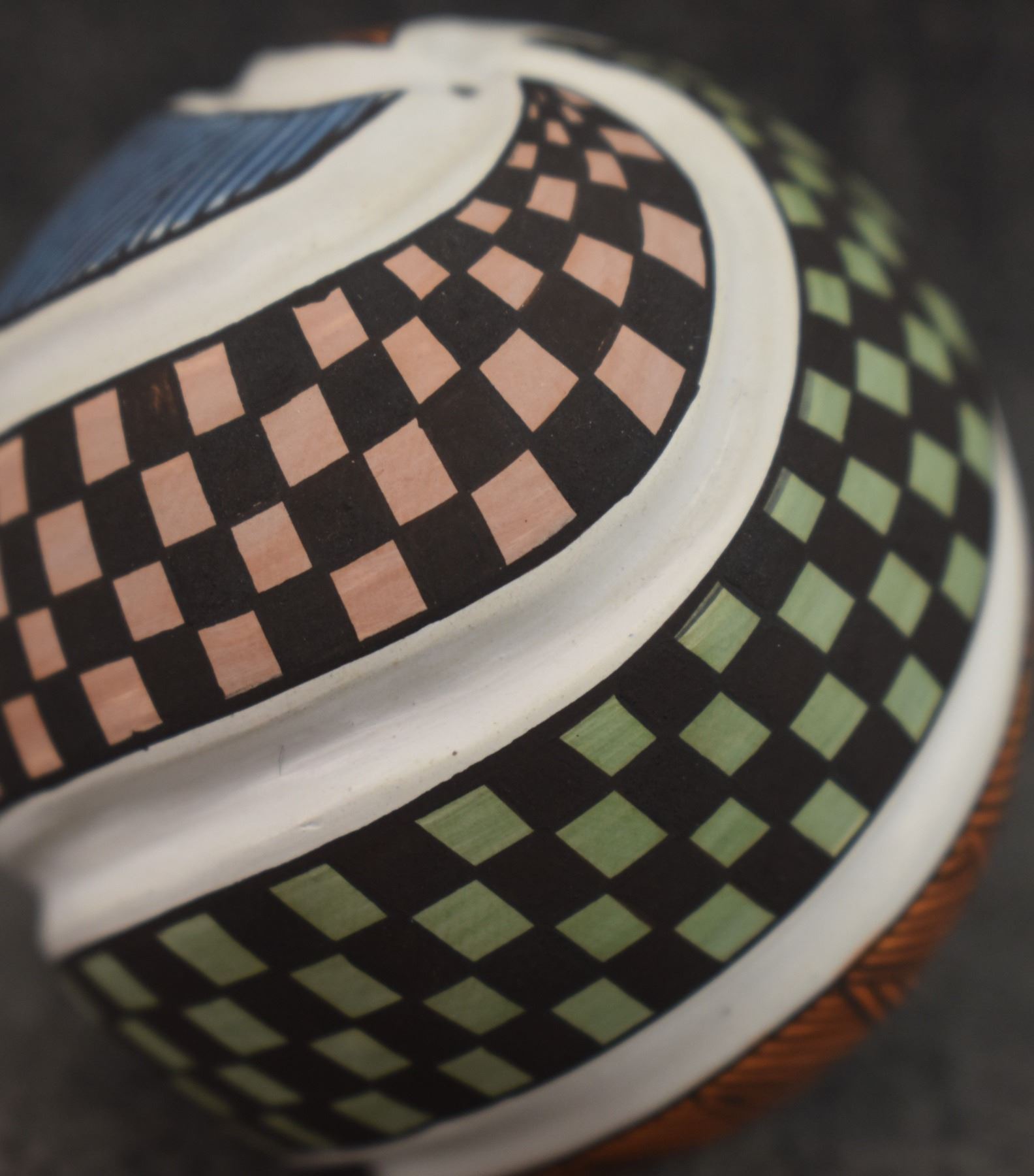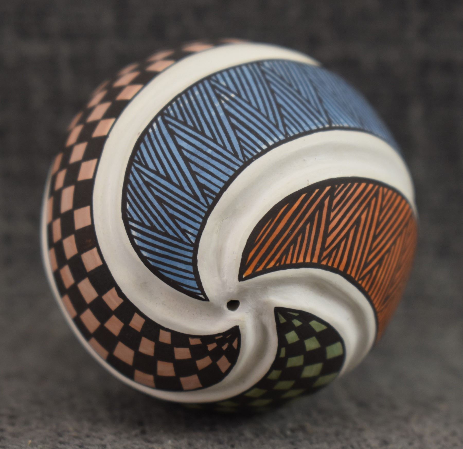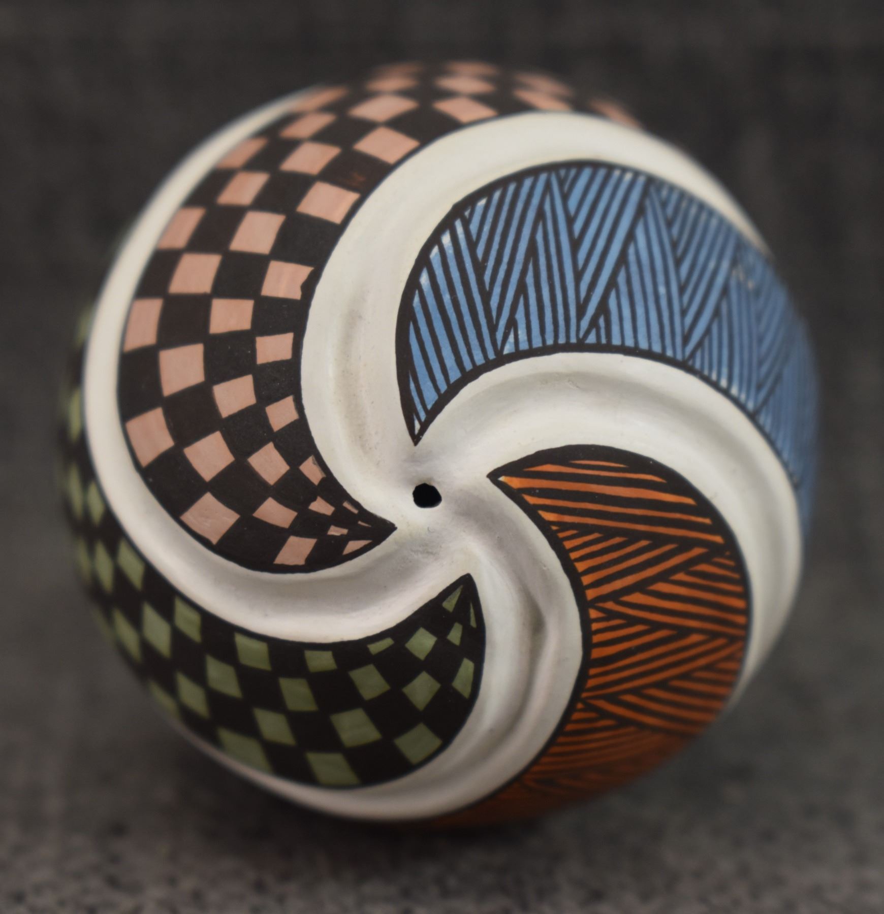 1980's Acoma. Hand coiled carved and polychrome painted design pottery seed jar. Signed Sharon Lewis. 2'' x 1.75''