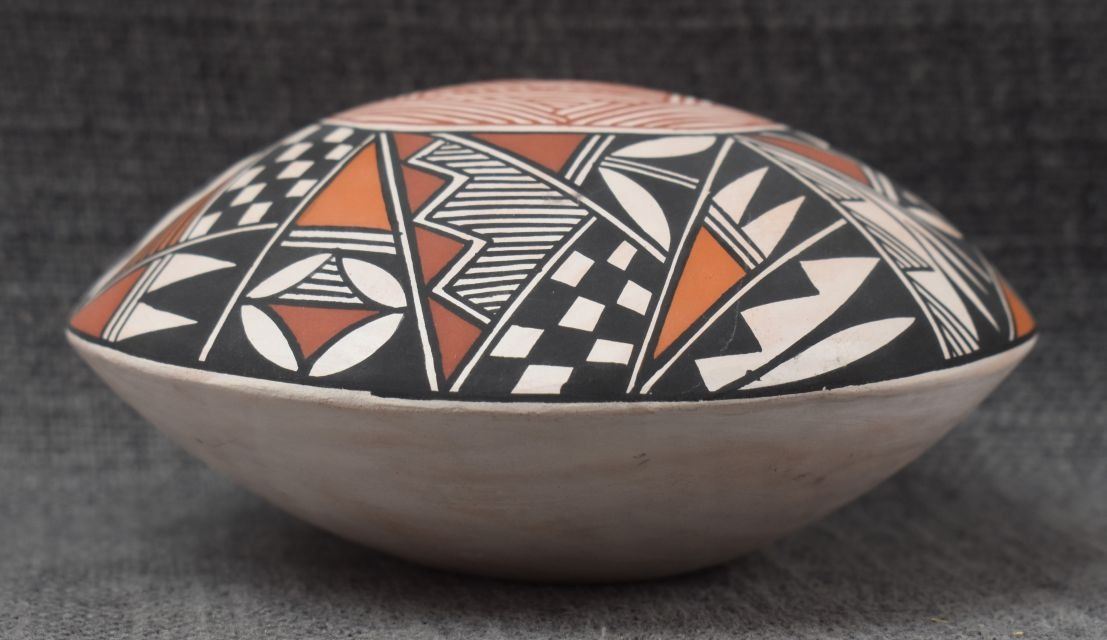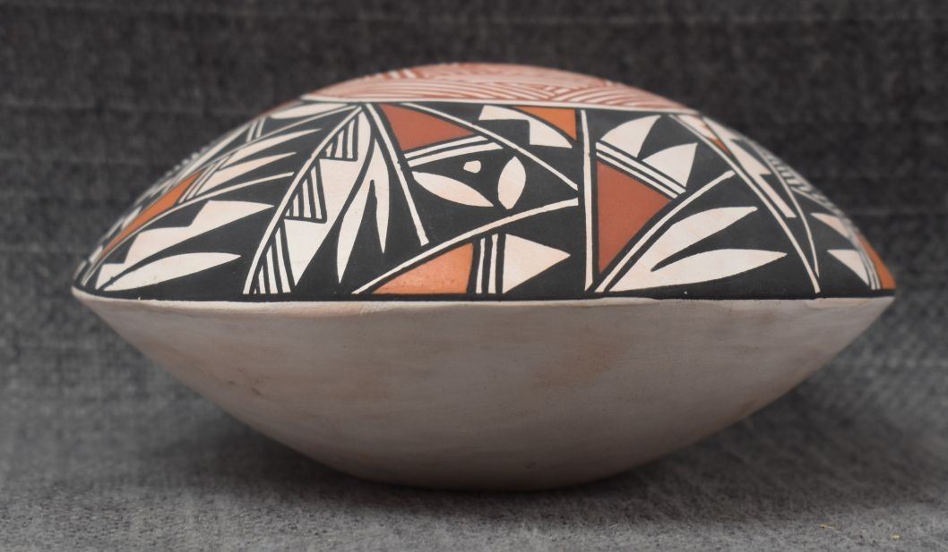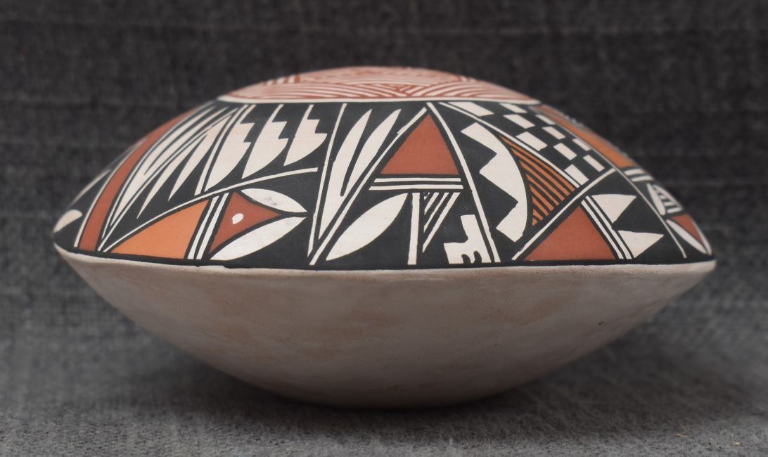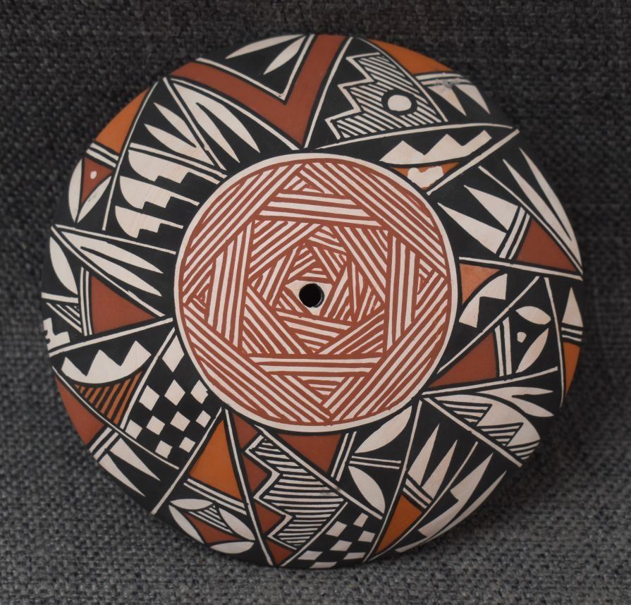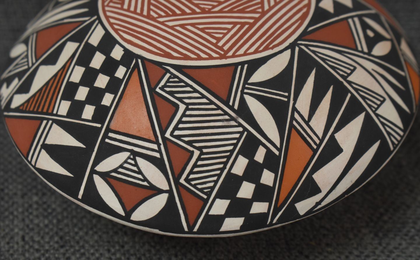1990's Acoma, hand coiled with geometric painted design signed T Salvador 2.25" x 5"