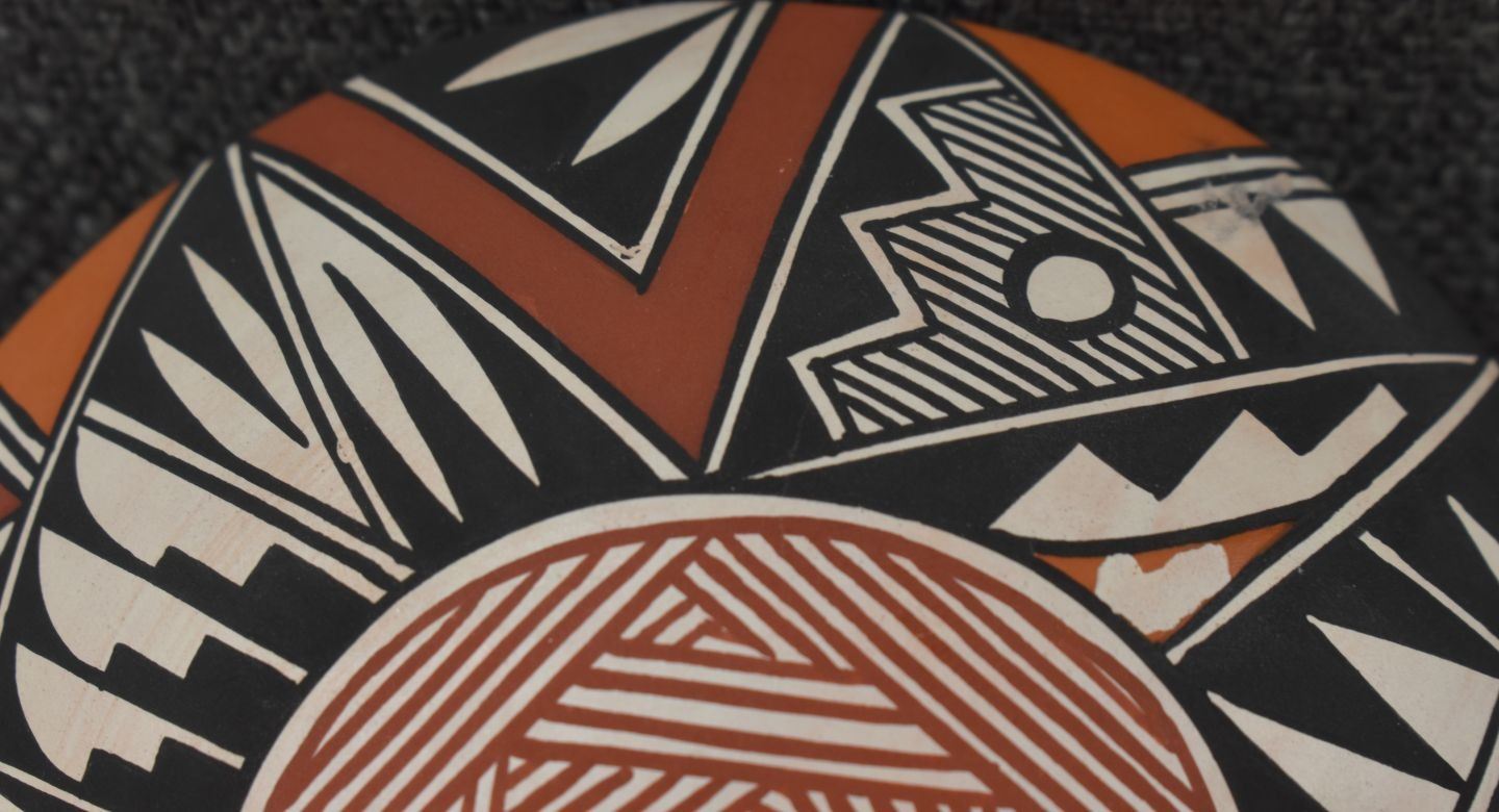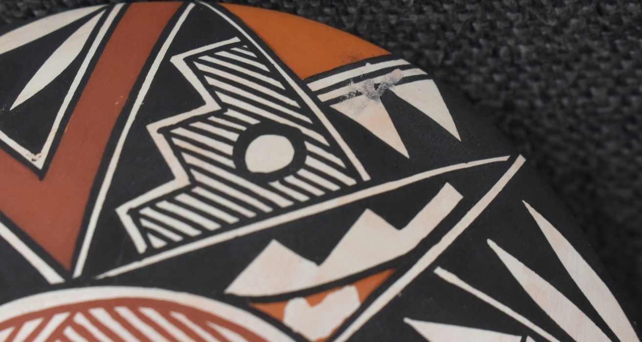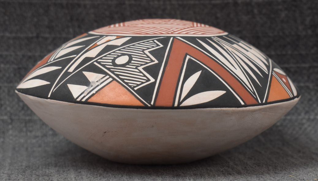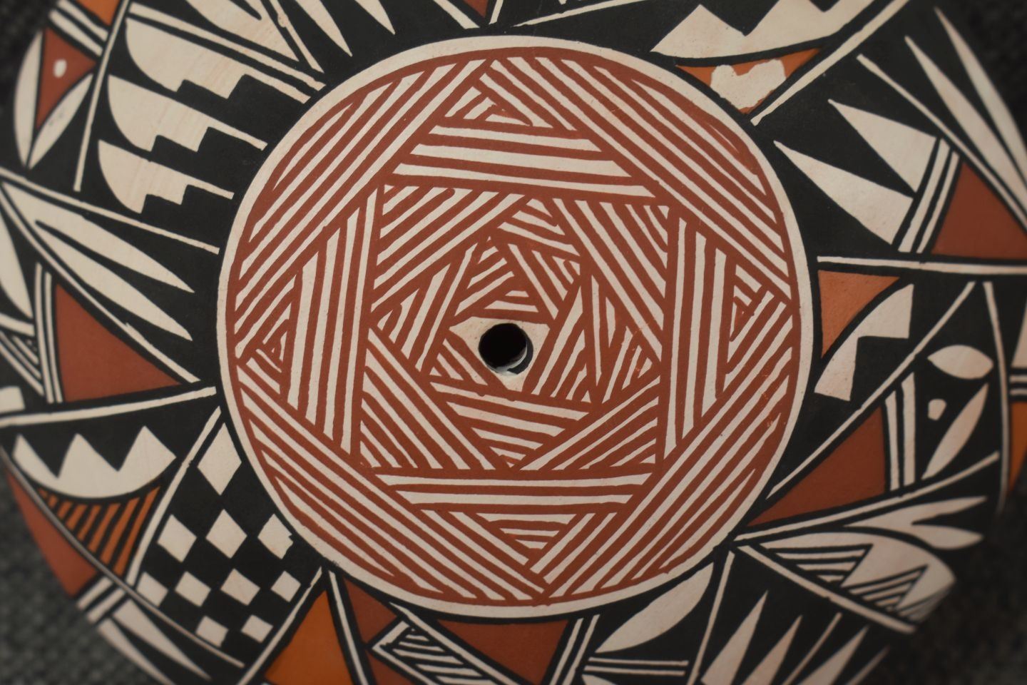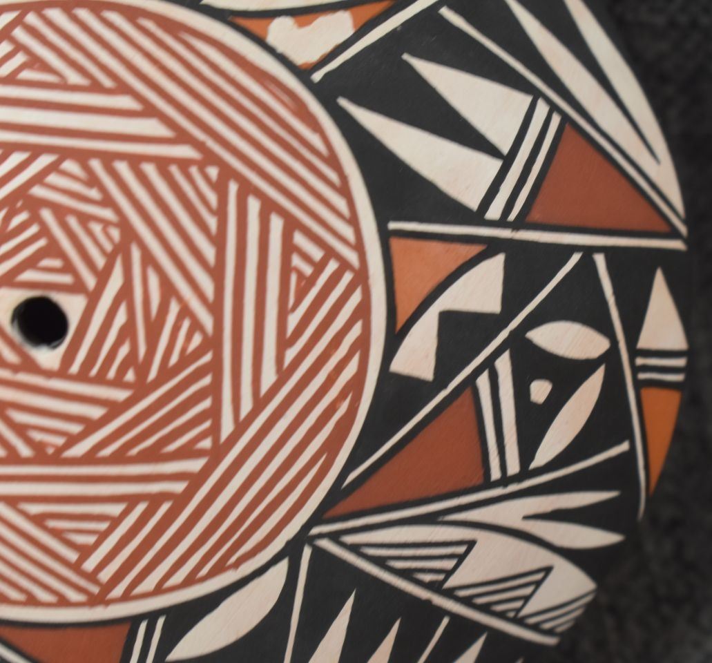 1990's Acoma, hand coiled with geometric painted design signed T Salvador 2.25" x 5"