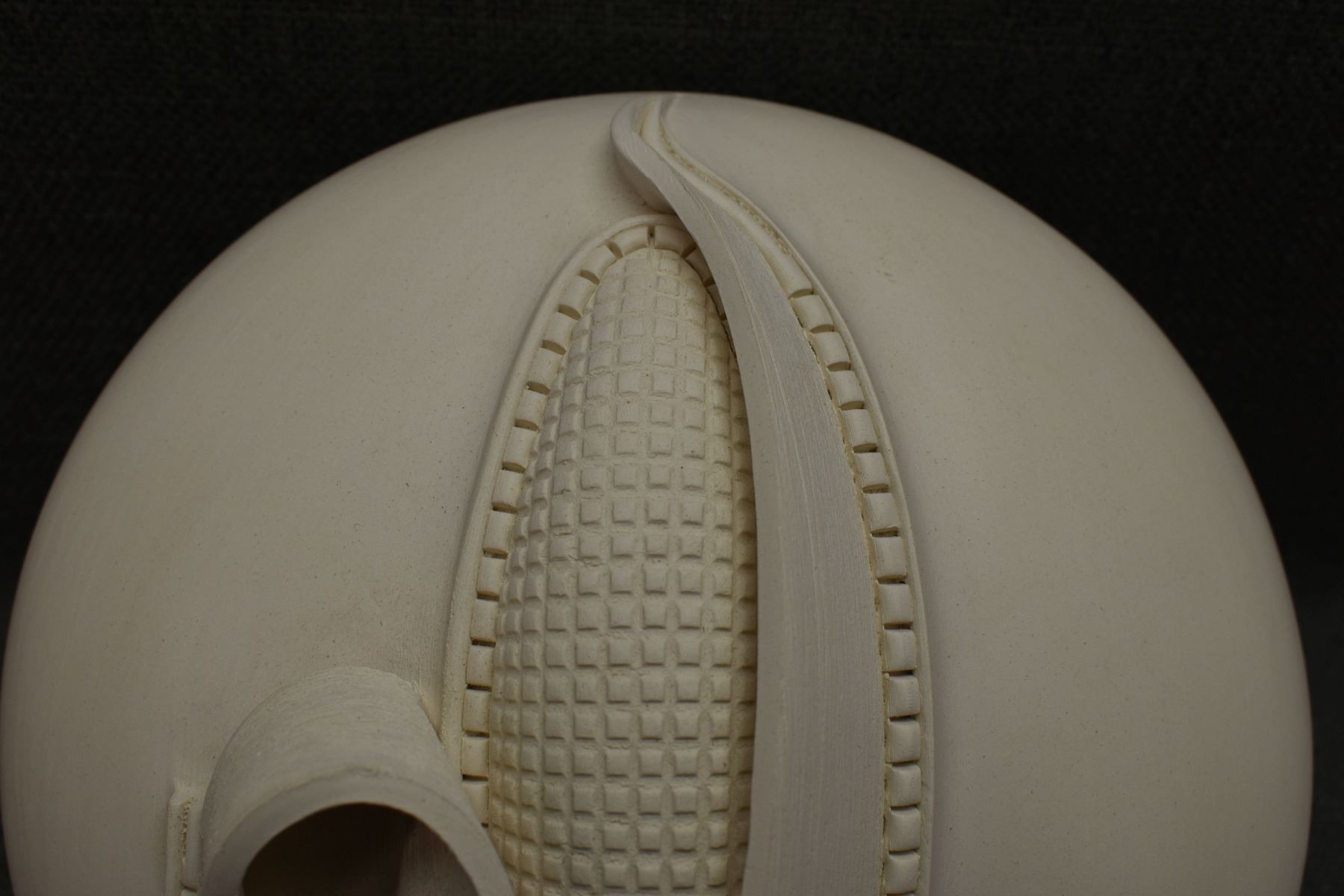 1990's Acoma. Hand coiled and carved corn cob design pottery seed jar signed W. Garcia. 7'' x 8''