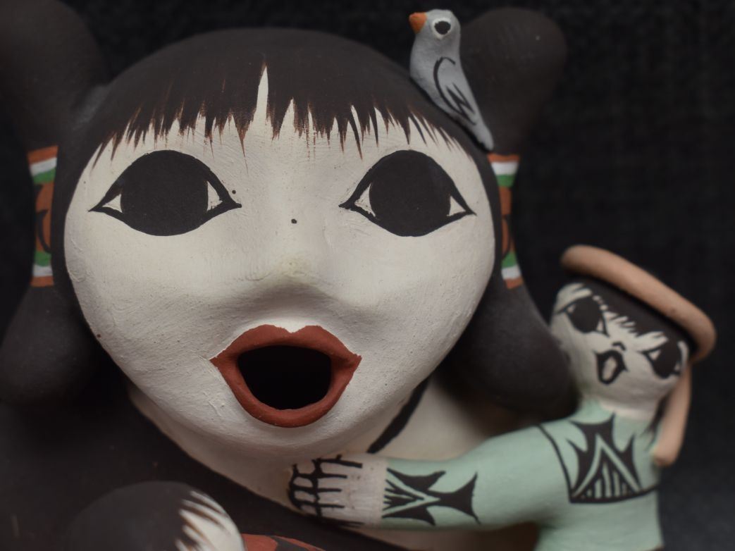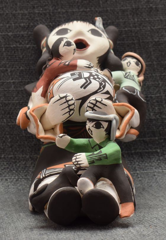1990's Acoma . Hand coiled and painted pottery story teller signed M Henderson. 5.5'' x 5'' x 4''