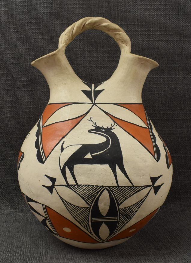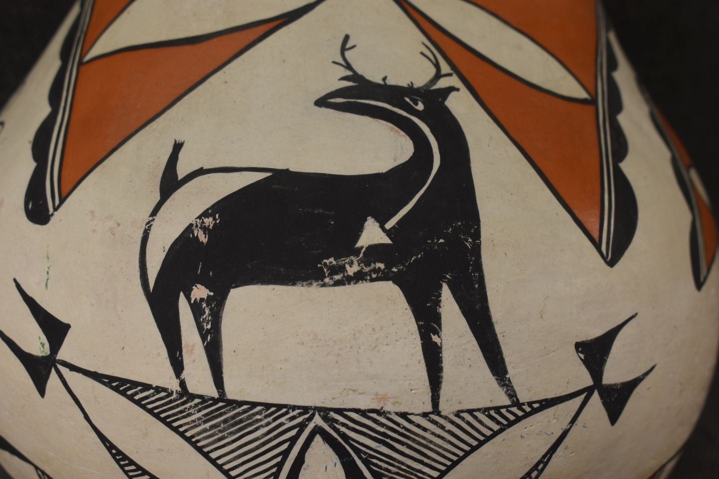 1960's Acoma, hand coiled with polychrome painted heartline deer, butterfly, and geometric design signed EV 12" x 8"