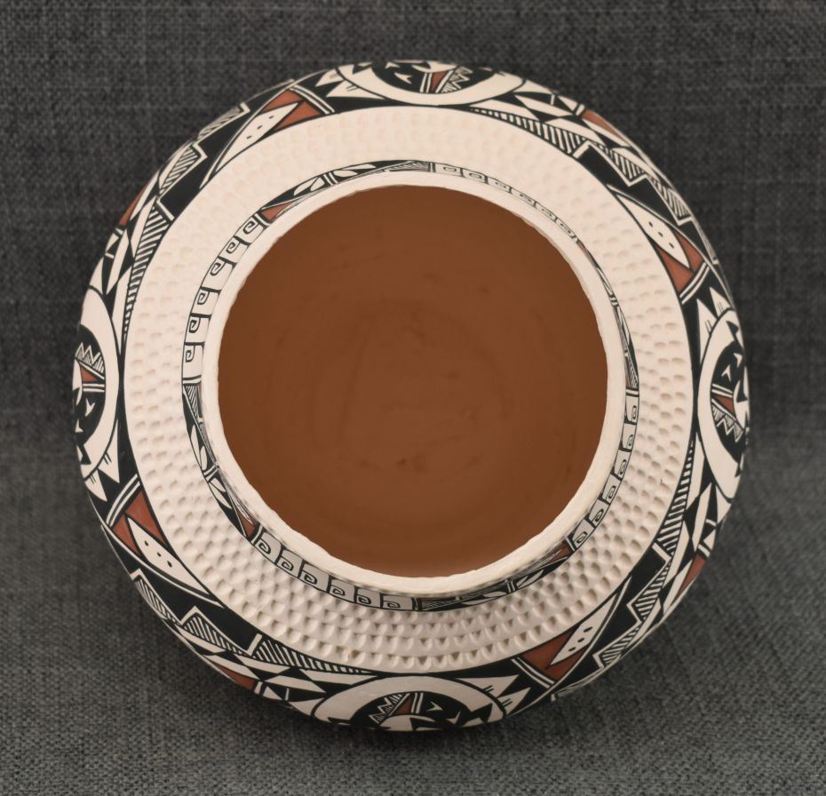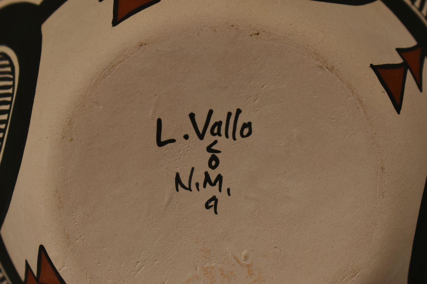1990's Acoma, hand coiled with polychrome painted geometric and animal design with corrugated bands by L Vallo 7.5" x 7.5"