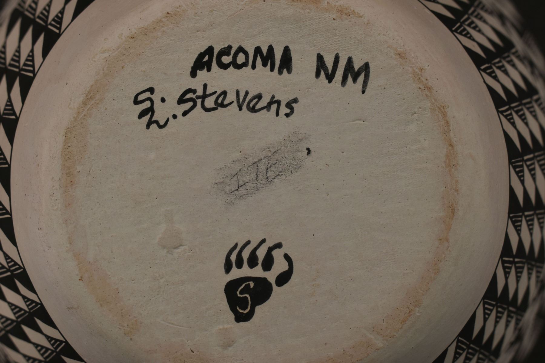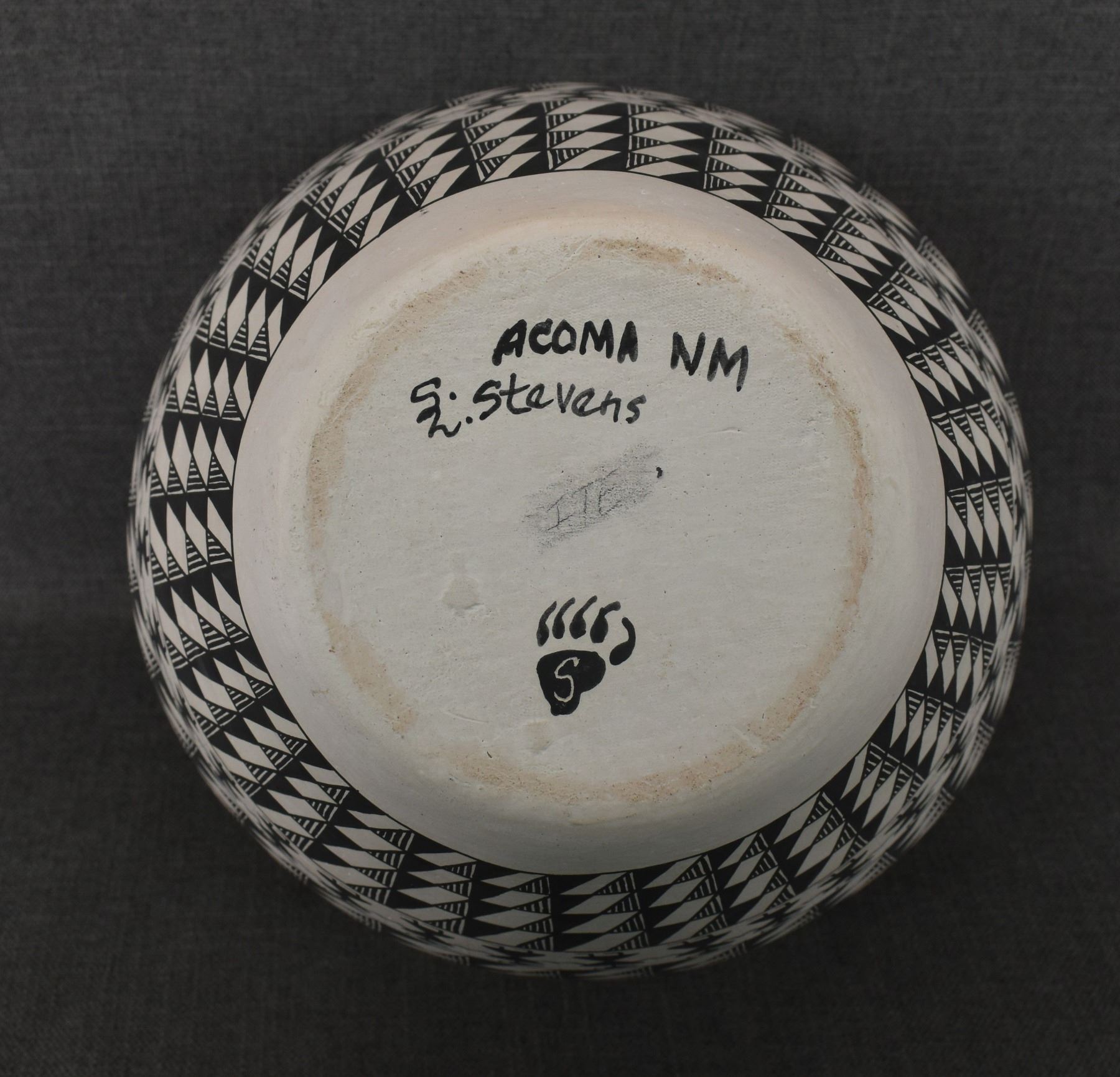 1990's Acoma, hand coiled and painted design signed SL Stevens, 14.5" x 14"