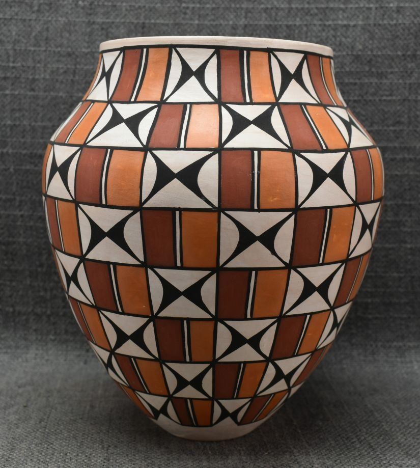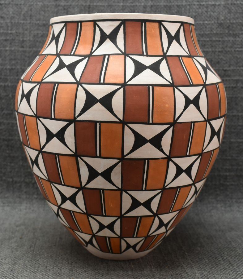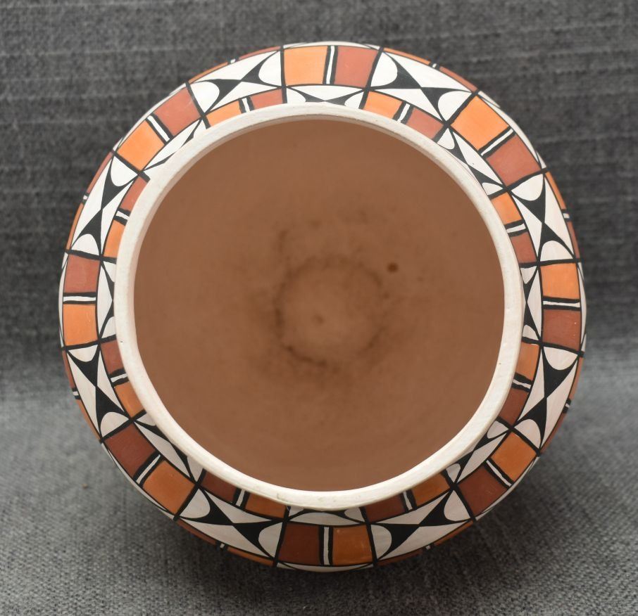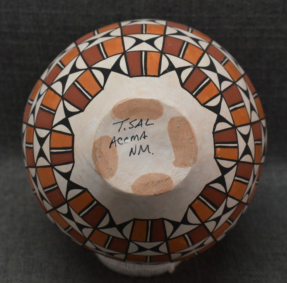 1990's Acoma. Hand coiled and painted polychrome design pottery vase. Signed T. Sal. 7'' x 7''