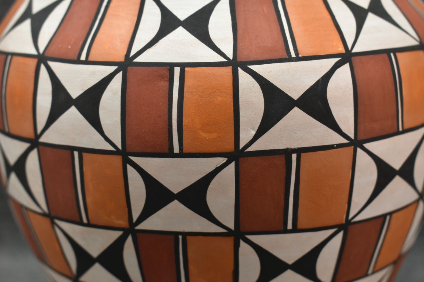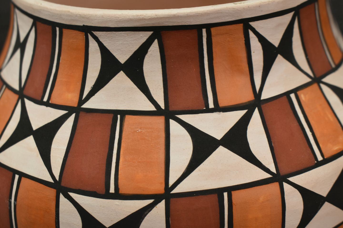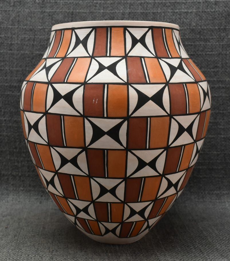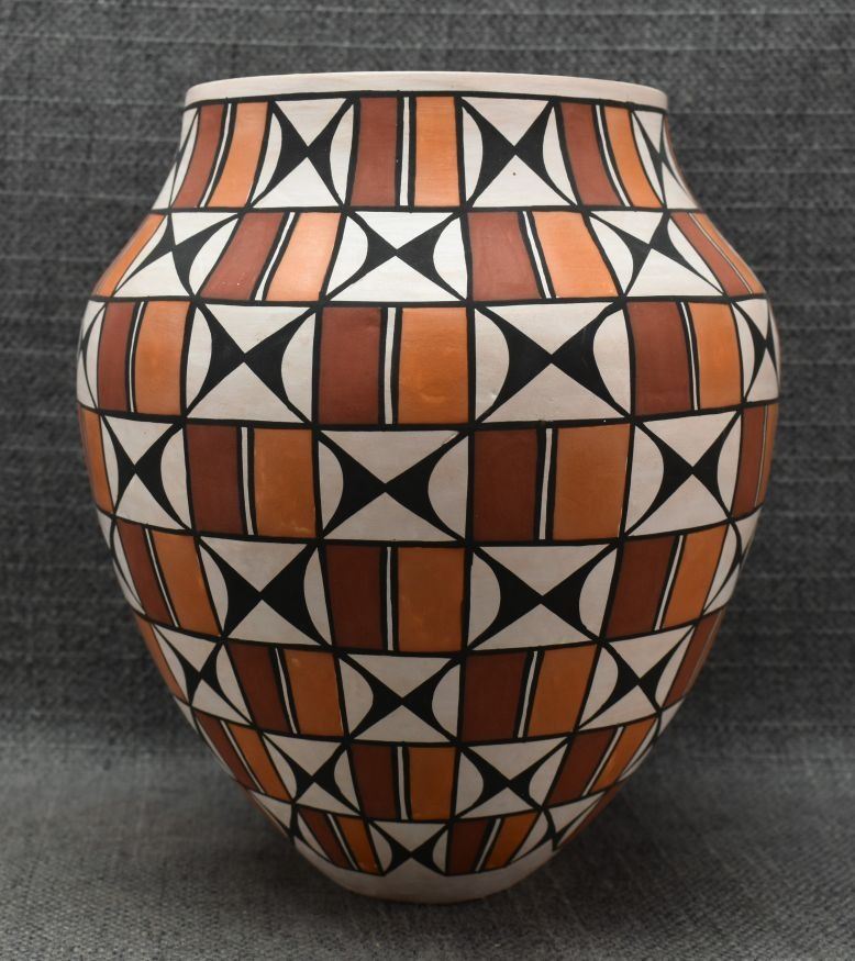 1990's Acoma. Hand coiled and painted polychrome design pottery vase. Signed T. Sal. 7'' x 7''