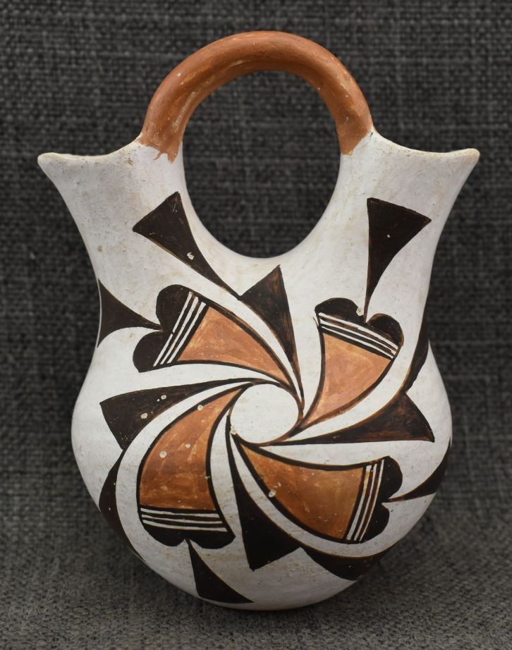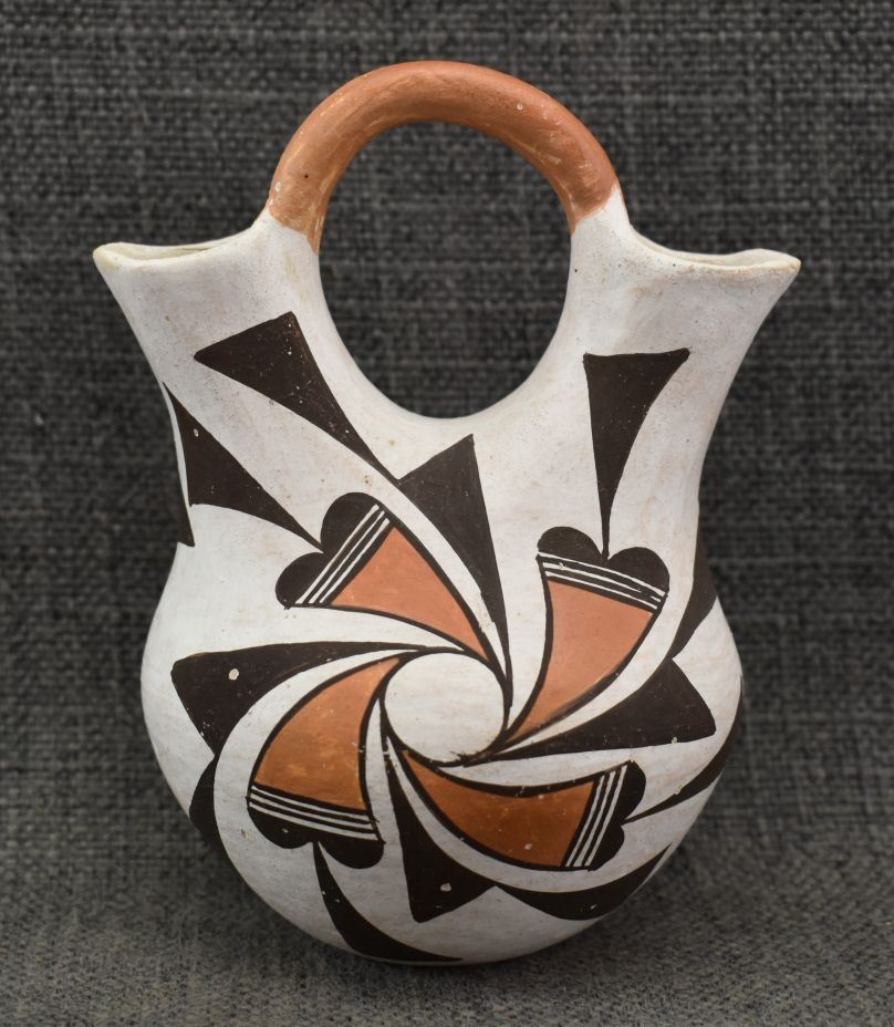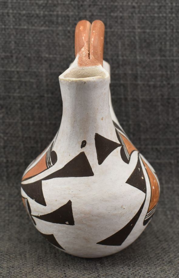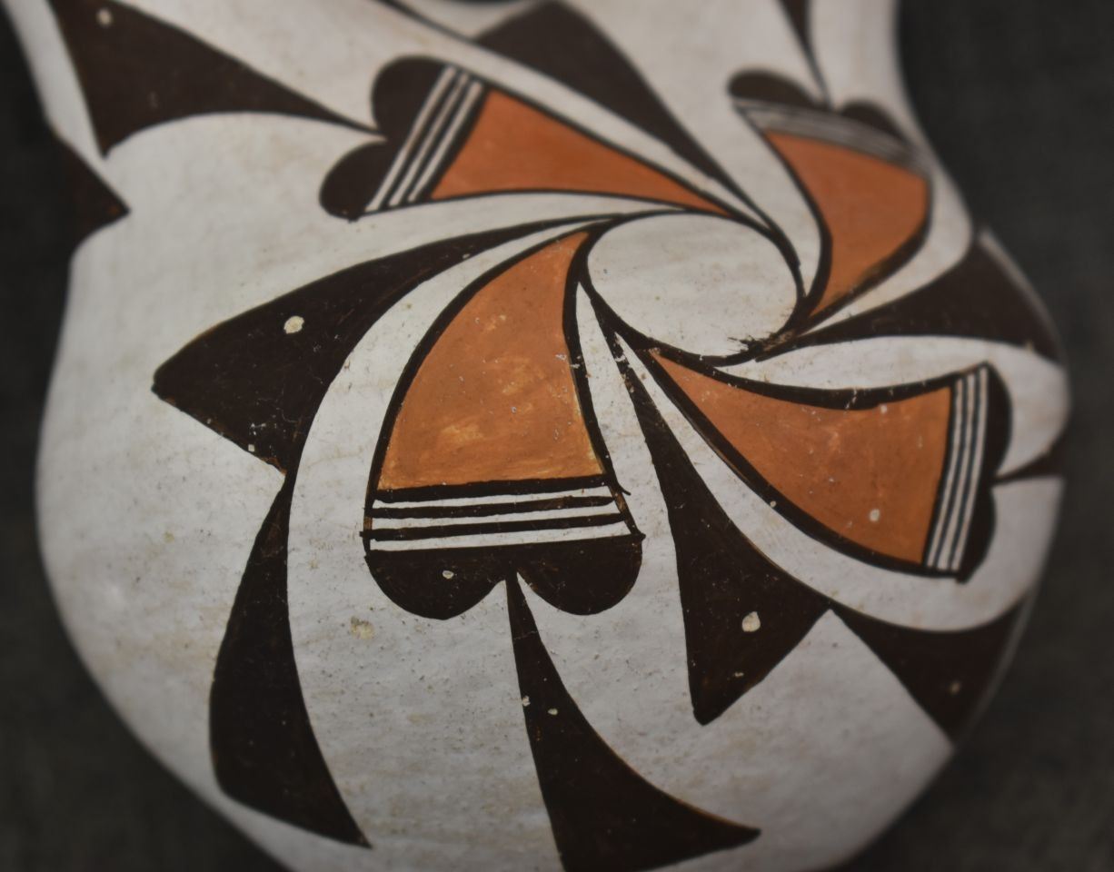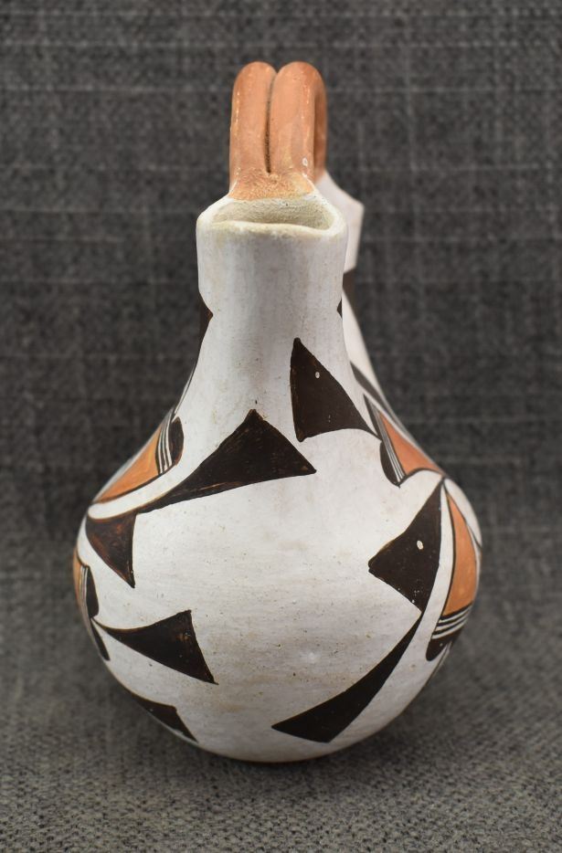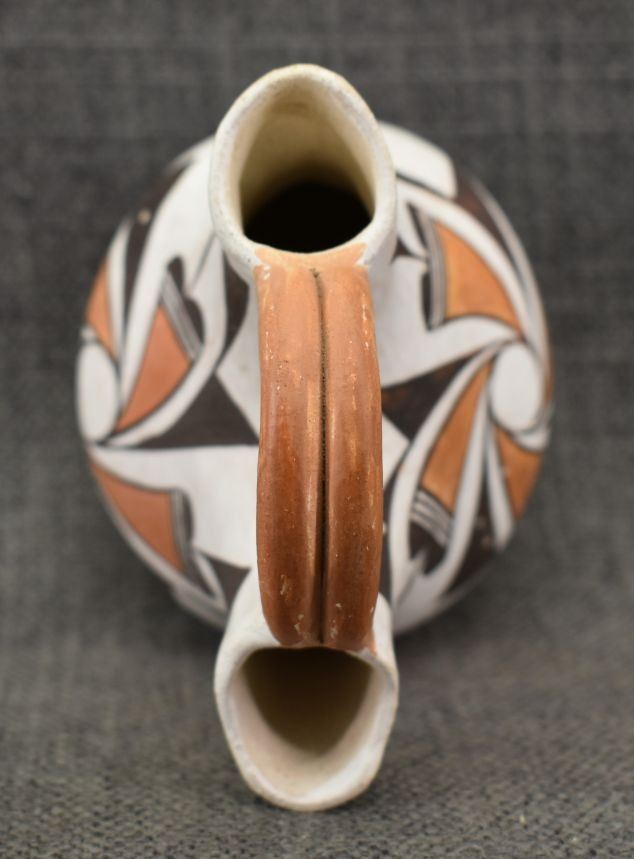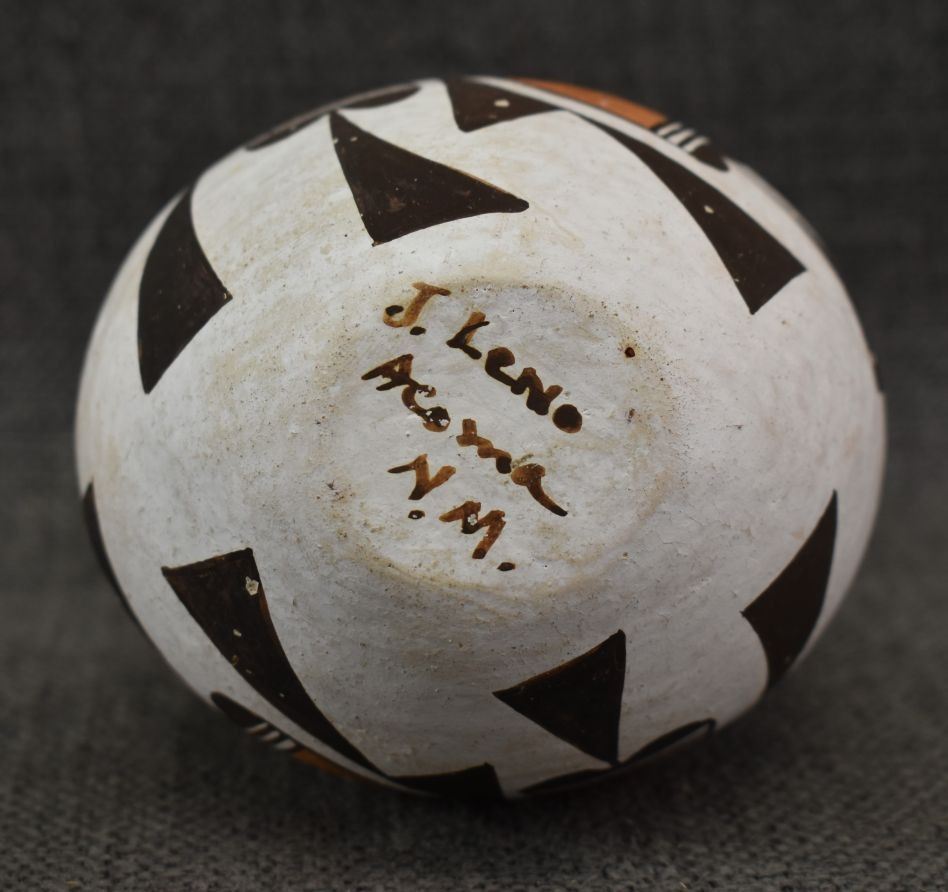 1950-60's Acoma, hand coiled with polychrome painted design signed J Leno 5.5" x 4"