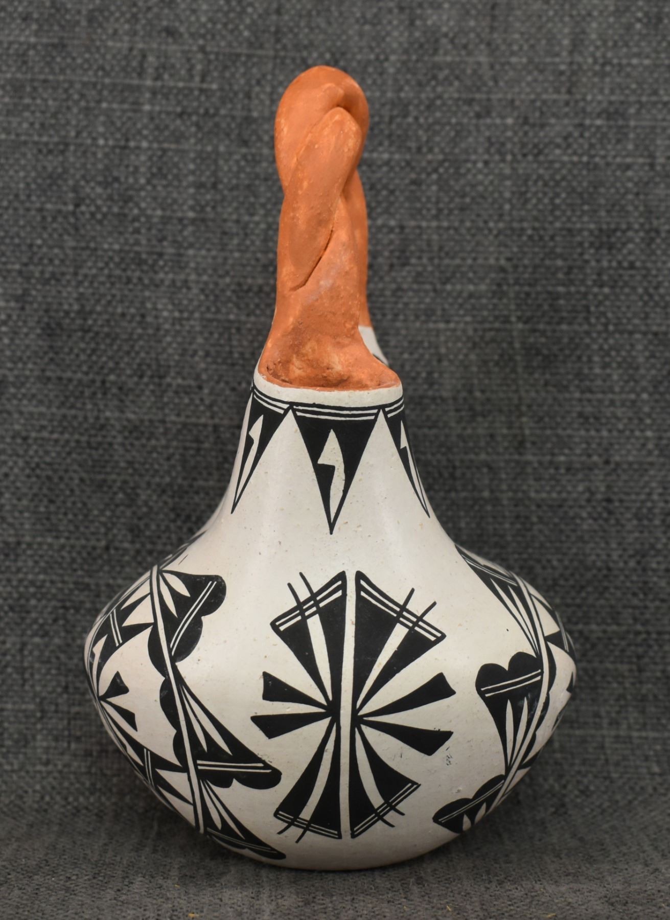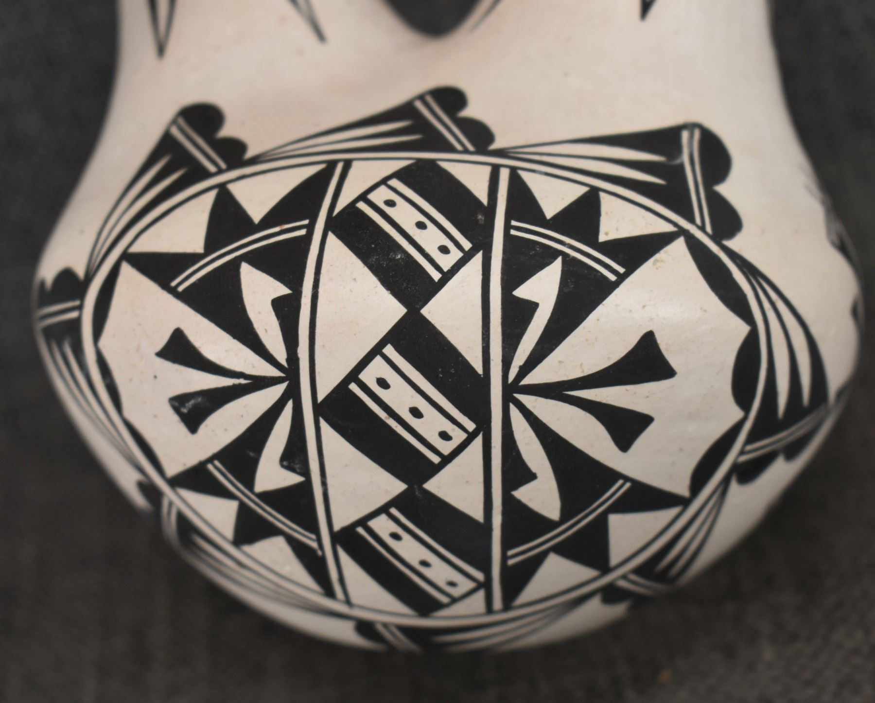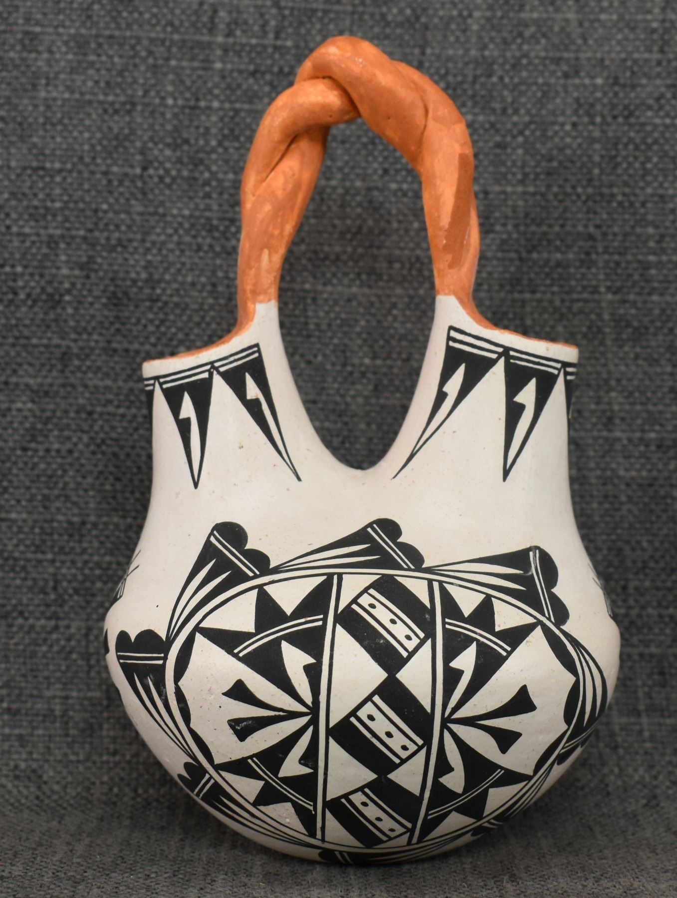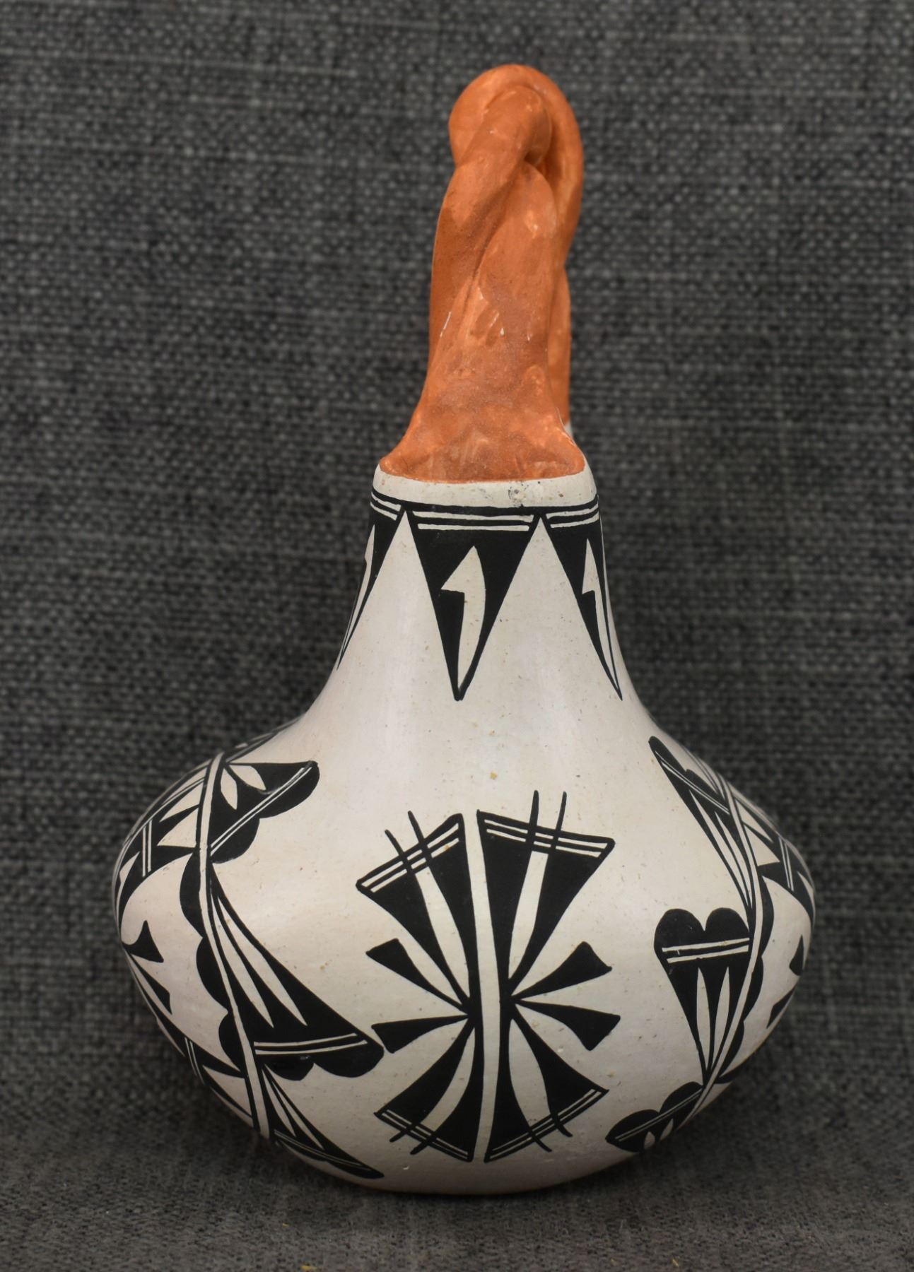 1970's Acoma . Hand coiled and painted busy design pottery wedding vase, signed June Pino. 8'' x 4.5''