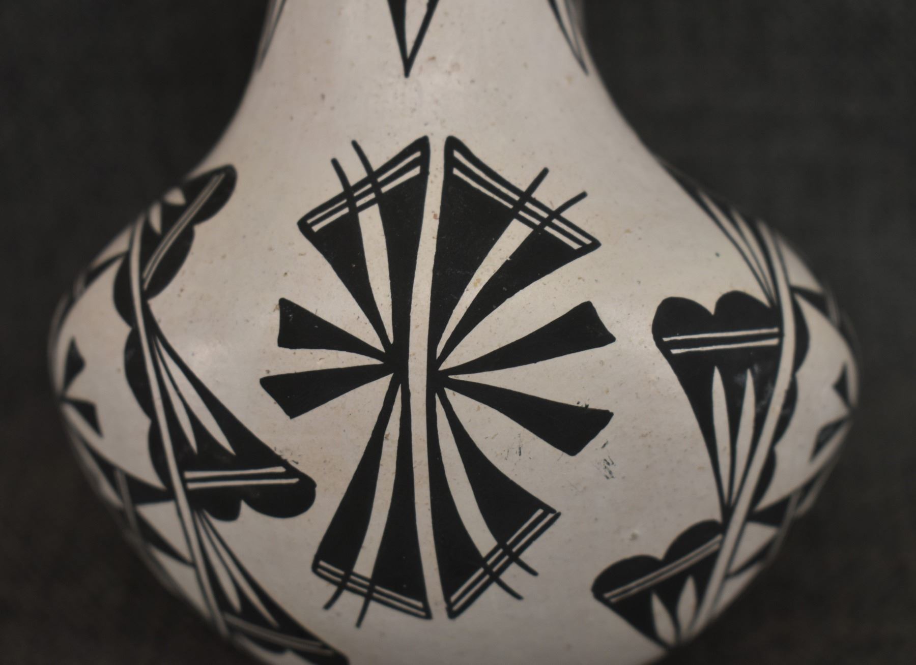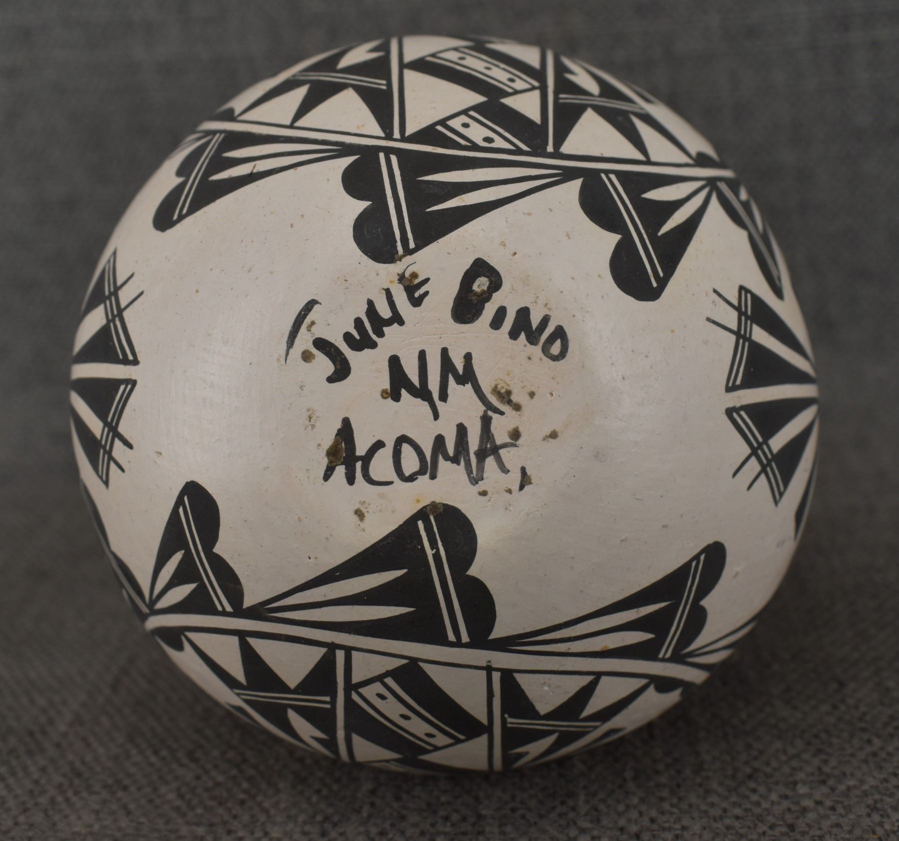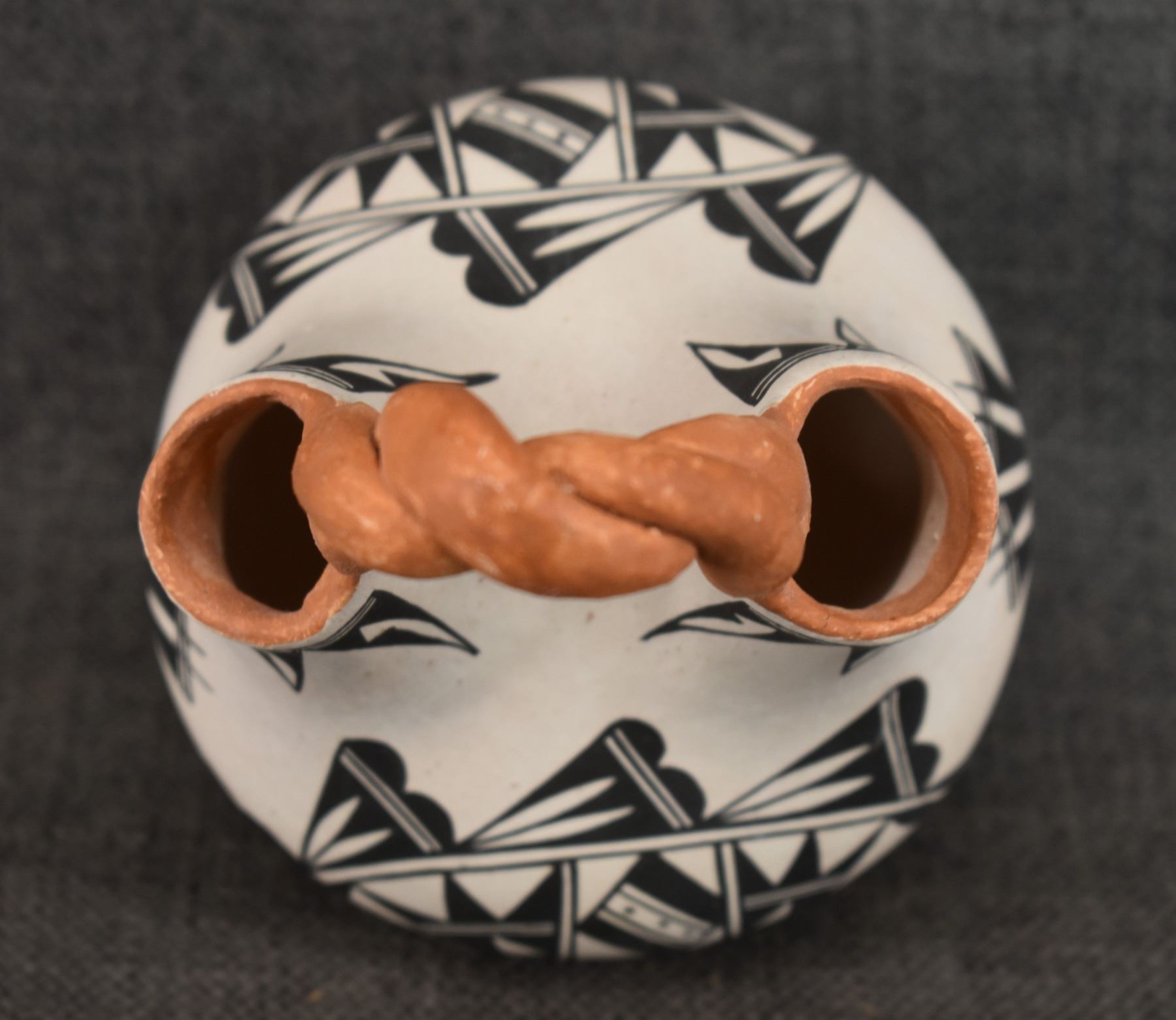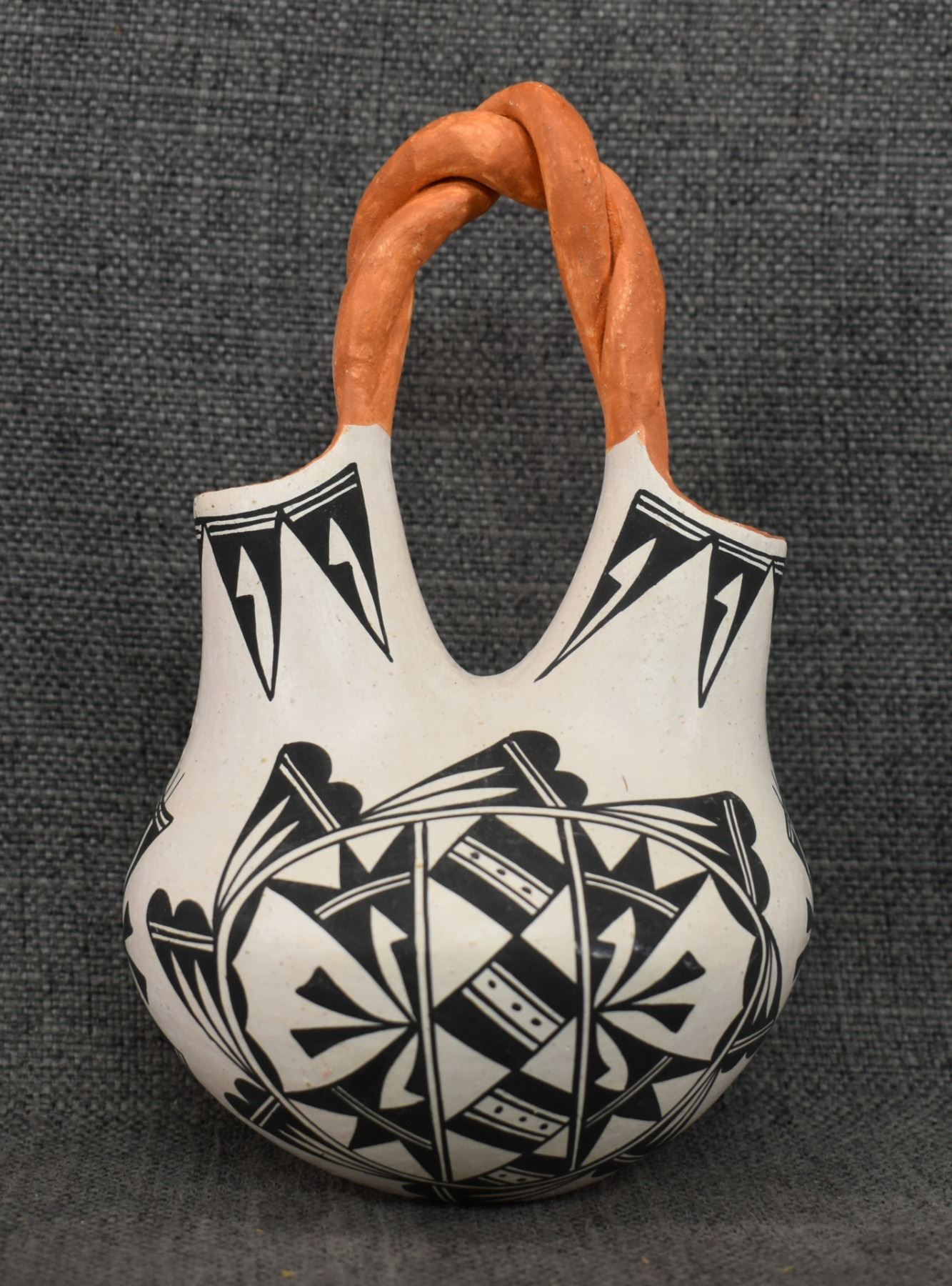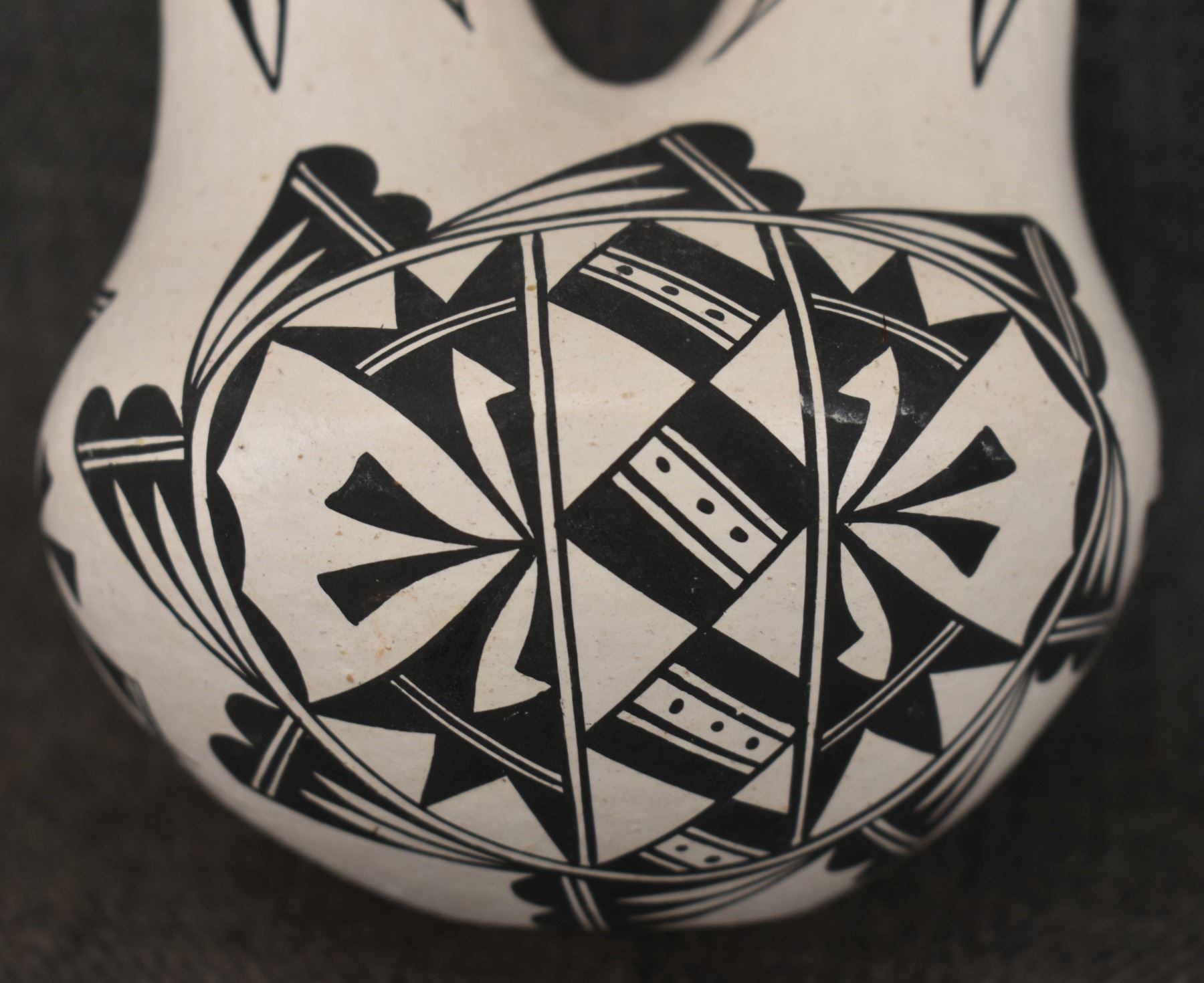1970's Acoma . Hand coiled and painted busy design pottery wedding vase, signed June Pino. 8'' x 4.5''