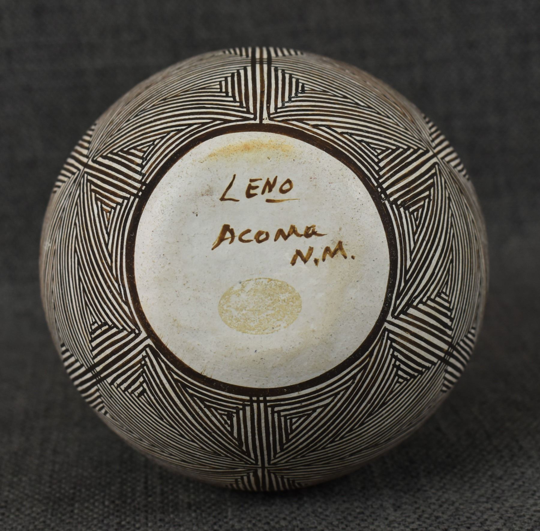 1970's Acoma hand coiled with fine line painted design signed Leno. 8" x 5"
