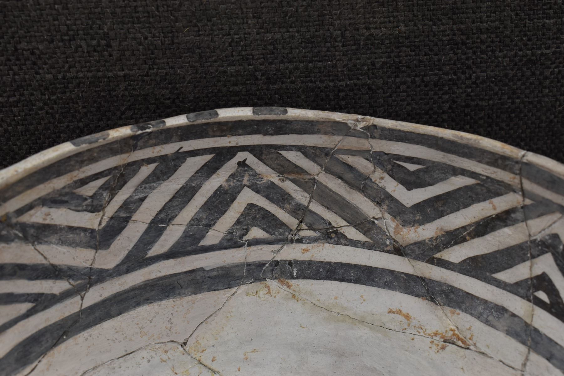 prehistoric. Anasazi. Hand coiled an painted black on white design pottery bowl. 3'' x 8'' has restoration