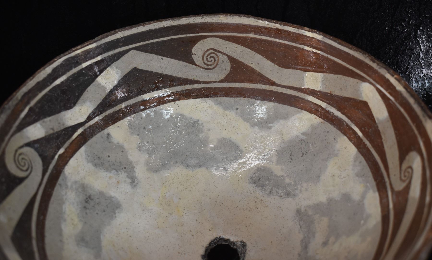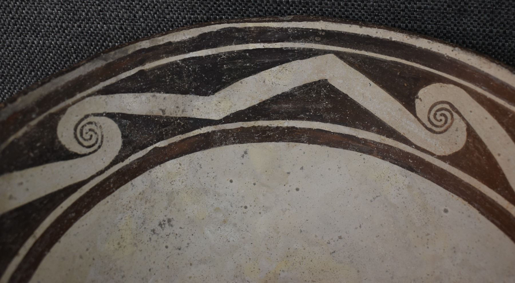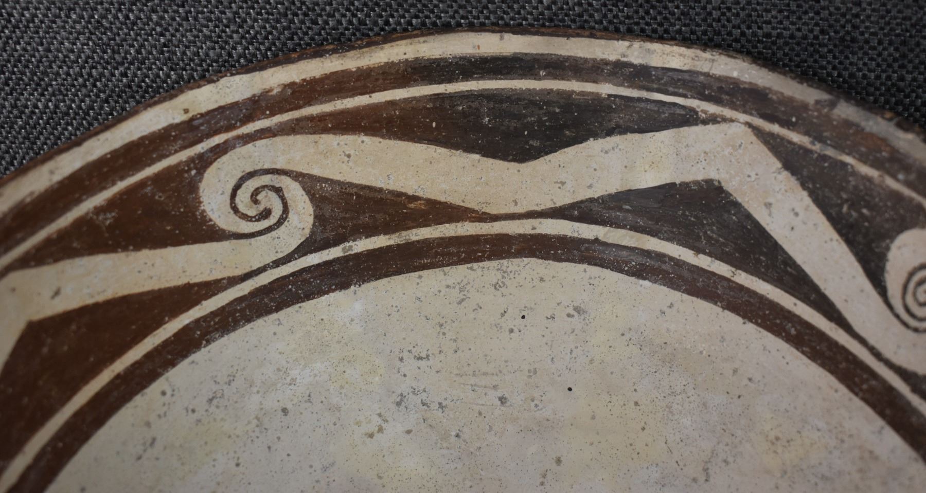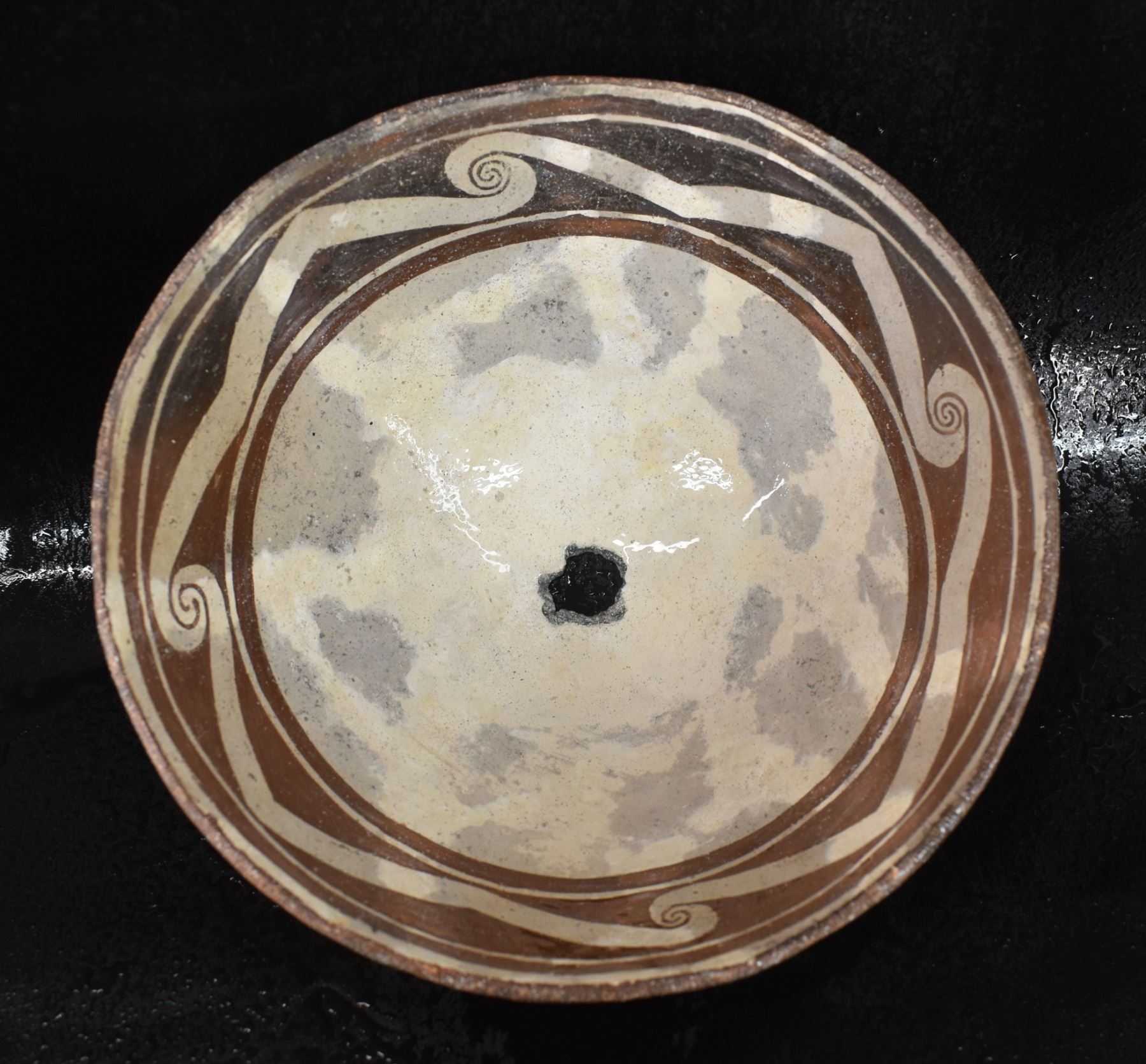prehistoric Mimbres, hand coiled with black on white painted design 4.5" x 10", has restoration