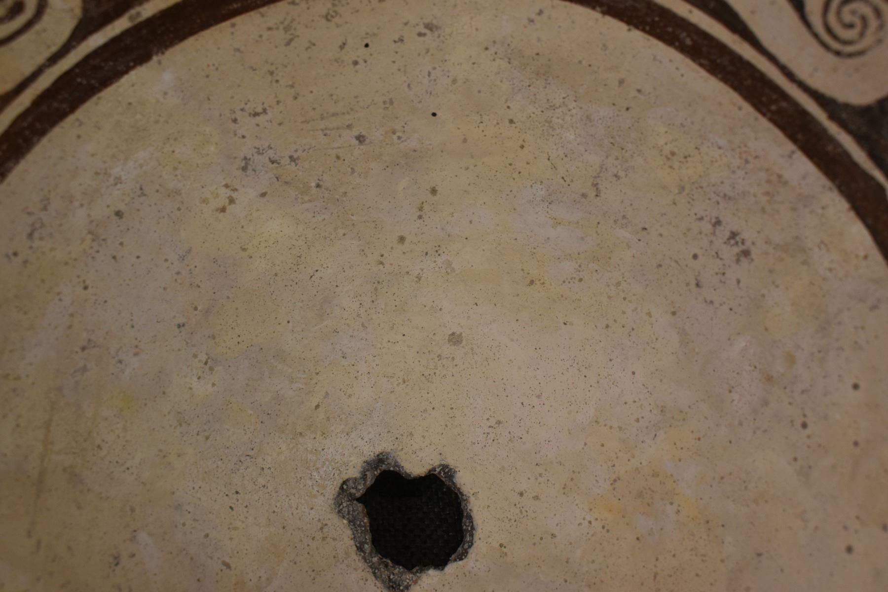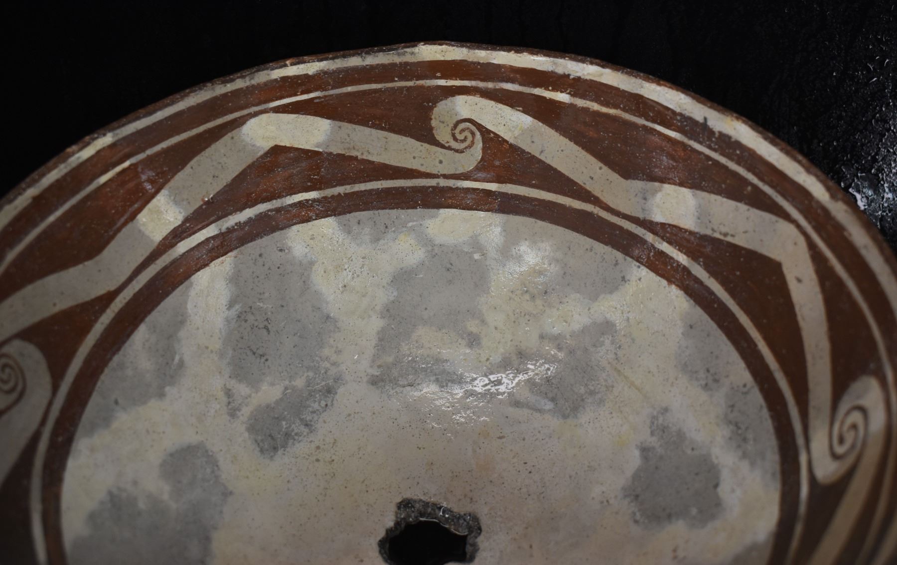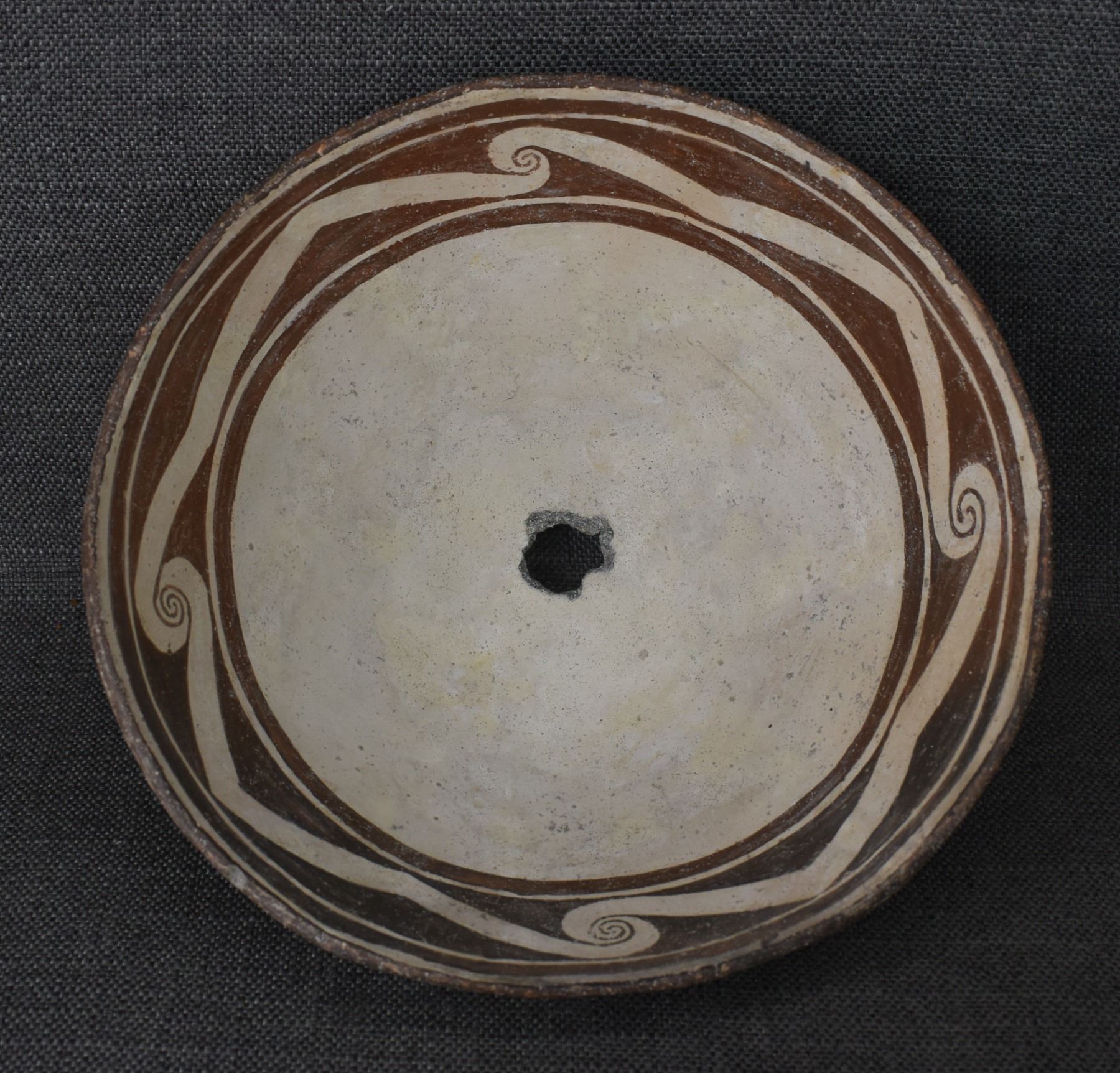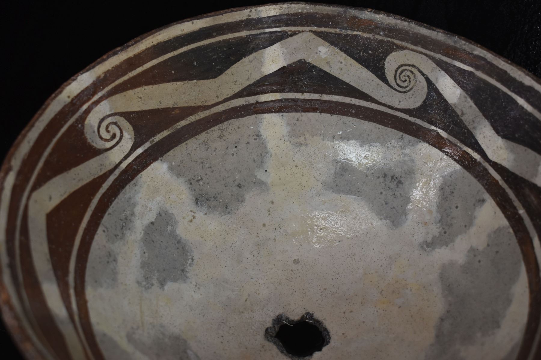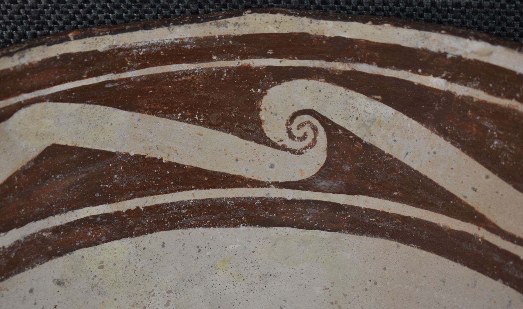 prehistoric Mimbres, hand coiled with black on white painted design 4.5" x 10", has restoration