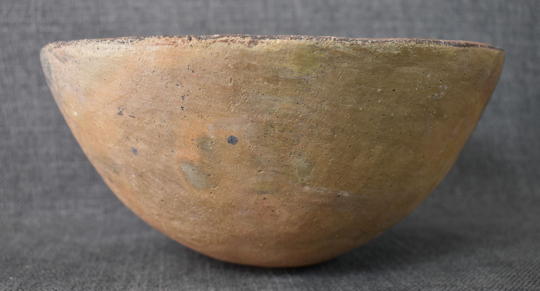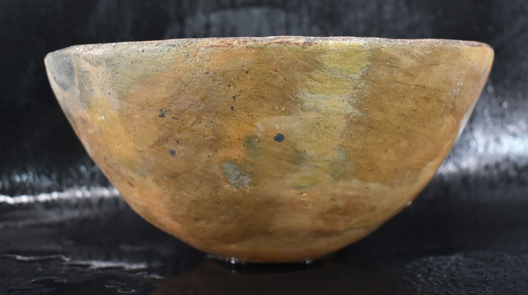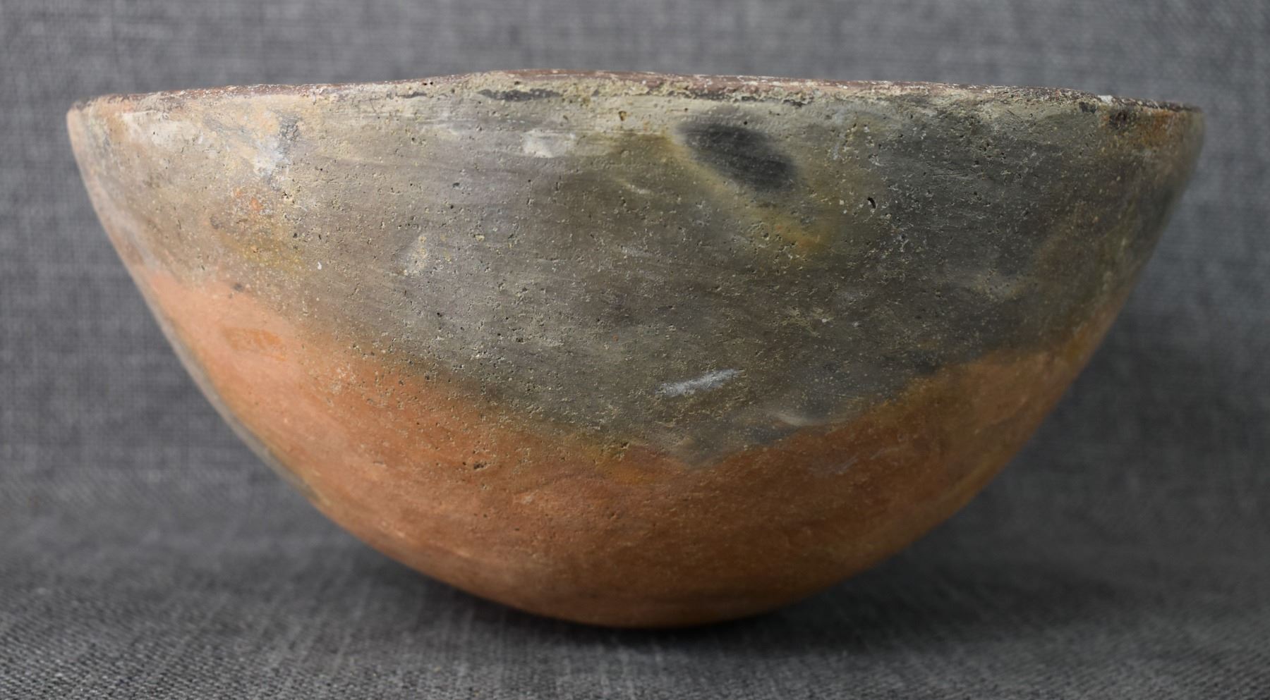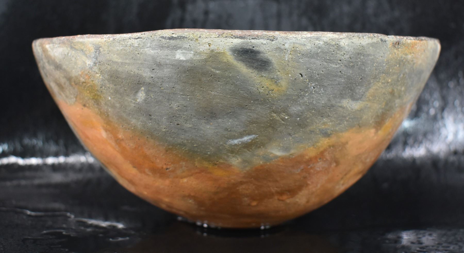 prehistoric Mimbres, hand coiled with black on white painted design 4.5" x 10", has restoration