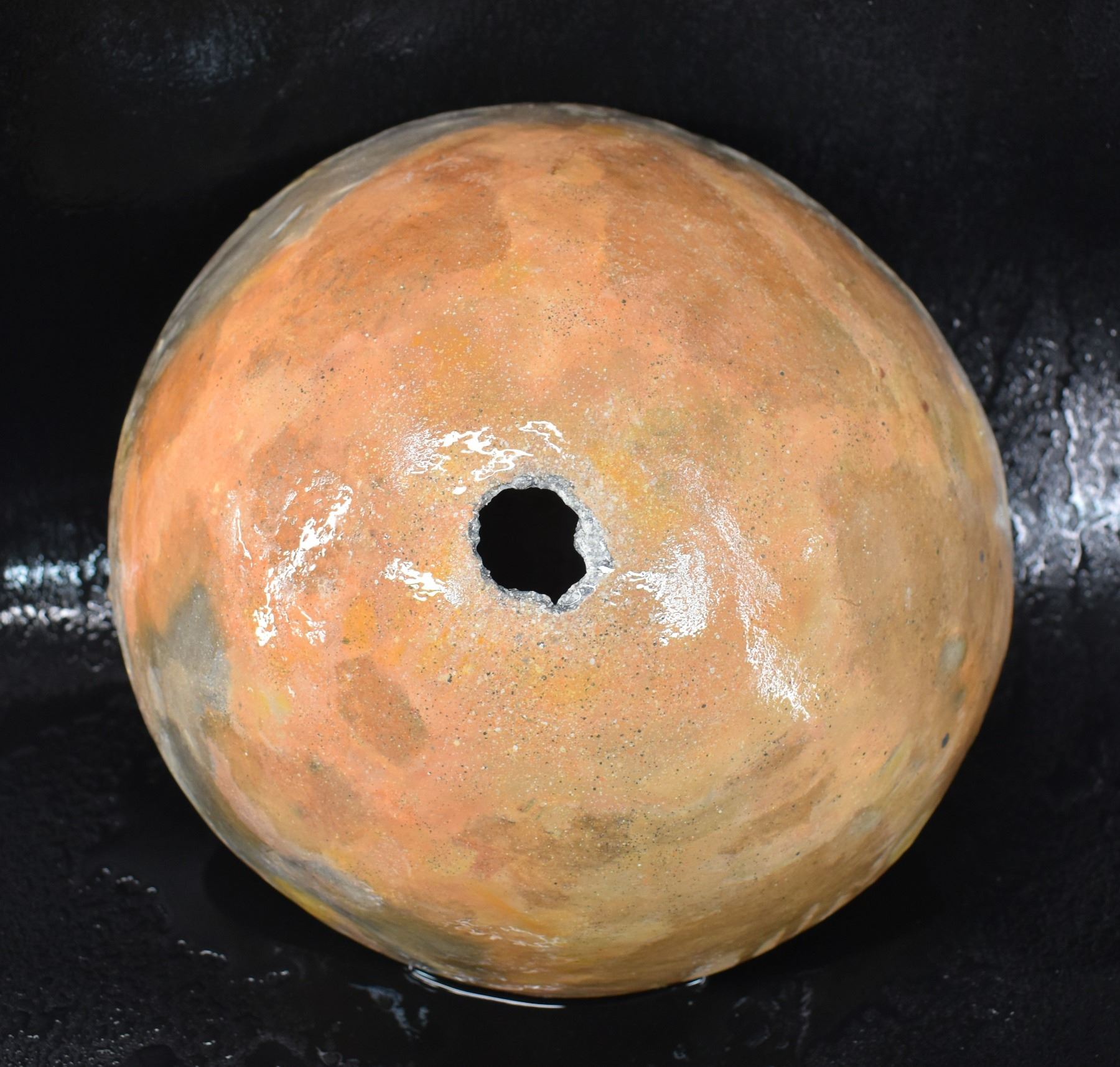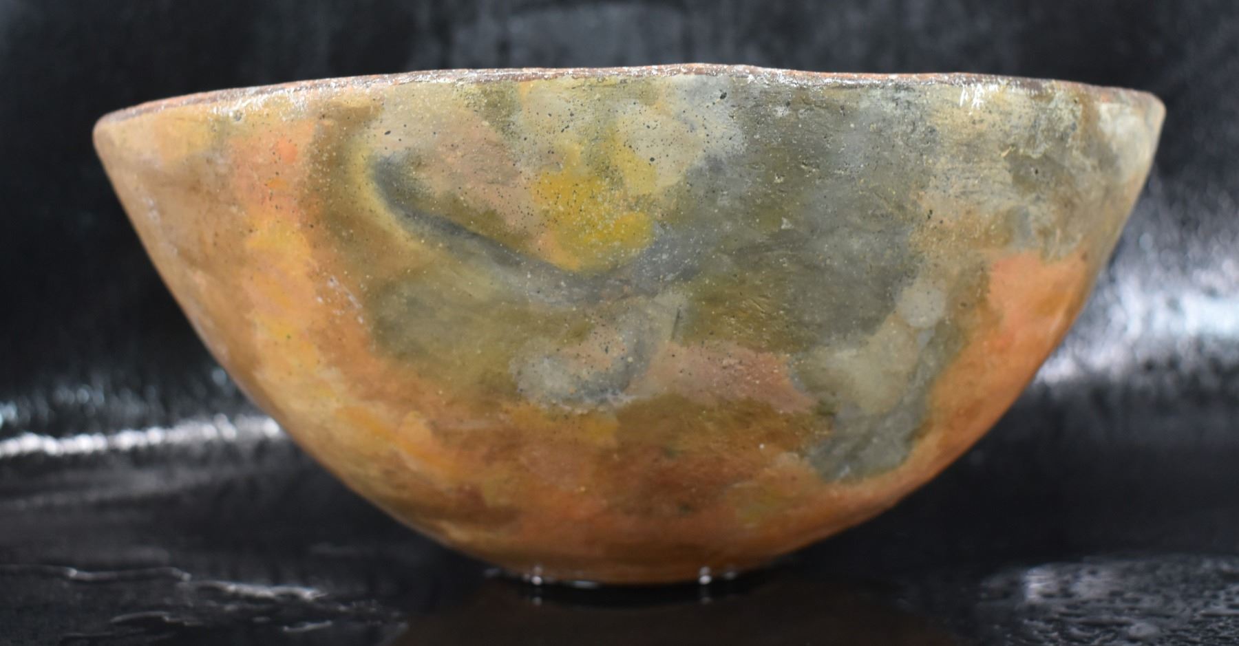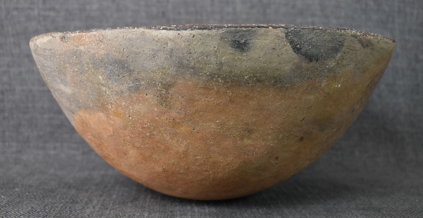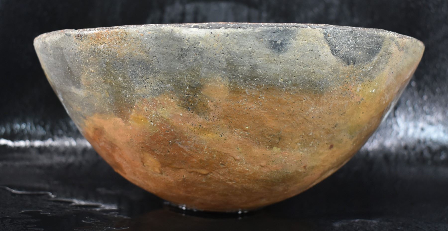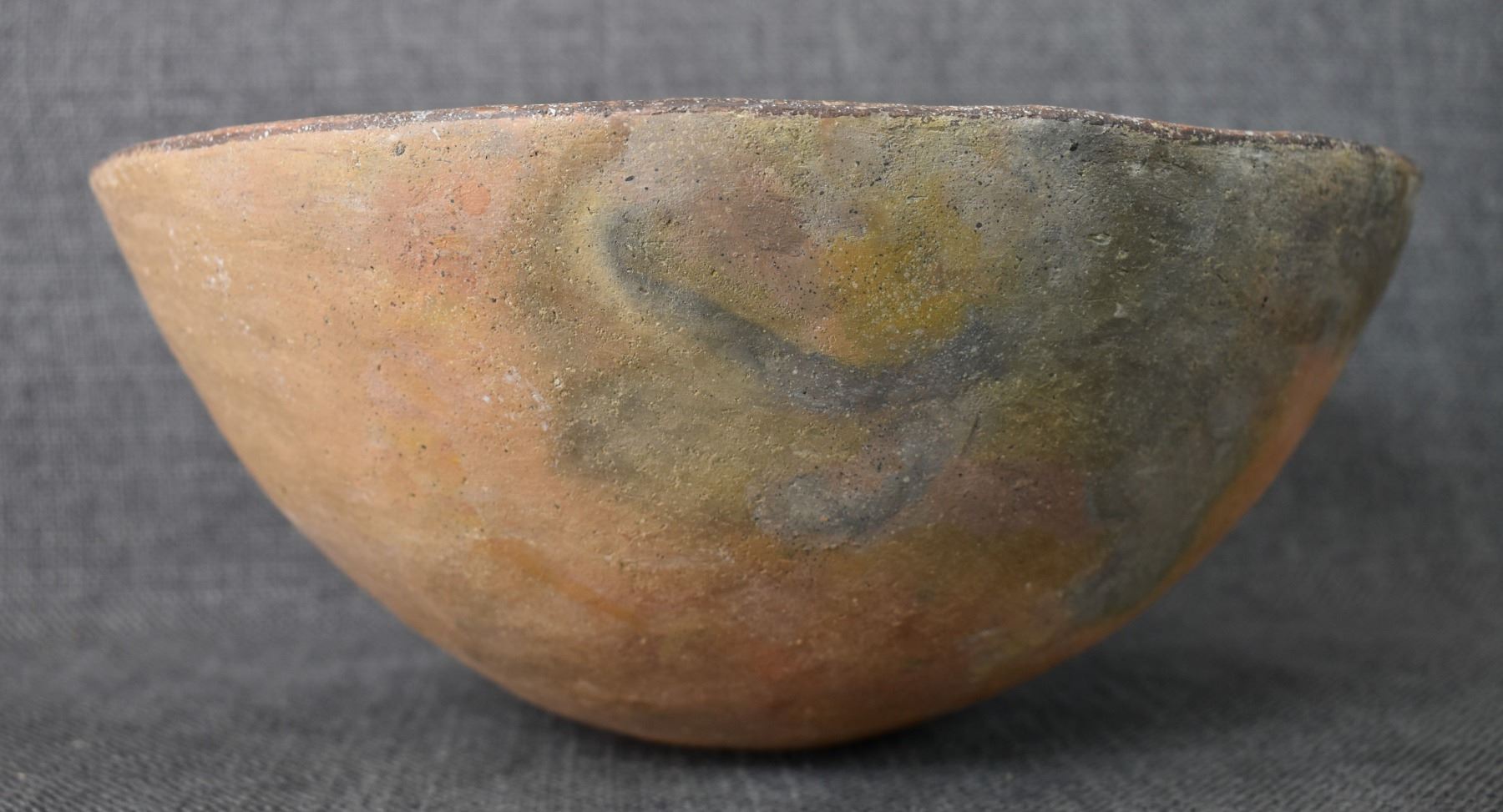 prehistoric Mimbres, hand coiled with black on white painted design 4.5" x 10", has restoration