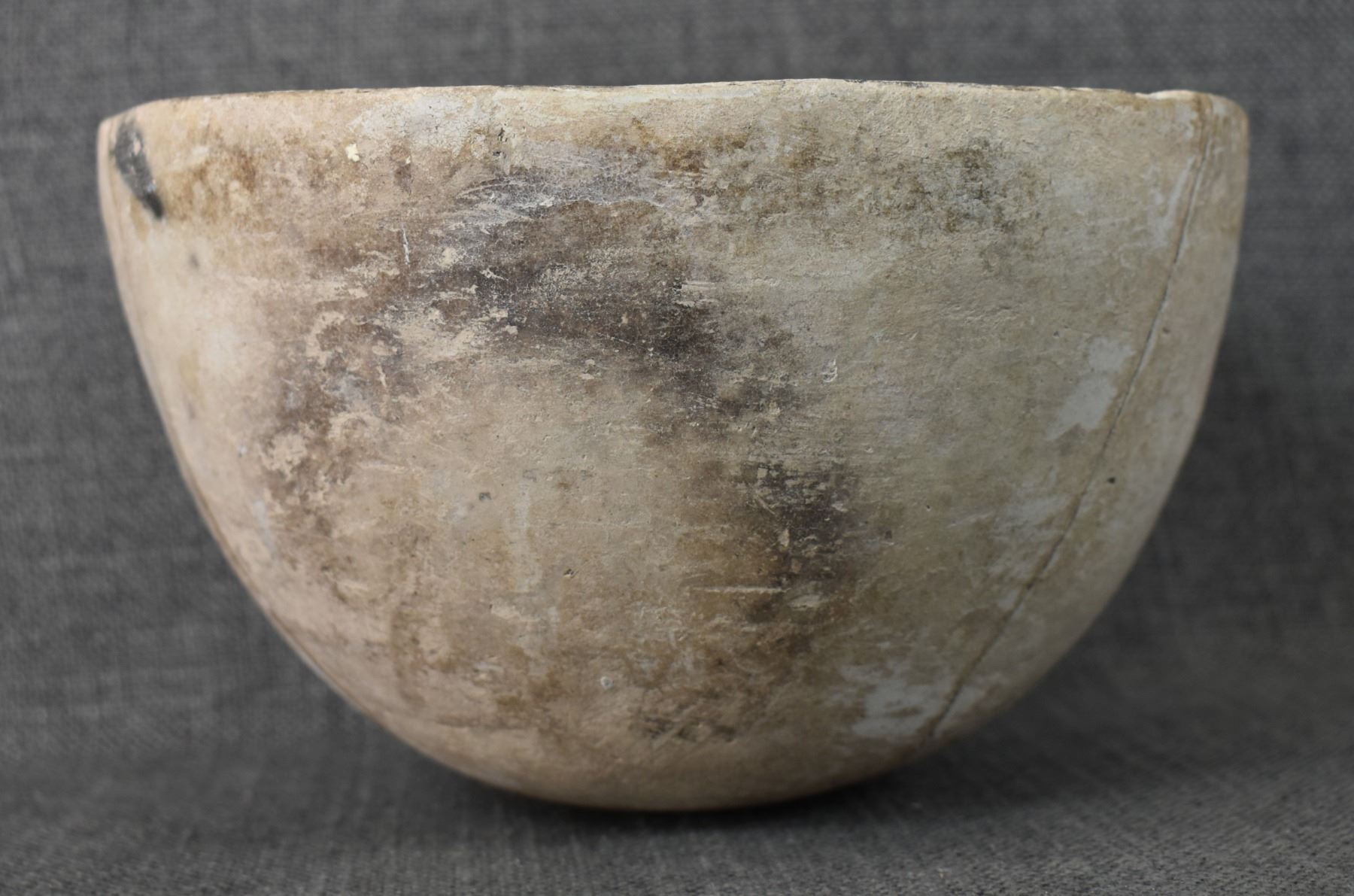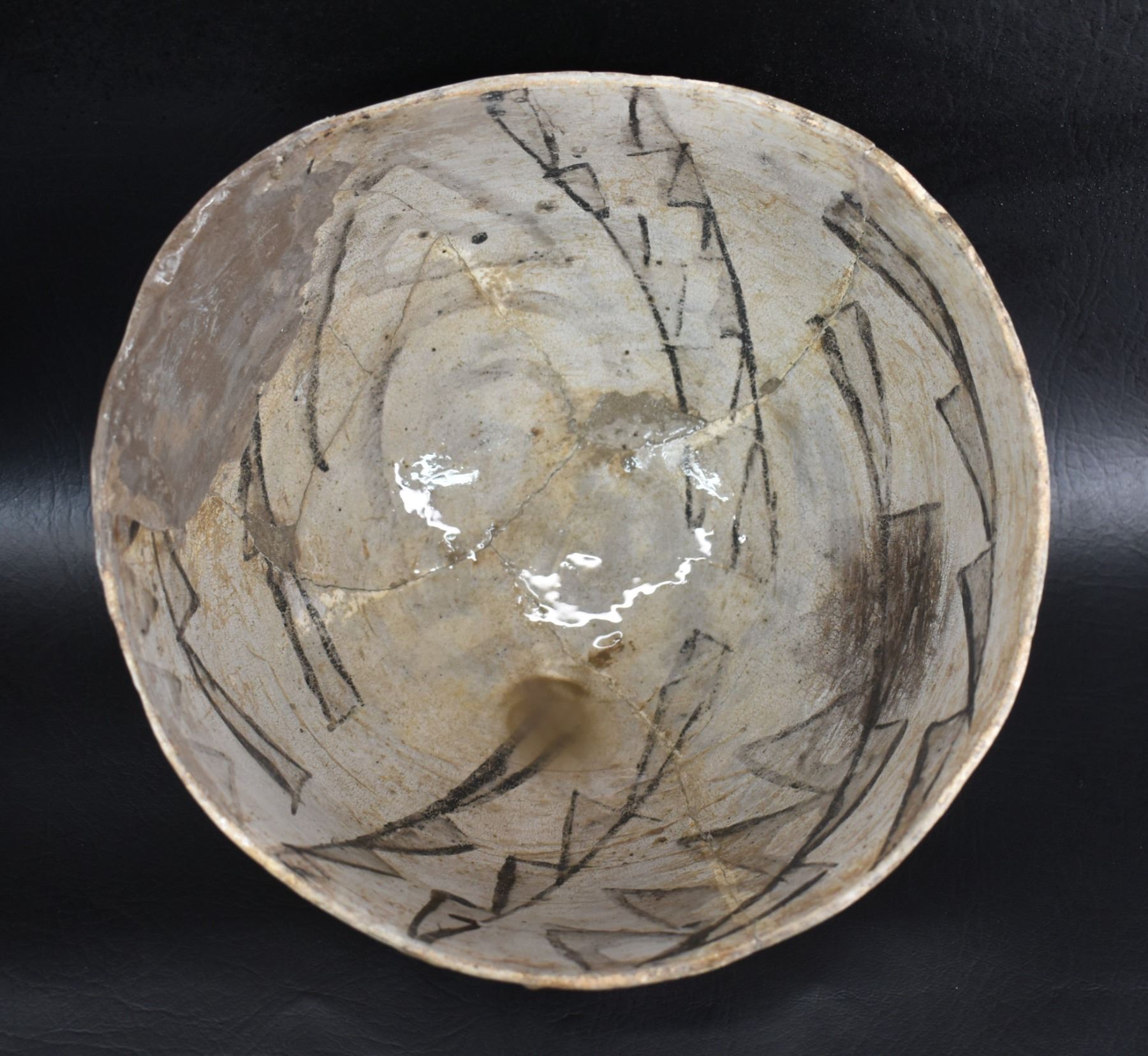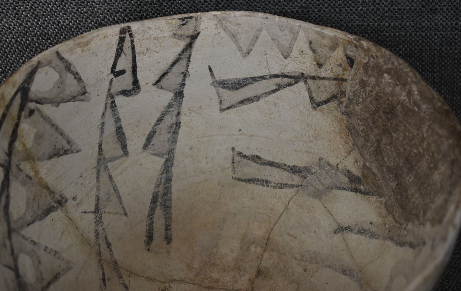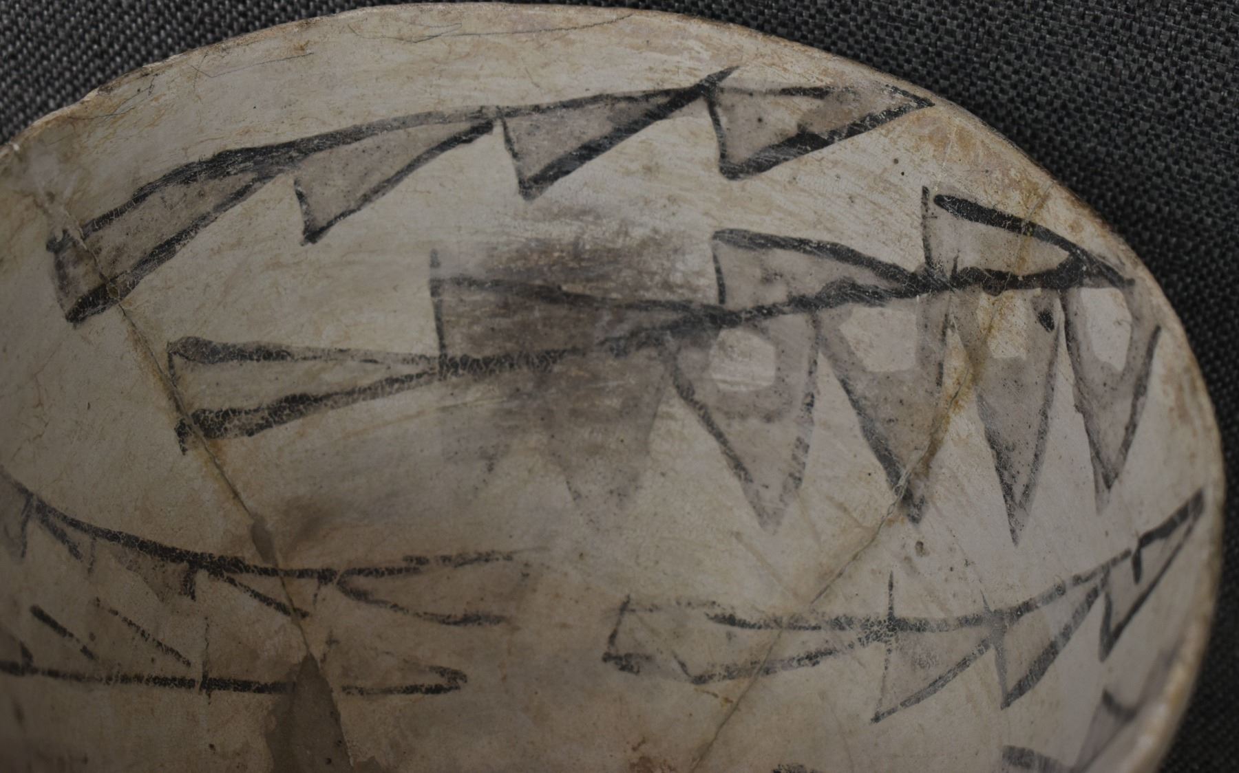 prehistoric anasazi, hand coiled with black on white painted design. 4.75" x 8.5" has restoration