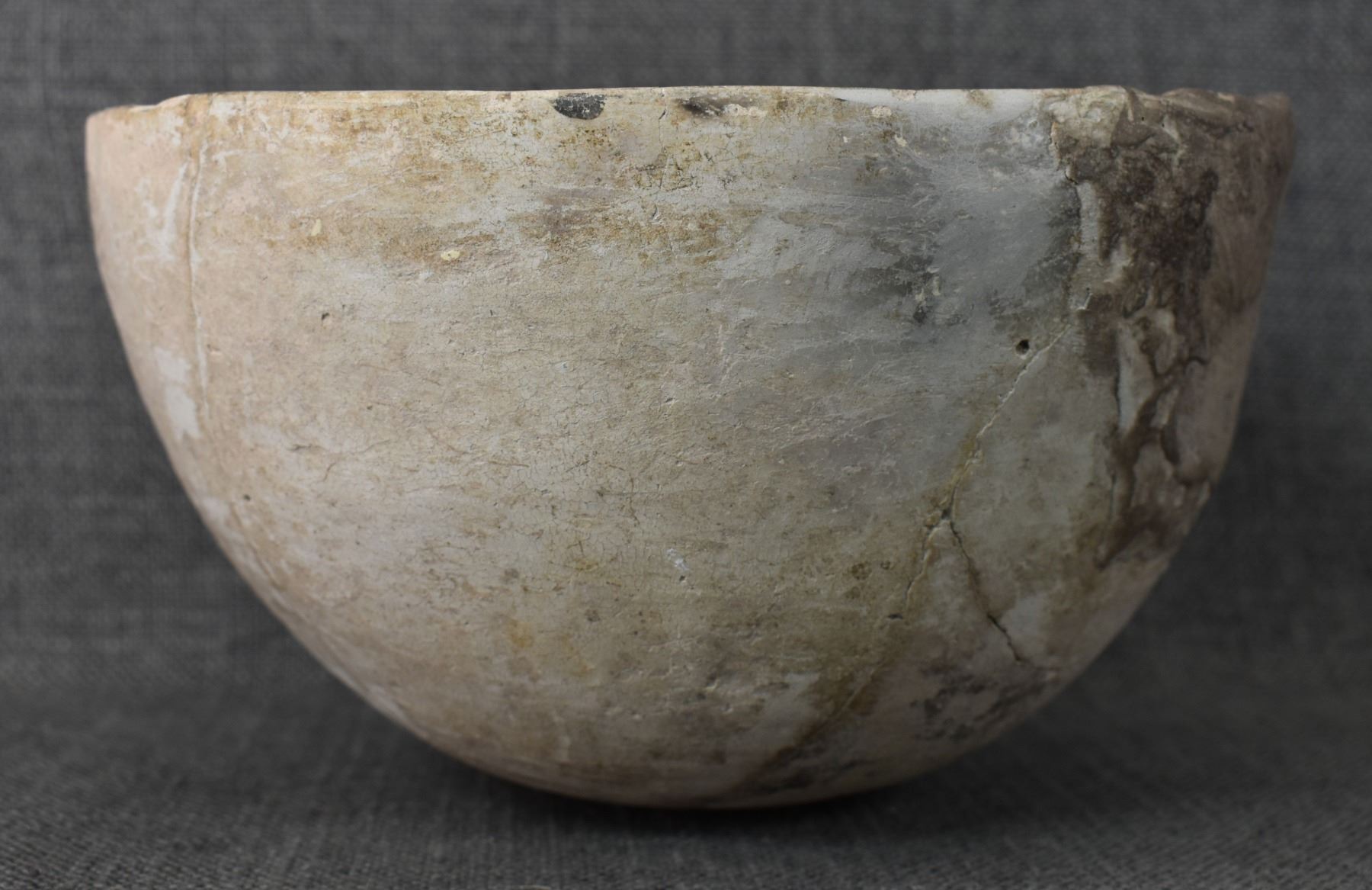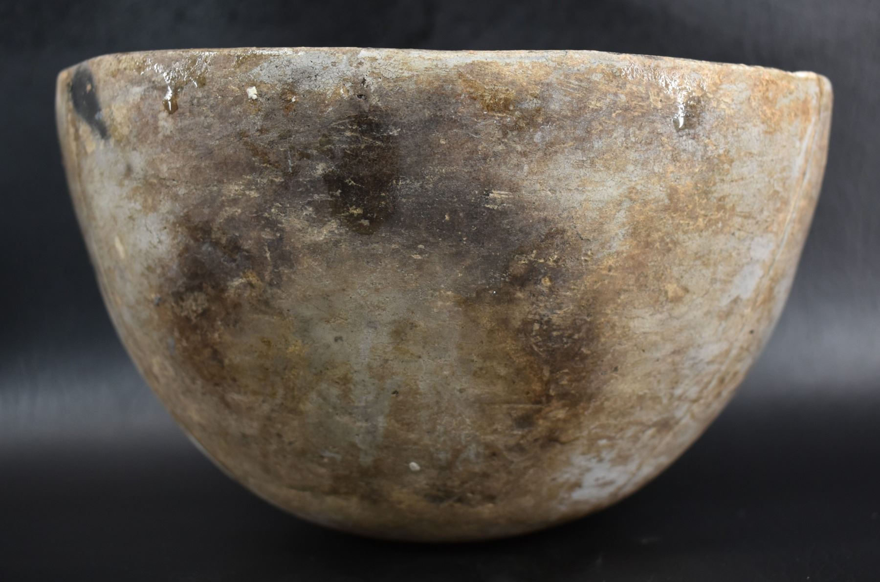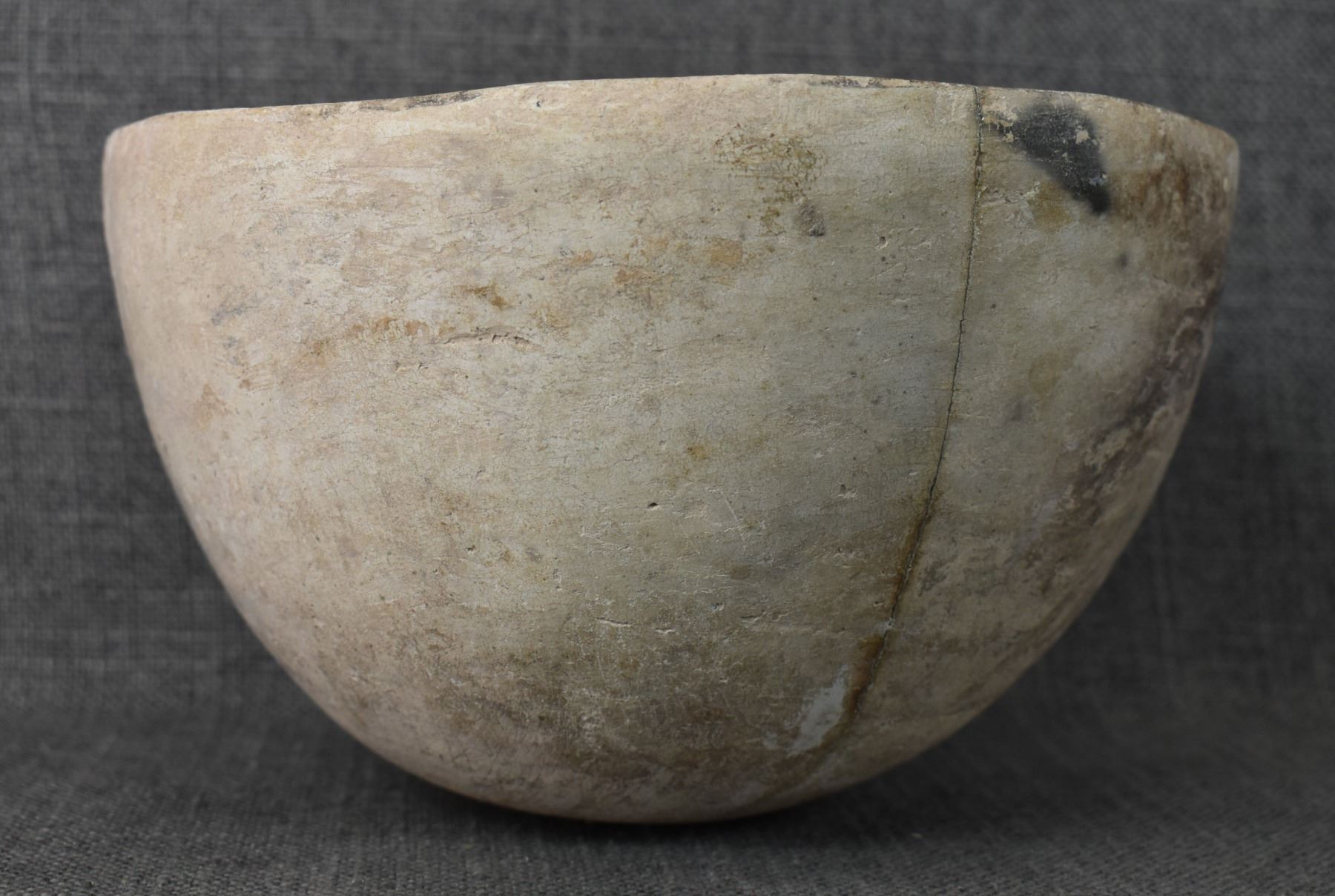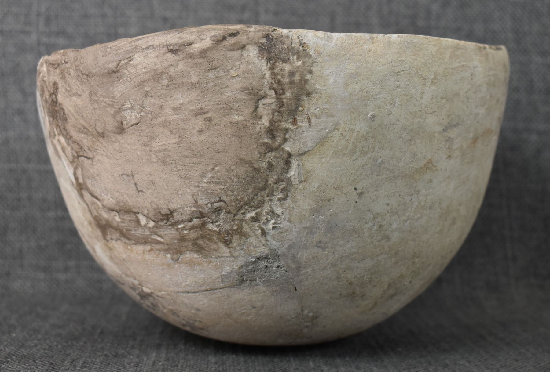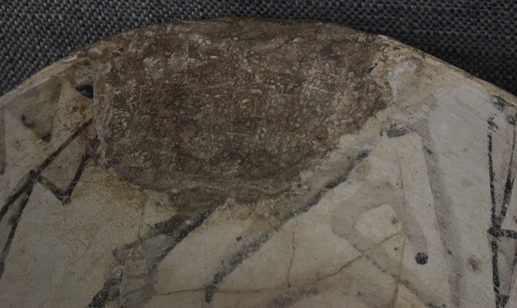 prehistoric anasazi, hand coiled with black on white painted design. 4.75" x 8.5" has restoration