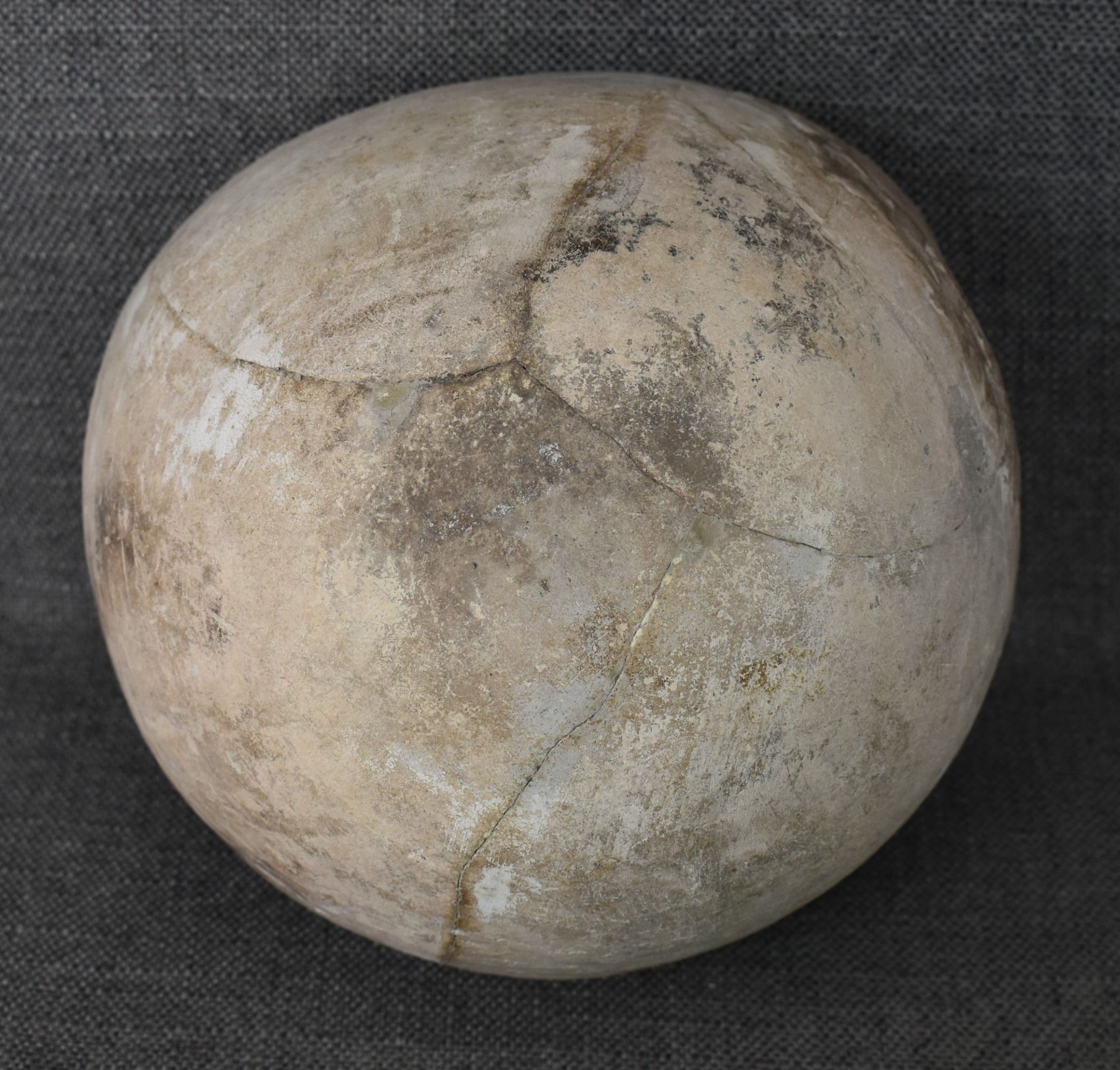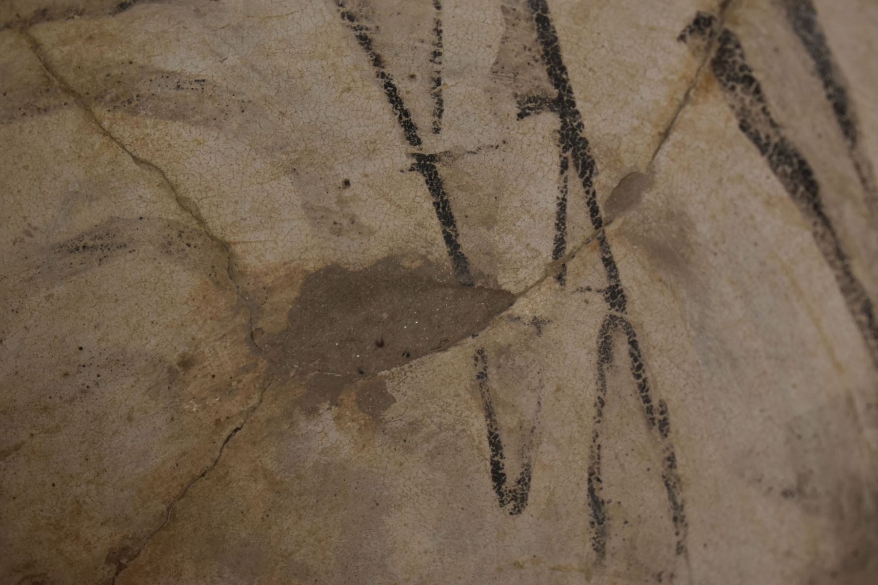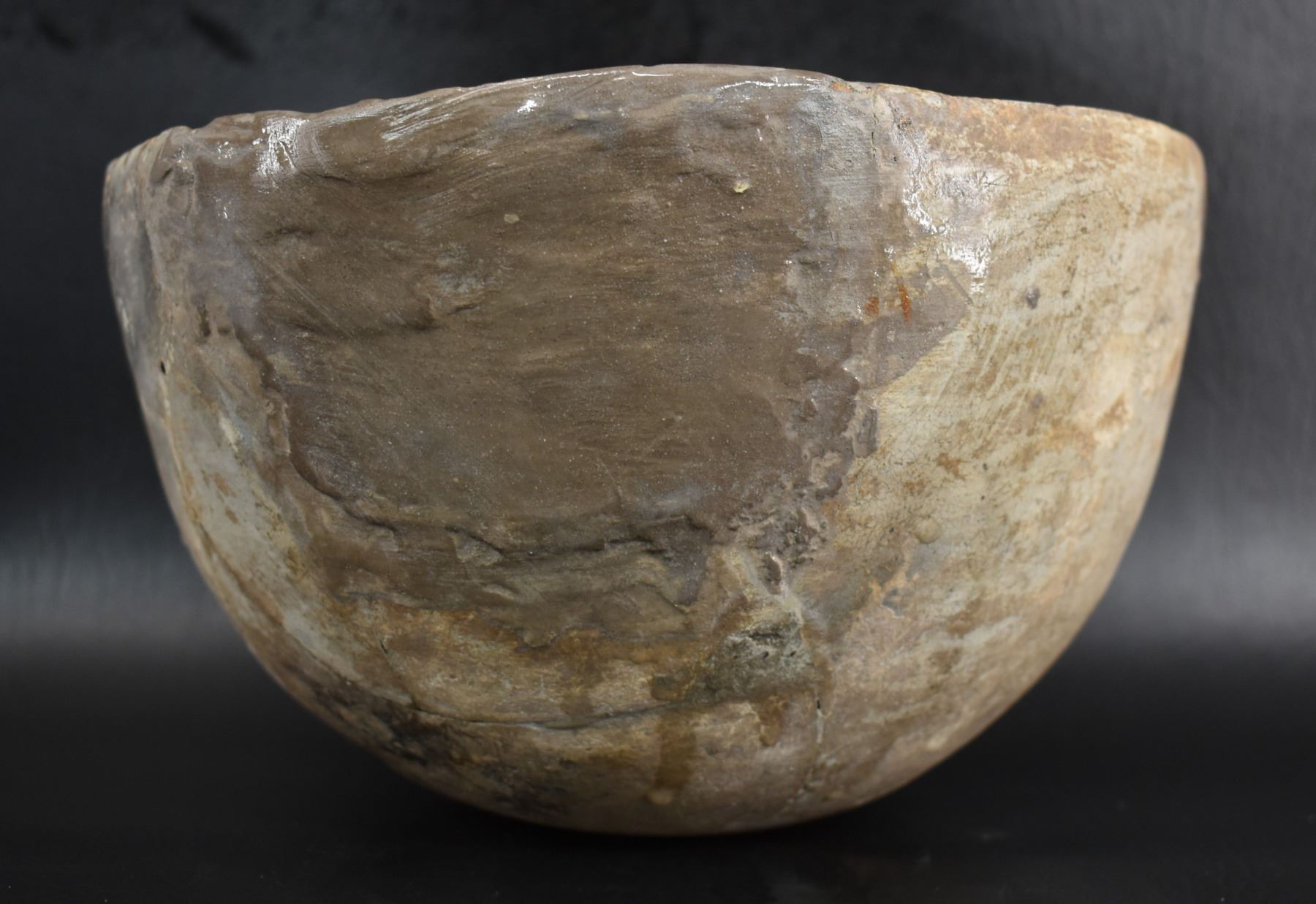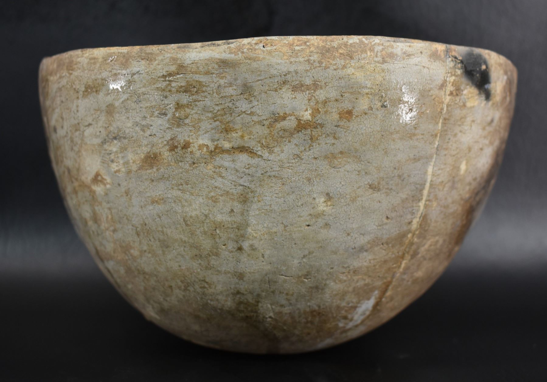prehistoric anasazi, hand coiled with black on white painted design. 4.75" x 8.5" has restoration