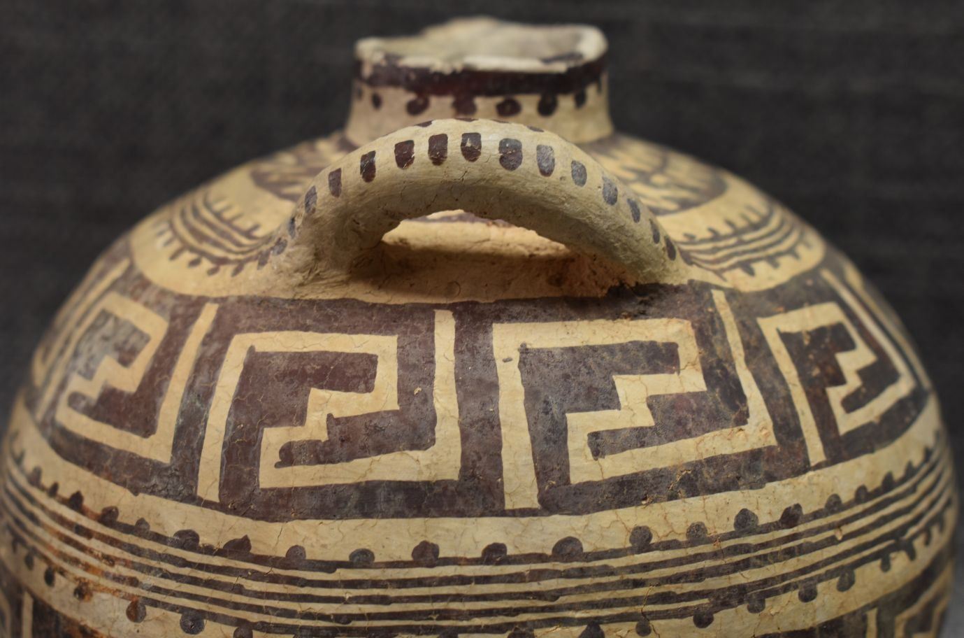 prehistoric Anasazi, hand coiled with black on white painted geometric design 4.5" x 5" as found condition