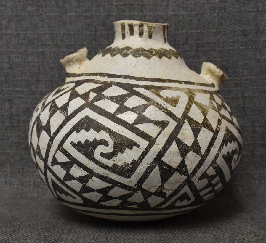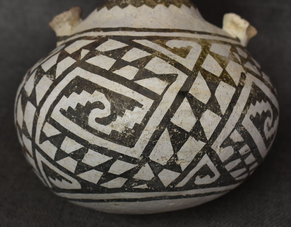 Prehistoric Anasazi. Hand coiled and painted black on white design. Pottery canteen. 6'' x 6'' as found condition