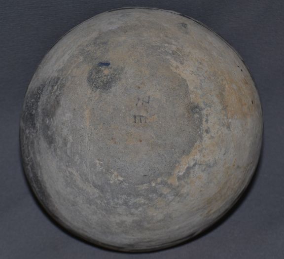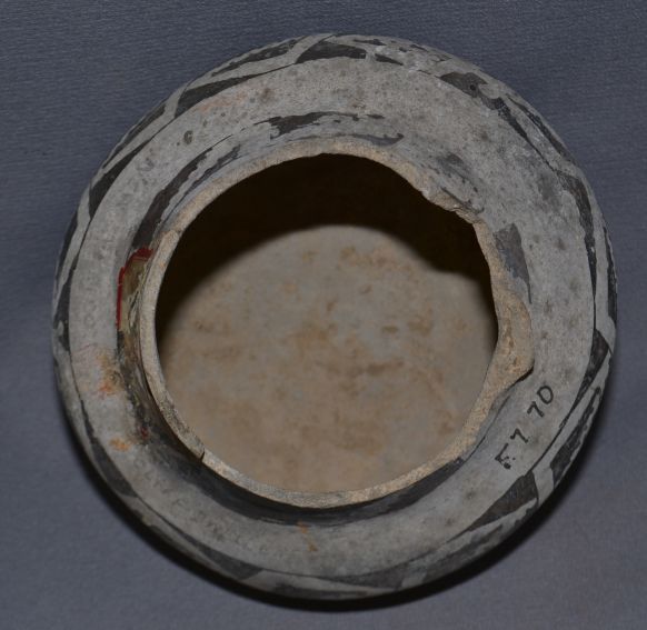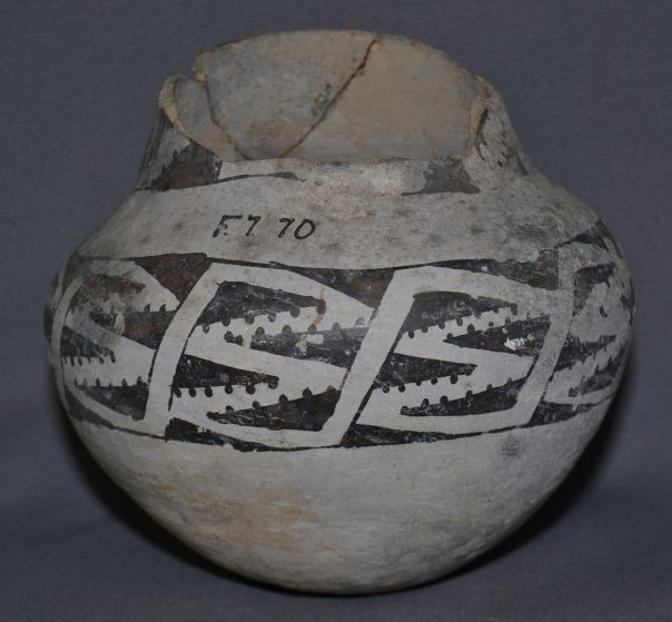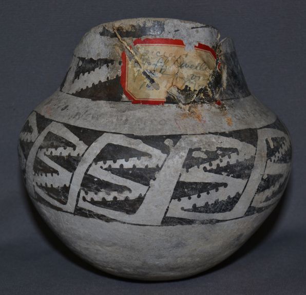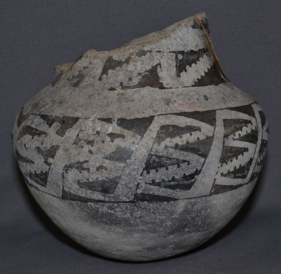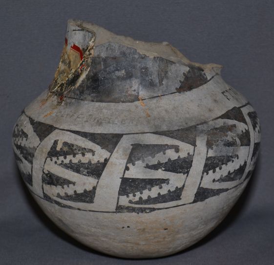 prehistoric black and white painted design has been broken and glued with collection number 6.5" x 7"
